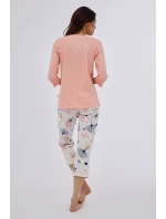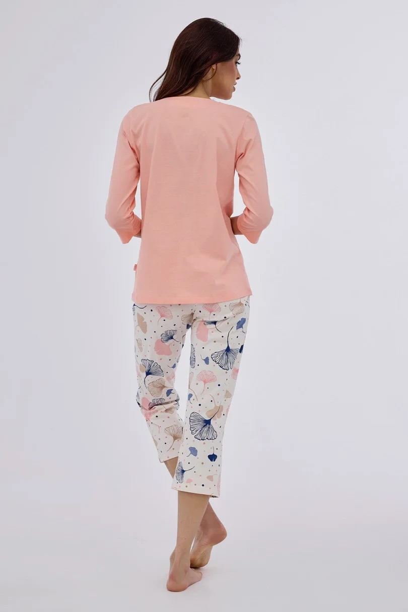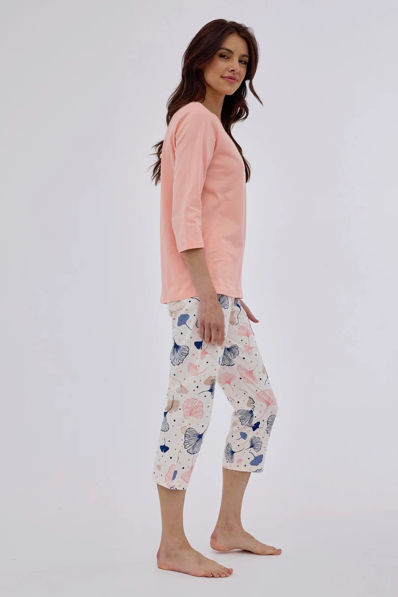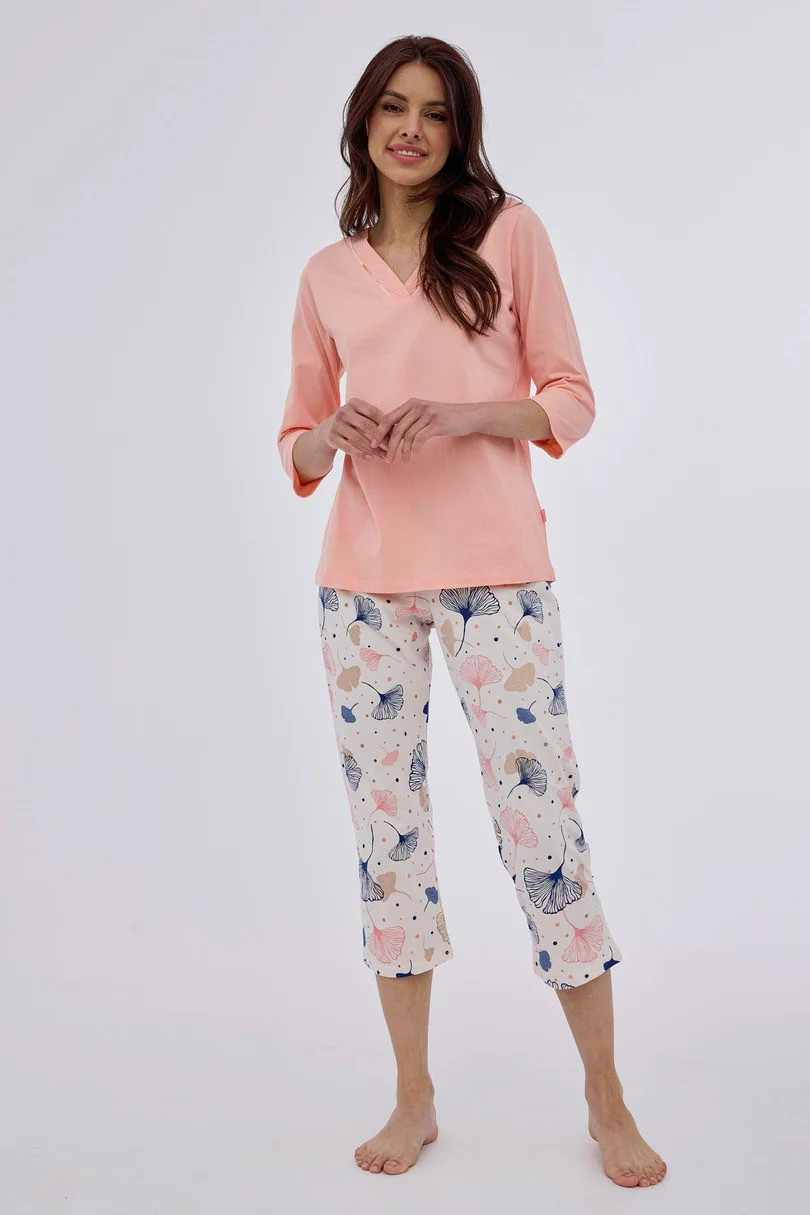 Dámské pyžamo s 3/4 rukávy, vyrobené z pevné bavlny, Výstřih, 3/4 vzorované kalhoty do kompletu. Baleno v krabici.
