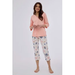 Dámské pyžamo s 3/4 rukávy, z pevné bavlny, s výstřihem do V, k sadě vzorované kalhoty 3/4. Baleno v krabici.