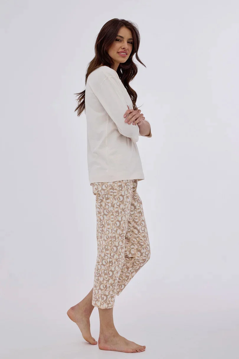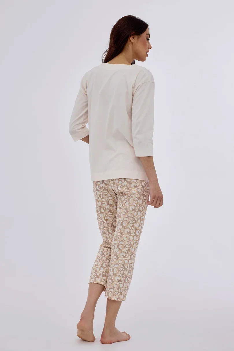 Dámské pyžamo s 3/4 rukávy, z pevné bavlny, výstřih do V, 3/4 vzorované kalhoty, ozdobná mašle v pase. Baleno v krabici.