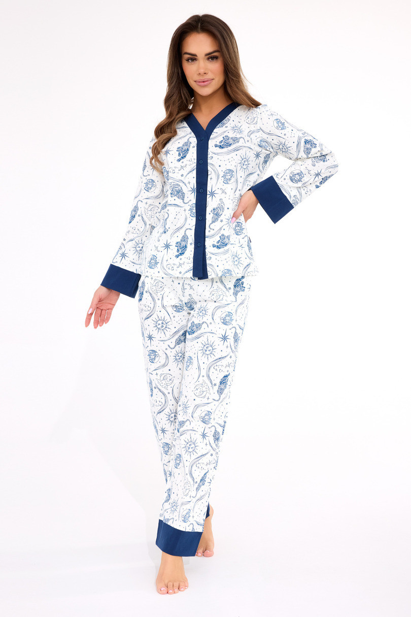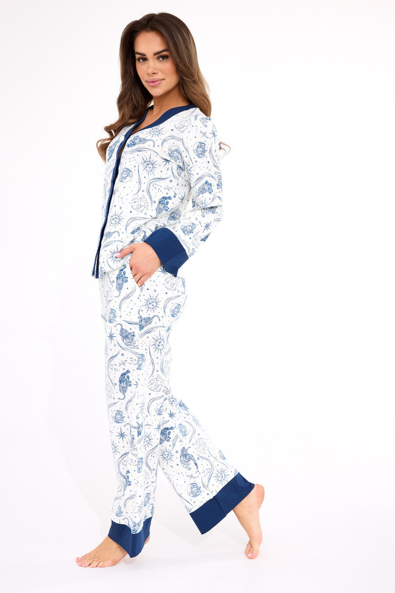 Piżama damska AMBER DR 514/443 to stylowy i komfortowy komplet idealny na każdą porę roku. Wykonana w 100% z miękkiej, oddychającej bawełny, zapewnia wygodę podczas snu i relaksu w domu. Rozpinana bluzka z długim rękawem wykonana z wzorzystej tkaniny prezentuje się kobieco i elegancko. Do kompletu dołączone są długie spodnie z prostymi nogawkami i praktycznymi kieszeniami, które gwarantują pełną swobodę ruchu. Piżama zapakowana w estetyczne pudełko – doskonały pomysł na prezent.