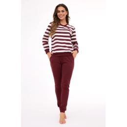 Dámské pyžamo DR 635/468 MOLLY 3 je dokonalou kombinací pohodlí a módního designu. Je vyrobeno ze 100% měkké, prodyšné bavlny a zajišťuje pohodlí a volnost pohybu po celou noc. Blůza s dlouhými rukávy a elegantními proužky v odstínech ecru a hnědé dodává soupravě jemný charakter. Kalhoty s dlouhými nohavicemi mají praktické kapsy a nastavitelnou šňůrku v pase pro dokonalé přizpůsobení. Manžety, spodní část blůzy a nohavice jsou zakončeny elastickými manžetami, které zabraňují vyhrnování látky. Pyžamo bude ideální pro spánek i večerní domácí relaxaci.