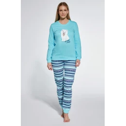 Dámské pyžamo ušité z vysoce kvalitní měkké bavlny. Tričko s dlouhými rukávy, vpředu zdobené barevným potiskem. Doplněno dlouhými vzorovanými kalhotami. Výstřih, manžety a spodní část nohavic košile jsou zakončeny pohodlným žebrovaným lemem. Pyžamo zabalené v krabici.