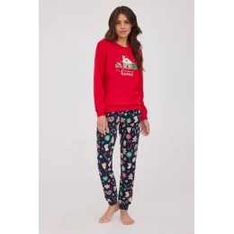 Dámské pyžamo z měkké bavlny, tričko s dlouhým rukávem a barevným potiskem na přední straně, dlouhé vzorované kalhoty s výstřihem, manžetami, lemem trička a nohavicemi s pohodlnou šňůrkou v pase. Pyžamo je baleno v krabici.
