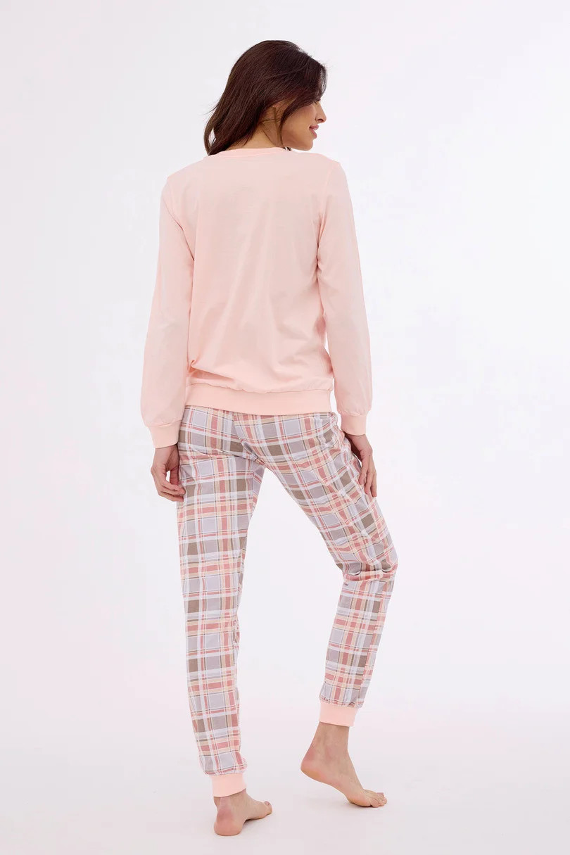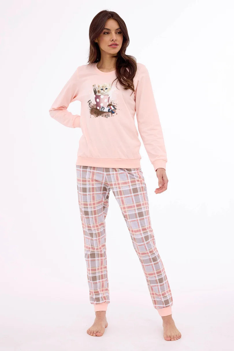 Dámské pyžamo z kvalitní měkké bavlny, tričko s dlouhým rukávem a barevným potiskem na přední straně, dlouhé kostkované kalhoty s výstřihem, manžetami a spodním lemem s pohodlnou šňůrkou v pase. Pyžamo je baleno v krabici.