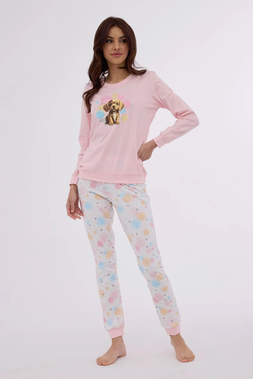 Blůza pyžama má dlouhé rukávy a její přední díl je ozdobený barevným potiskem. Komplet doplňují dlouhé vzorované kalhoty. Pyžamo je zabalené v krabičce.