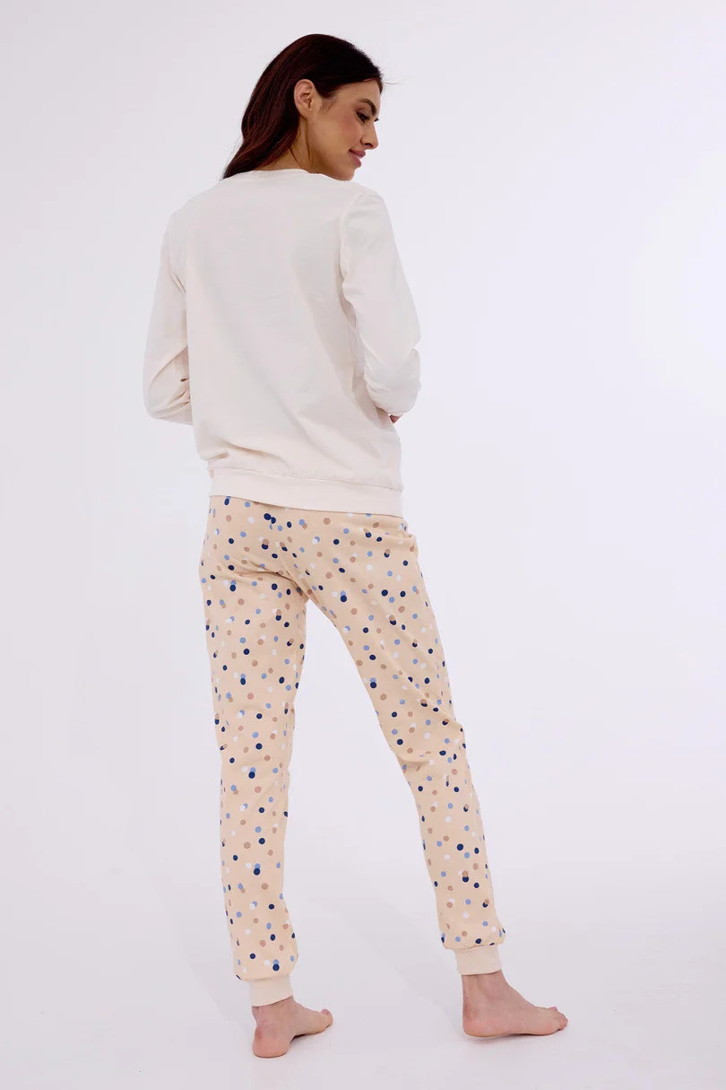 Dámské pyžamo z vysoce kvalitní měkké bavlny. Tričko s dlouhými rukávy, vpředu zdobené barevným potiskem, dlouhé vzorované kalhoty. Výstřih, manžety a spodní část trička a nohavic jsou zakončeny pohodlnou šňůrkou. Pyžamo zabalené v krabici.