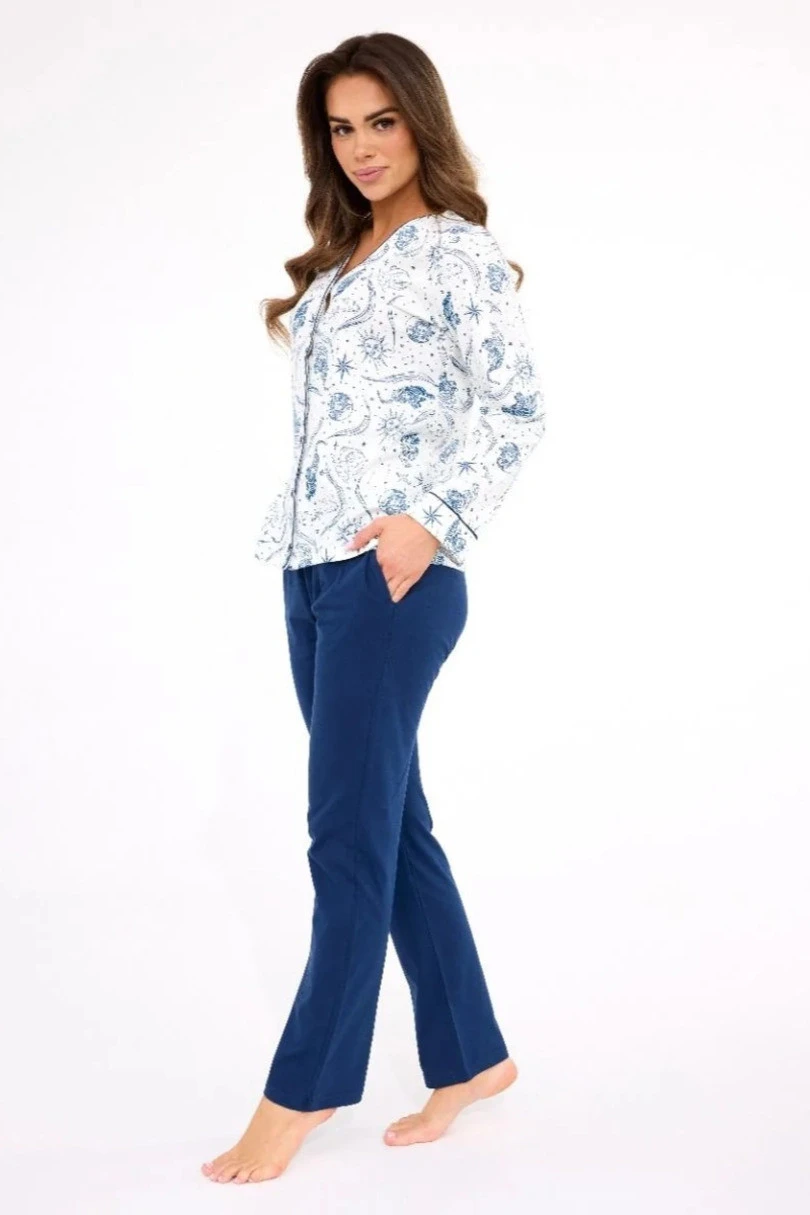 Piżama damska KRISTIN DR 682/445 to idealna propozycja dla kobiet ceniących styl, wygodę i funkcjonalność. Wykonana z wysokiej jakości, wzorzystej bawełny, bluzka z długim rękawem jest rozpinana na guziki – praktyczna i elegancka. Komplet uzupełniają jednolite, długie spodnie z prostymi nogawkami oraz kieszeniami, które dodają wygody na co dzień. Całość uszyta z naturalnej tkaniny zapewniającej komfort termiczny, przewiewność i swobodę ruchów. Piżama zapakowana jest w estetyczne pudełko, co czyni ją również świetnym pomysłem na prezent.