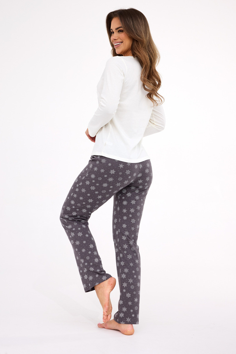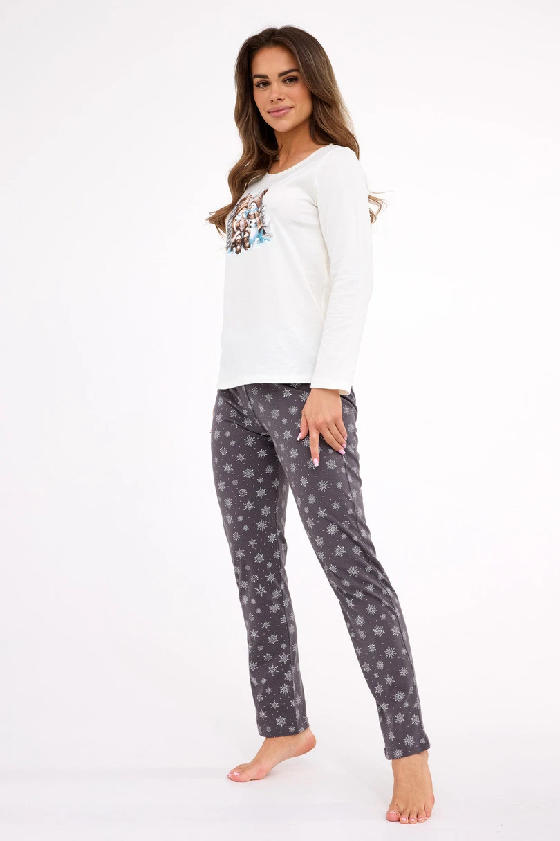 Piżama damska Cornette DR 855/428 Friends to doskonały wybór na zimowe wieczory i świąteczny czas. Wykonana w 100% z miękkiej, naturalnej bawełny, zapewnia wygodę, ciepło i komfortowy sen. Koszulka z długim rękawem ozdobiona została kolorowym nadrukiem z uroczym bałwankiem, który wprowadza radosny, świąteczny klimat. Do zestawu dołączono długie spodnie w świąteczny wzór. Dekolt, mankiety i dół koszulki zakończone są elastycznym ściągaczem, co gwarantuje wygodę i swobodę ruchów. Całość zapakowana w estetyczne pudełko – świetny pomysł na prezent pod choinkę lub na Mikołajki.