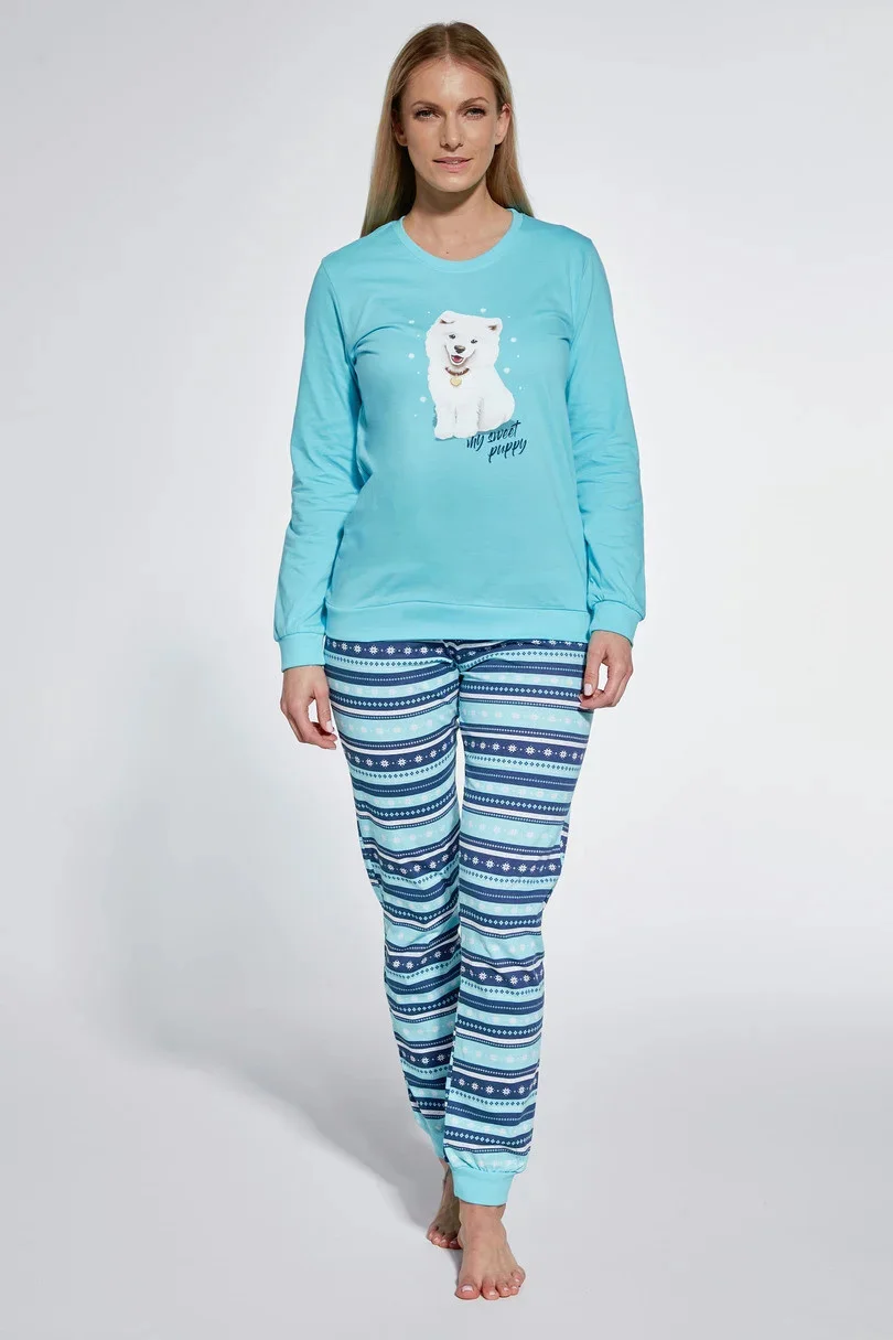 Dámské pyžamo ušité z vysoce kvalitní měkké bavlny. Tričko s dlouhými rukávy, vpředu zdobené barevným potiskem. Doplněno dlouhými vzorovanými kalhotami. Výstřih, manžety a spodní část nohavic košile jsou zakončeny pohodlným žebrovaným lemem. Pyžamo zabalené v krabici.