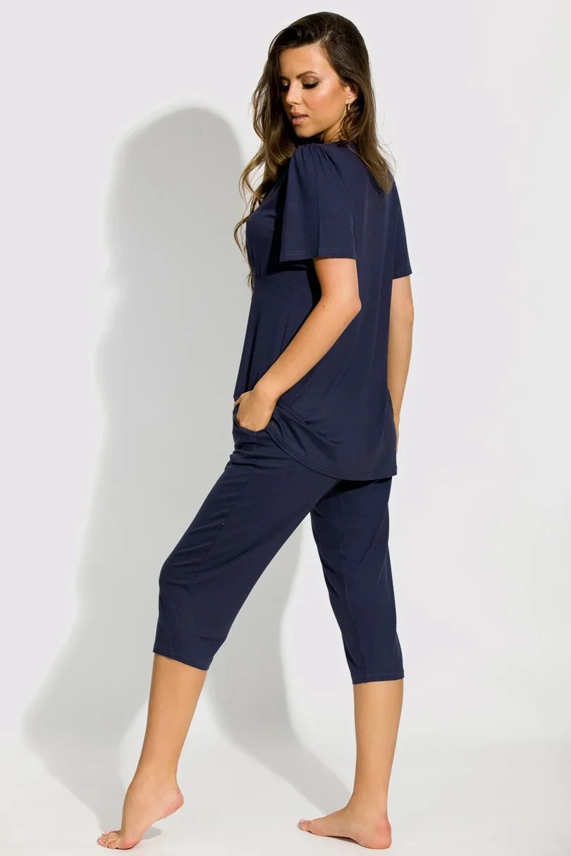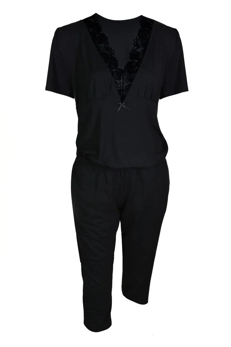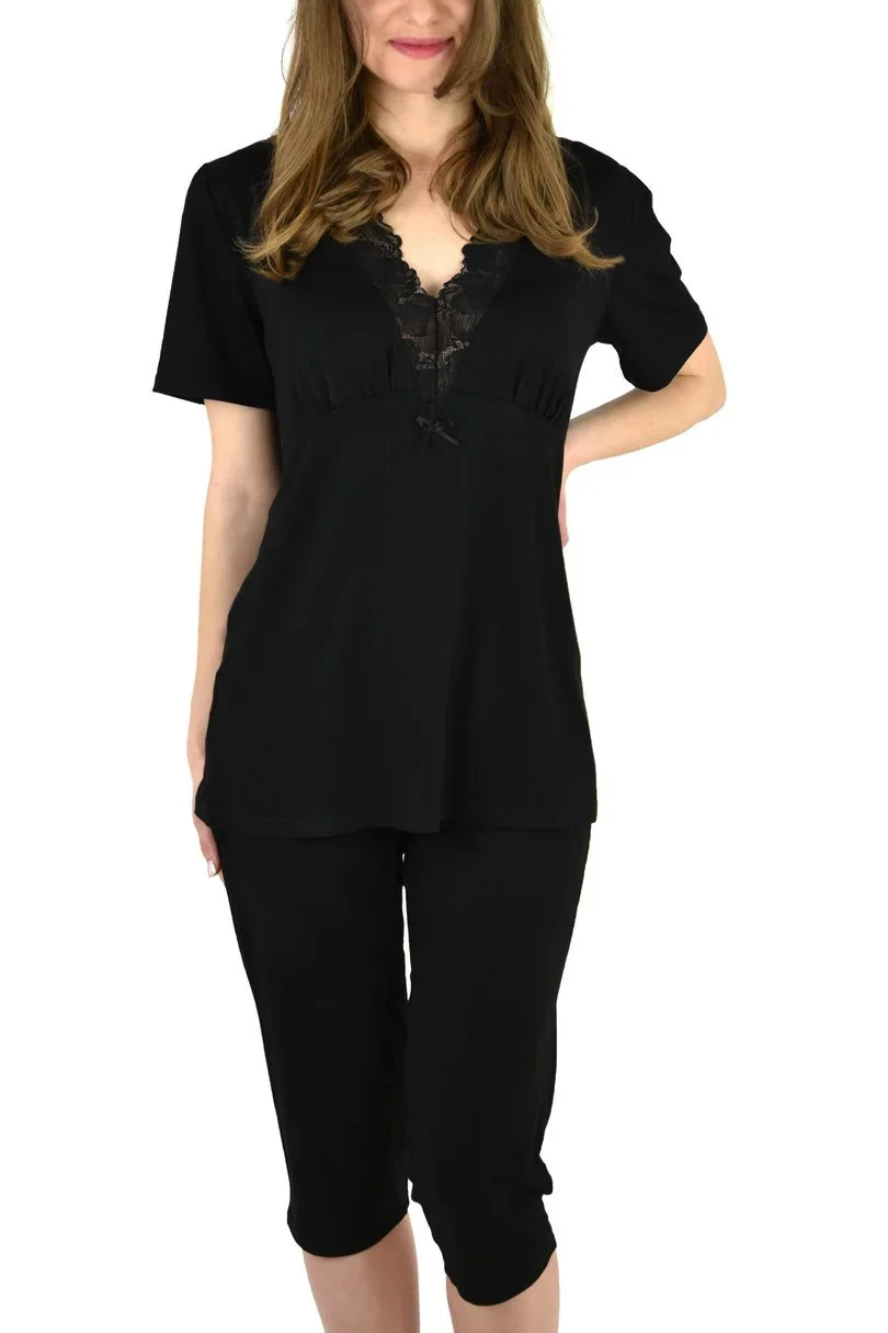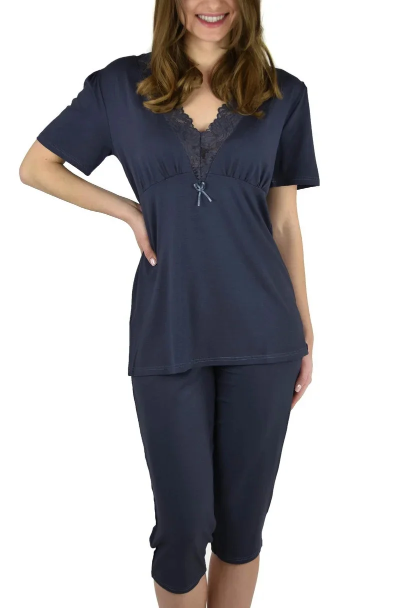 Blůza pyžama má krátké rukávy. Výstřih zdobí krajka. Spodní díl pyžama tvoří hladké 7/8 kalhoty s gumou v pase.