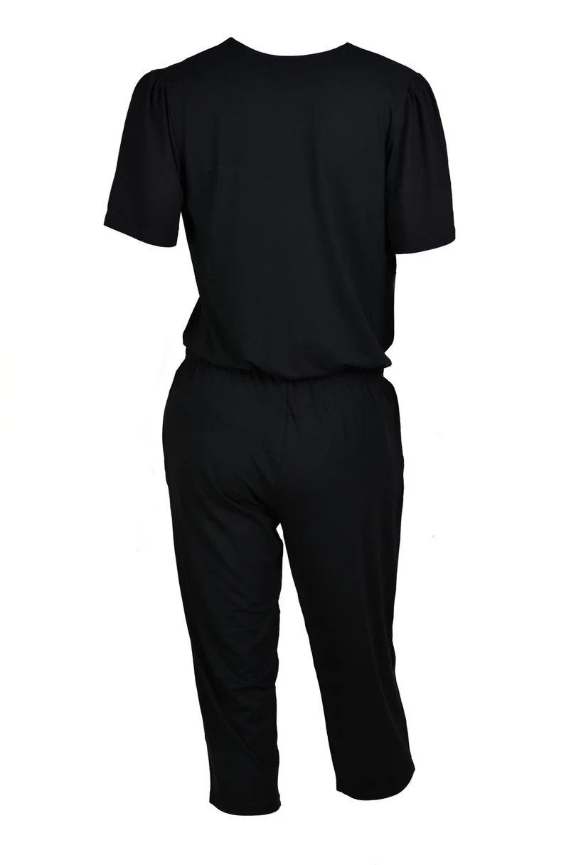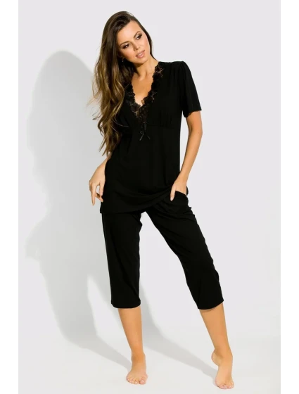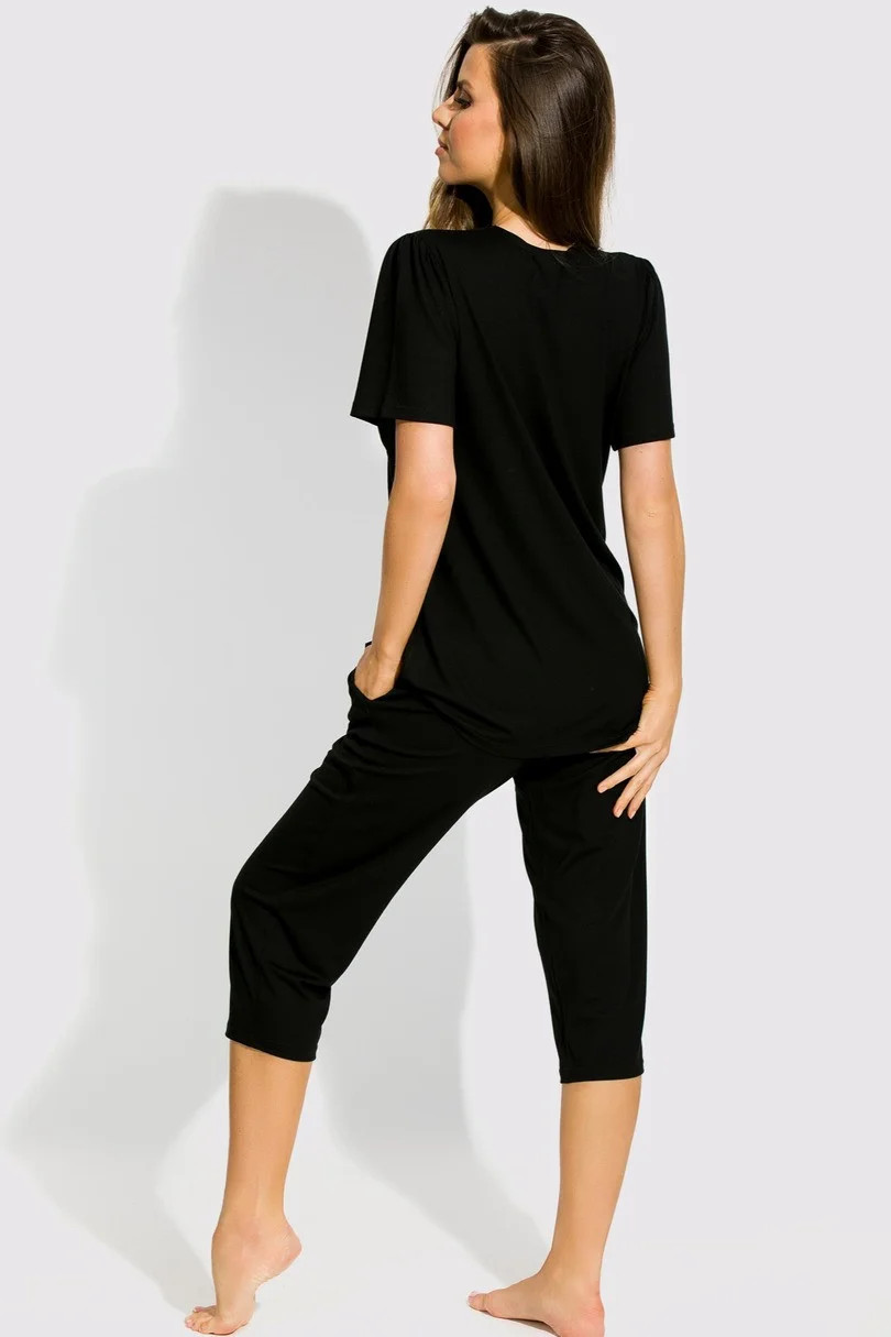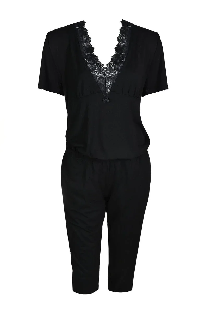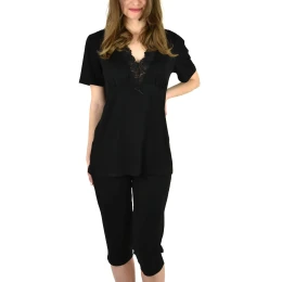 Blůza pyžama má krátké rukávy. Výstřih zdobí krajka. Spodní díl pyžama tvoří hladké 7/8 kalhoty s gumou v pase.