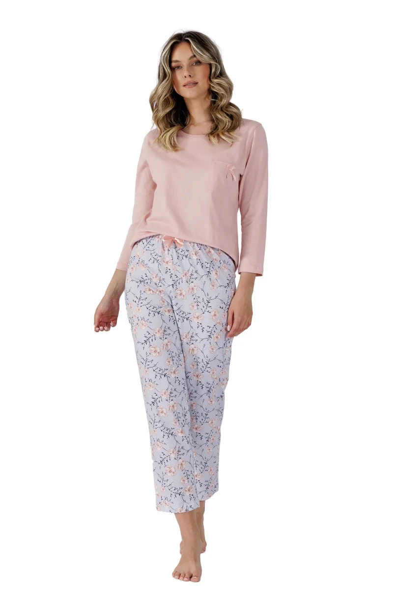 Dámské pyžamo s rukávy v délce 7/8, hladké, s kapsou na prsou. Kalhoty se vzorem v délce 7/8. Ozdobná mašle v pase.