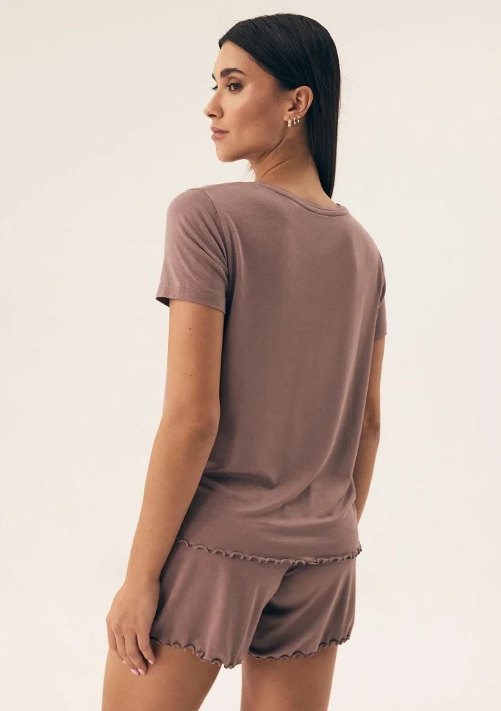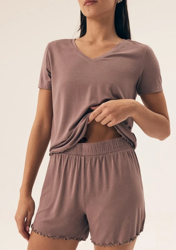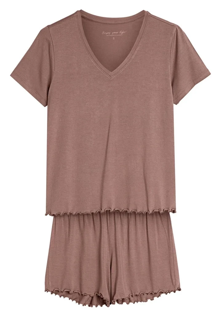 Dámské pyžamo od značky Henderson je skvělou volbou pro pohodlný spánek i domácí lenošení. Pyžamo se skládá z trička s krátkým rukávem a výstřihem do V a šortek, které jsou v pase na širokou pružnou gumu pro maximální komfort. Spodní lem trička i nohaviček šortek je ozdoben jemným vlnkovaným zakončením, které dodává celému kompletu ženský a elegantní vzhled. Díky příjemnému materiálu je pyžamo měkké a pohodlné na nošení.