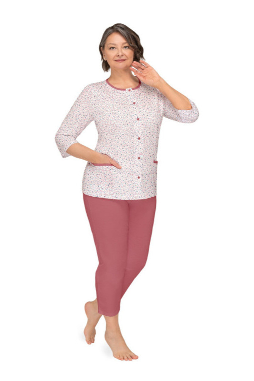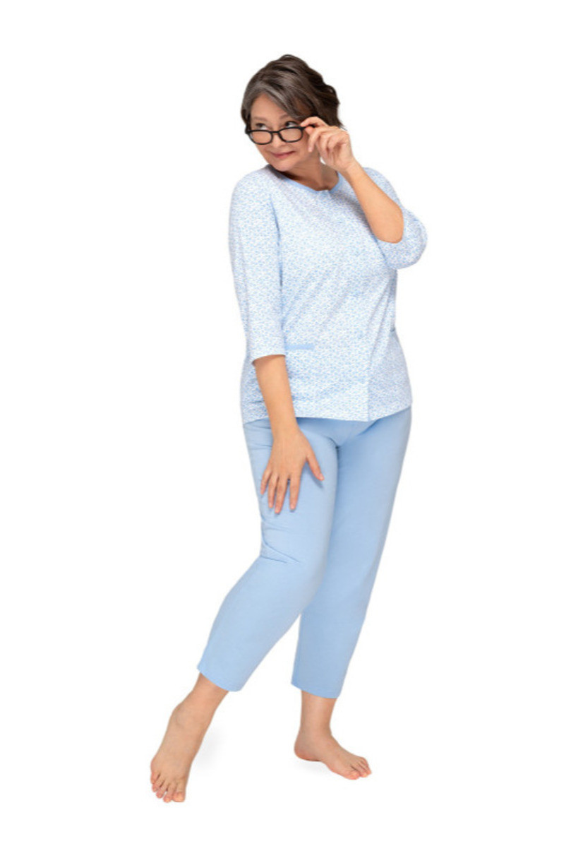 Piżama damska KASIA II 266 to komfortowy komplet stworzony z myślą o kobietach ceniących praktyczne rozwiązania i naturalne materiały. Uszyta z 100% bawełny, jest miękka, przewiewna i przyjazna dla skóry. Bluzka z rękawem 3/4, okrągłym dekoltem i dwiema kieszeniami jest w pełni rozpinana, co sprawia, że świetnie sprawdza się również dla mam karmiących. Spodnie o długości 7/8 z elastyczną gumką w pasie zapewniają wygodne dopasowanie. Polski producent gwarantuje wysoką jakość wykonania.