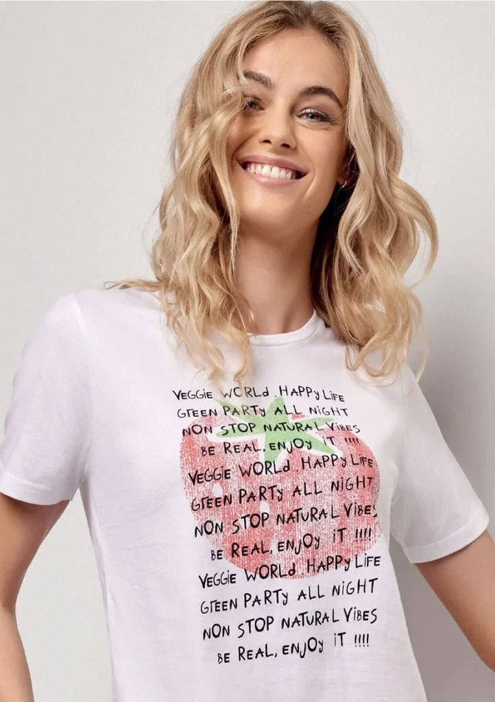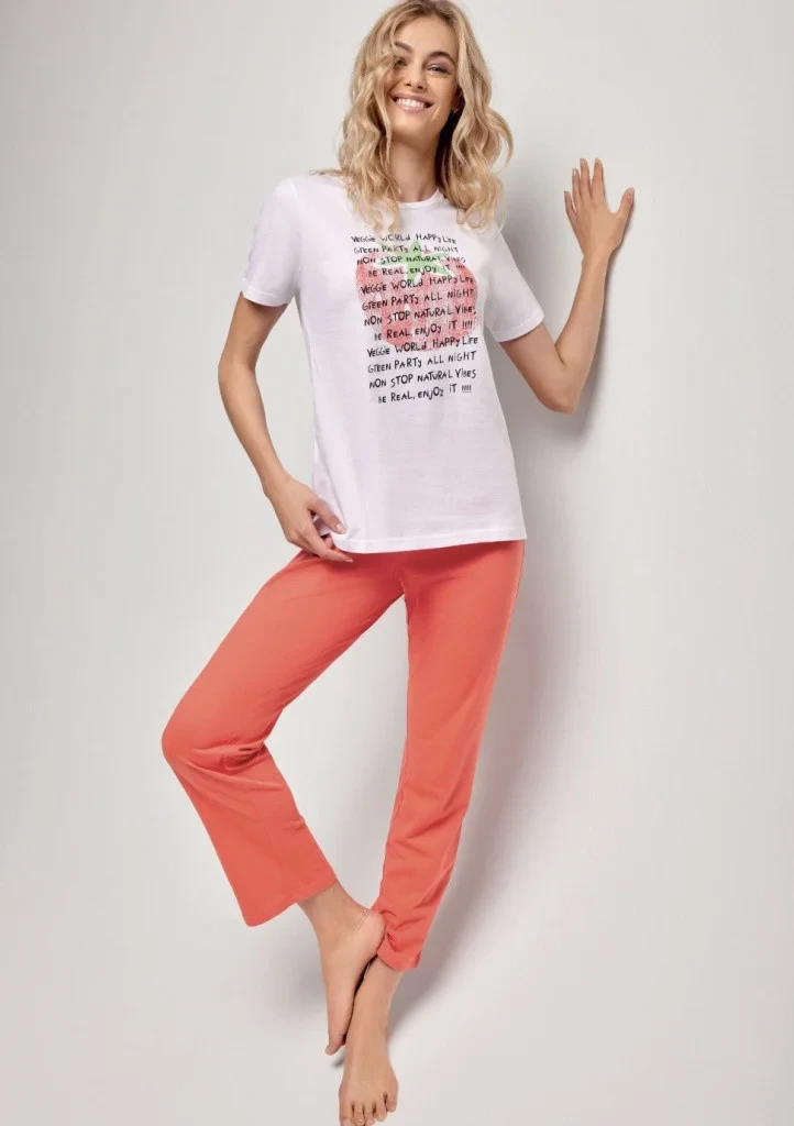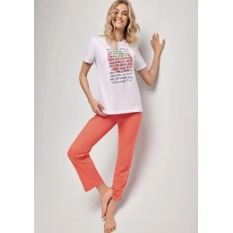 Dámské pyžamo italské značky Infiore. Dvoudílné pyžamo se skládá z trička a kalhot, celé pyžamo je vyrobeno z bavlny, je pružné a volnější. Tričko klasického střihu je úplně hladké, má krátký rukáv, kulatý výstřih a potisk na přední straně. Dlouhé kalhoty v třičtvrťové délce jsou jednoduché, hladké, bez kapes. V pase je pružná guma obšita látkou.