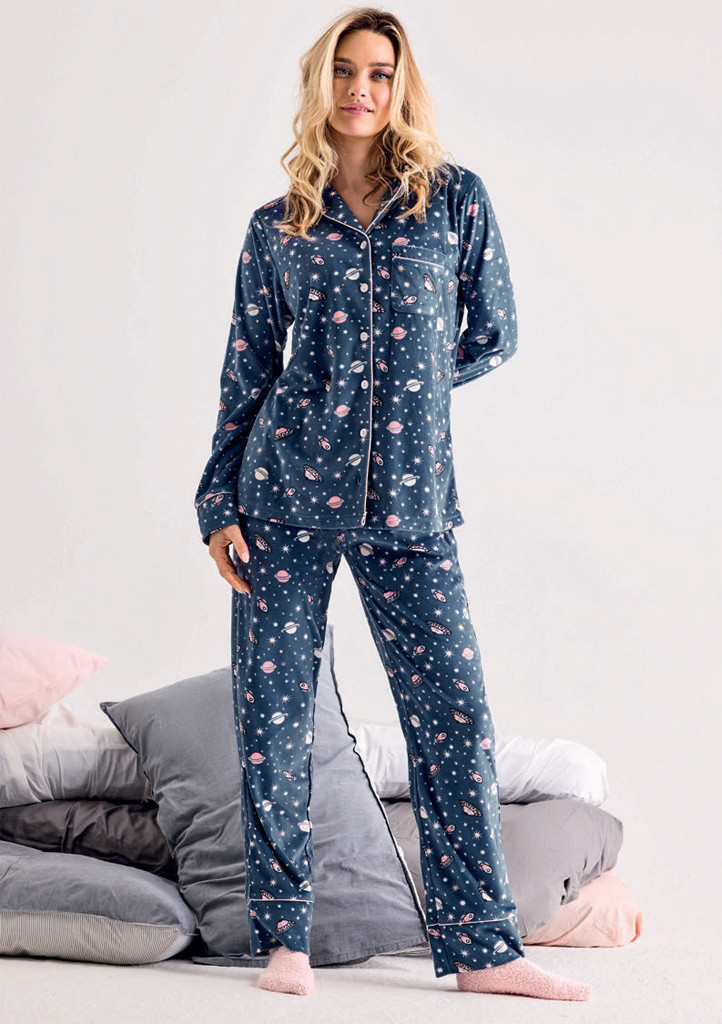 Pohodlné dvoudílné pyžamo Infiore v hravém vesmírném designu přináší dokonalé spojení komfortu a stylu. Měkký a hřejivý materiál je ideální pro chladnější období a příjemně se nosí po celou noc. Košile s dlouhým rukávem má klasické zapínání na knoflíčky a kontrastní lemování, které dodává celému setu elegantní nádech. Dlouhé kalhoty s volnějším střihem zajišťují maximální pohodlí. Skvělá volba pro všechny milovnice měkoučkého domácího komfortu a originálních vzorů.