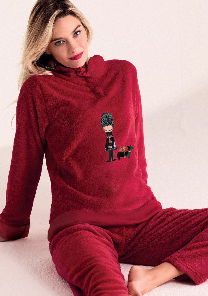 Dámské pyžamo Infiore z hebkého a hřejivého materiálu je ideální volbou pro chladnější dny. Vrchní díl v sytě červené barvě má dlouhé rukávy, stojáček se zapínáním na knoflíčky a ozdobný motiv postavičky s pejskem, který dodává pyžamu hravý a zimní nádech. Kalhoty jsou dlouhé, měkké a příjemně elastické, takže se skvěle přizpůsobí při nošení. Komfortní komplet, který zahřeje a zároveň působí roztomile.