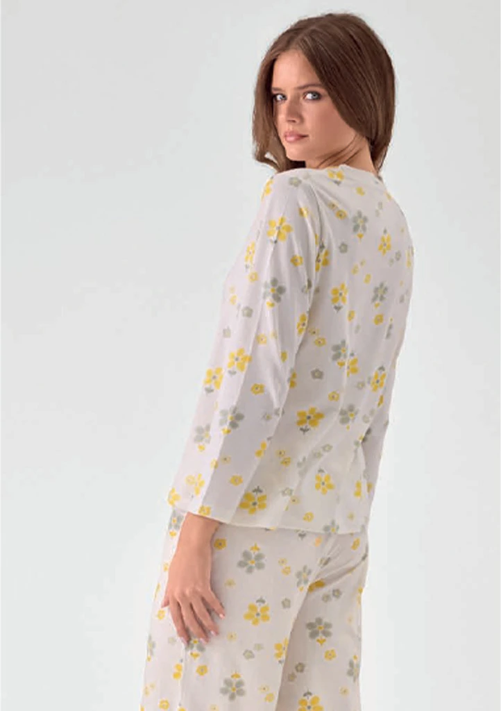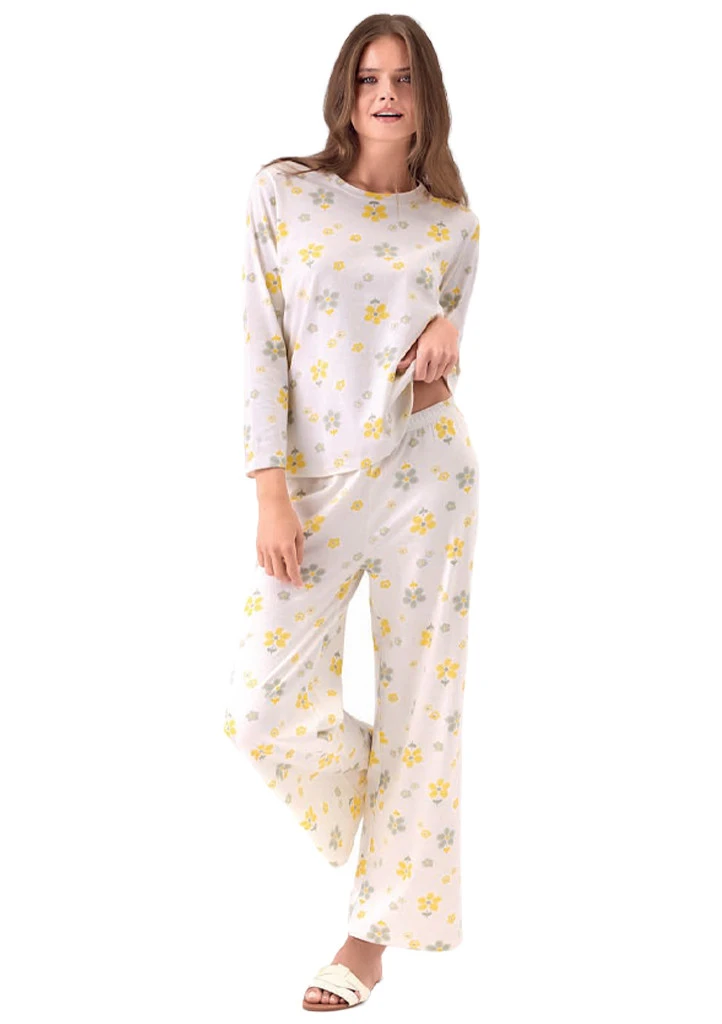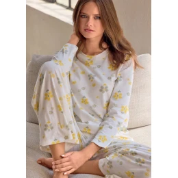 Dámské pyžamo značky Infiore v jemném krémovém odstínu s drobným květinovým potiskem působí lehce a velmi žensky. Horní díl s dlouhým rukávem má jednoduchý kulatý výstřih a pohodlný volnější střih který je ideální pro spánek i domácí relax. Kalhoty s rovnými nohavicemi krásně splývají a zajišťují maximální komfort při nošení. Příjemný měkký materiál je hebký na dotek a vhodný pro celoroční použití. Pohodlné a stylové pyžamo ideální pro ženy které dávají přednost jemnému designu a komfortu.