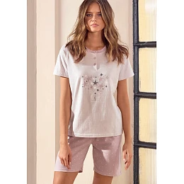 Dámské pyžamo značky Infiore v jemných růžových tónech je ideální volbou pro pohodlný spánek i domácí relax. Horní díl s krátkým rukávem má kulatý výstřih doplněný o praktické zapínání na knoflíky a zdobí ho decentní potisk s hvězdičkami, který dodává modelu něžný a ženský vzhled. Krátké kalhoty s jemným vzorem perfektně ladí s tričkem a zajišťují maximální komfort při nošení. Příjemný, lehký materiál a pohodlný střih poskytují volnost pohybu a příjemný pocit po celý den i noc.