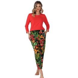 Dámské pyžamo, jednobarevné tričko 7/8 rukáv.Kalhoty s potiskem.