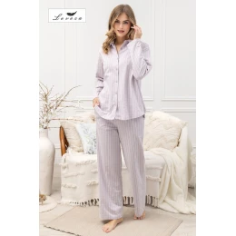 Dámské pyžamo LEVEZA JUDYTA 1613 je elegantní souprava na spaní, která kombinuje ženský styl s maximálním pohodlím. Je vyrobena ze 100% přírodní bavlny a zajišťuje prodyšnost a pohodlí po celou noc. horní díl je halenka s dlouhými rukávy a stojáčkem v jemné lila barvě se svislým proužkem. dlouhé kalhoty se širokými nohavicemi mají praktické kapsy a ozdobnou šňůrku v pase. ideální pro chladnější noci a domácí relaxaci. k dostání ve velikostech M–2XL.