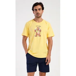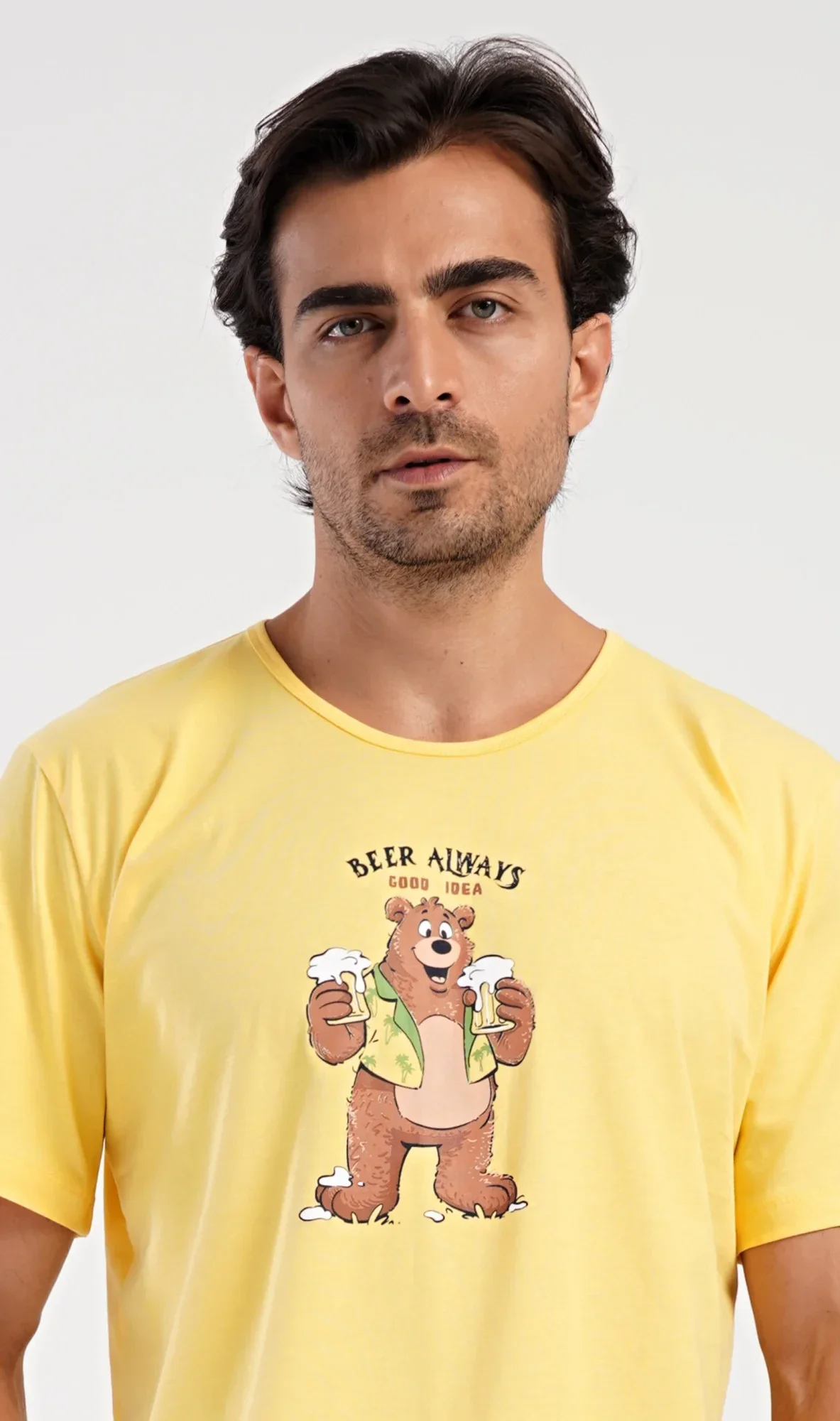Pánské bavlněné šortkové pyžamo Beer always. Pánské pyžamo se skládá z trička s krátkým rukávem a krátkých šortkových kalhot. Na jednobarevném tričku je obrázek medvěda s pivem a nápis 'Beer always'. Šortky mají praktické kapsy, v pase gumu a šňůrku na stáhnutí. Použitý materiál s podílem bavlny 100% je příjemný a poddaný na dotek. Pyžamo oceníte obzvlášť v horkých letních dnech.