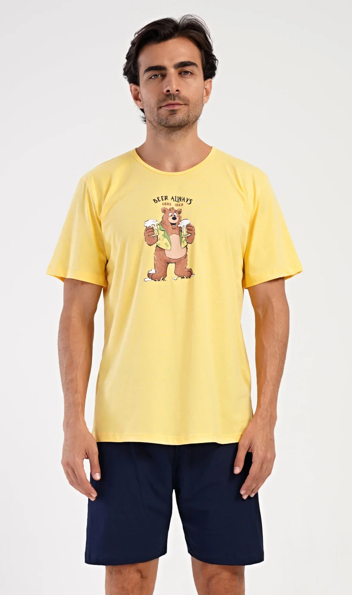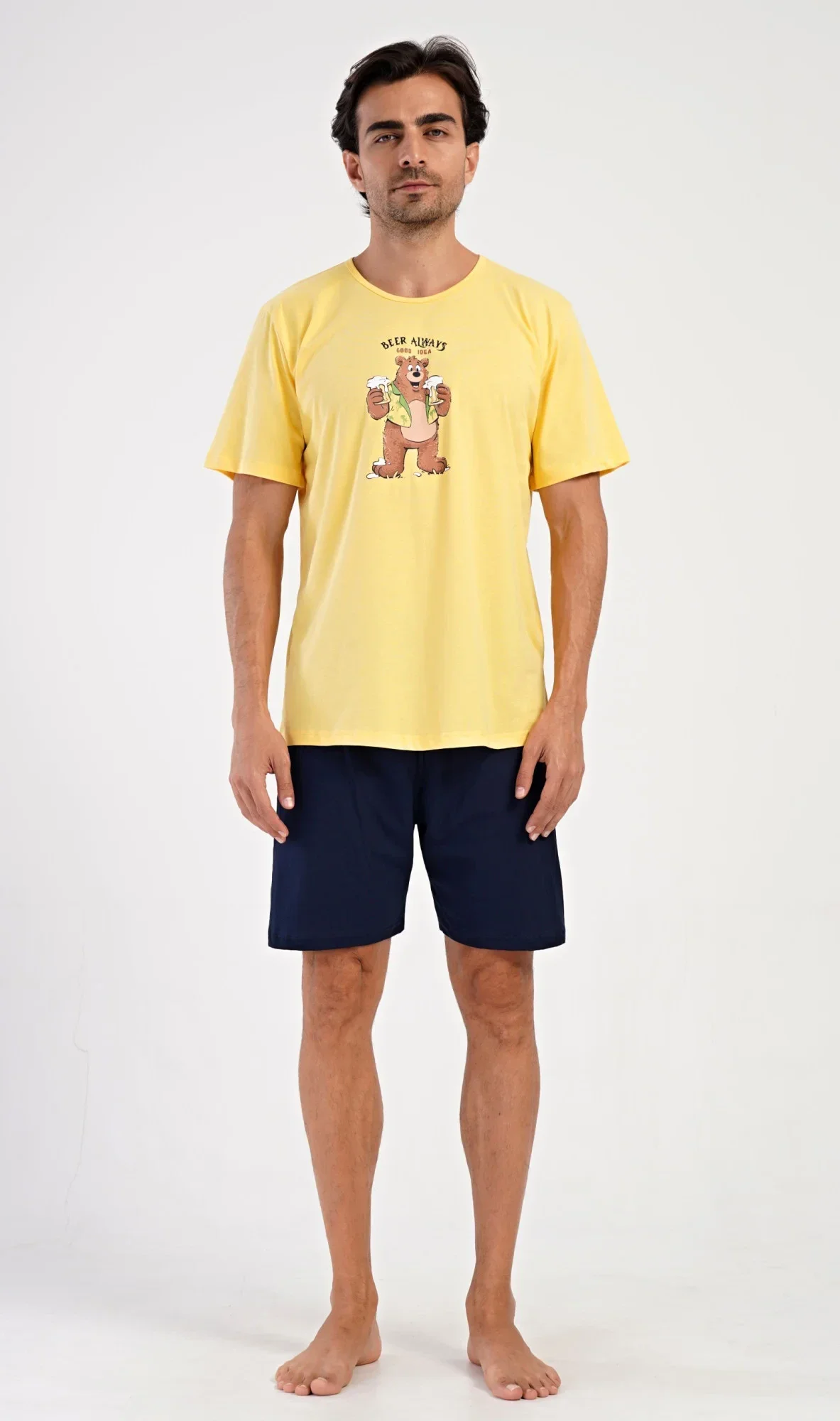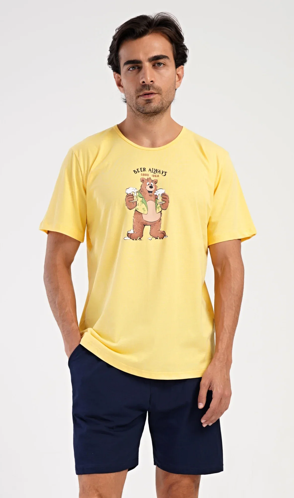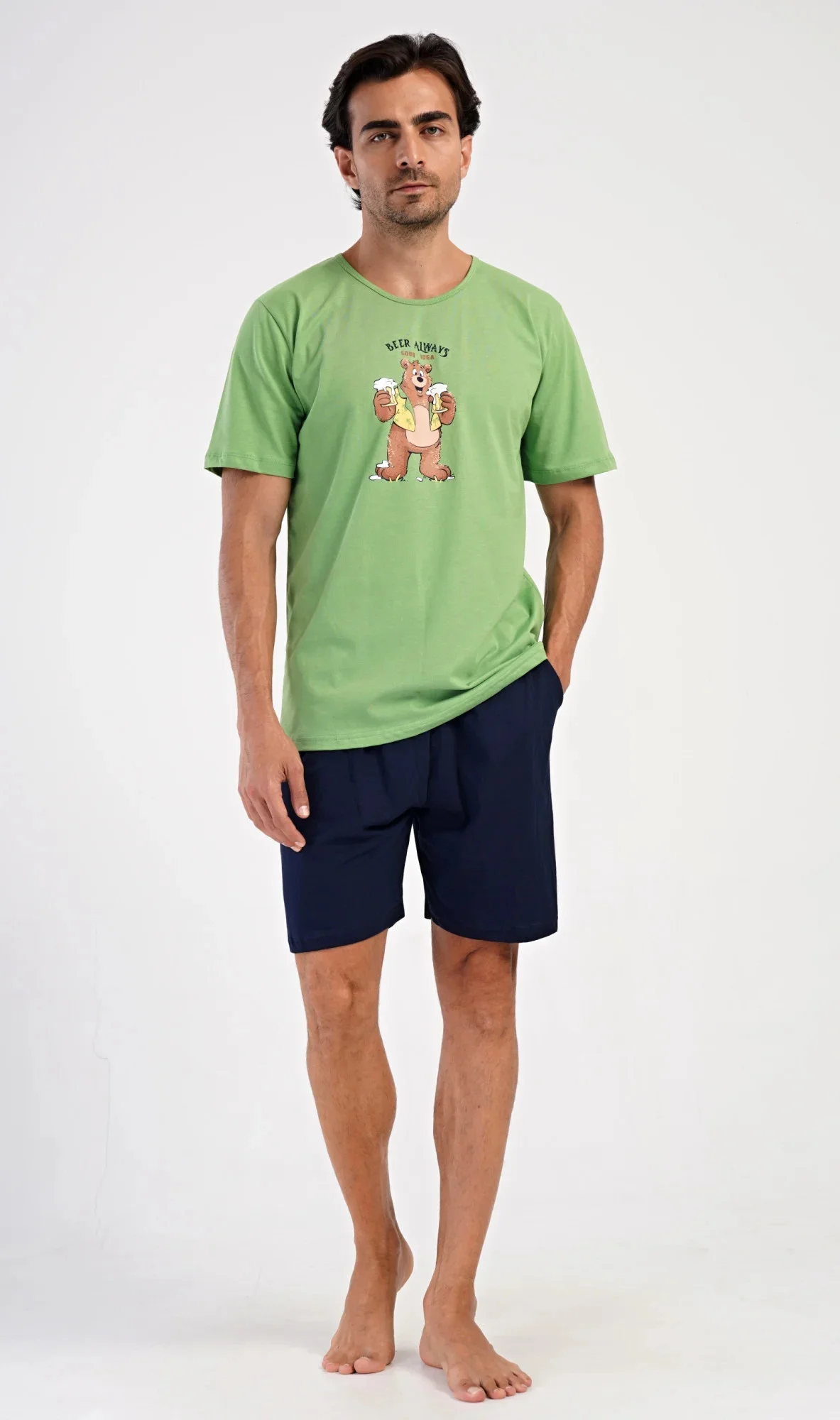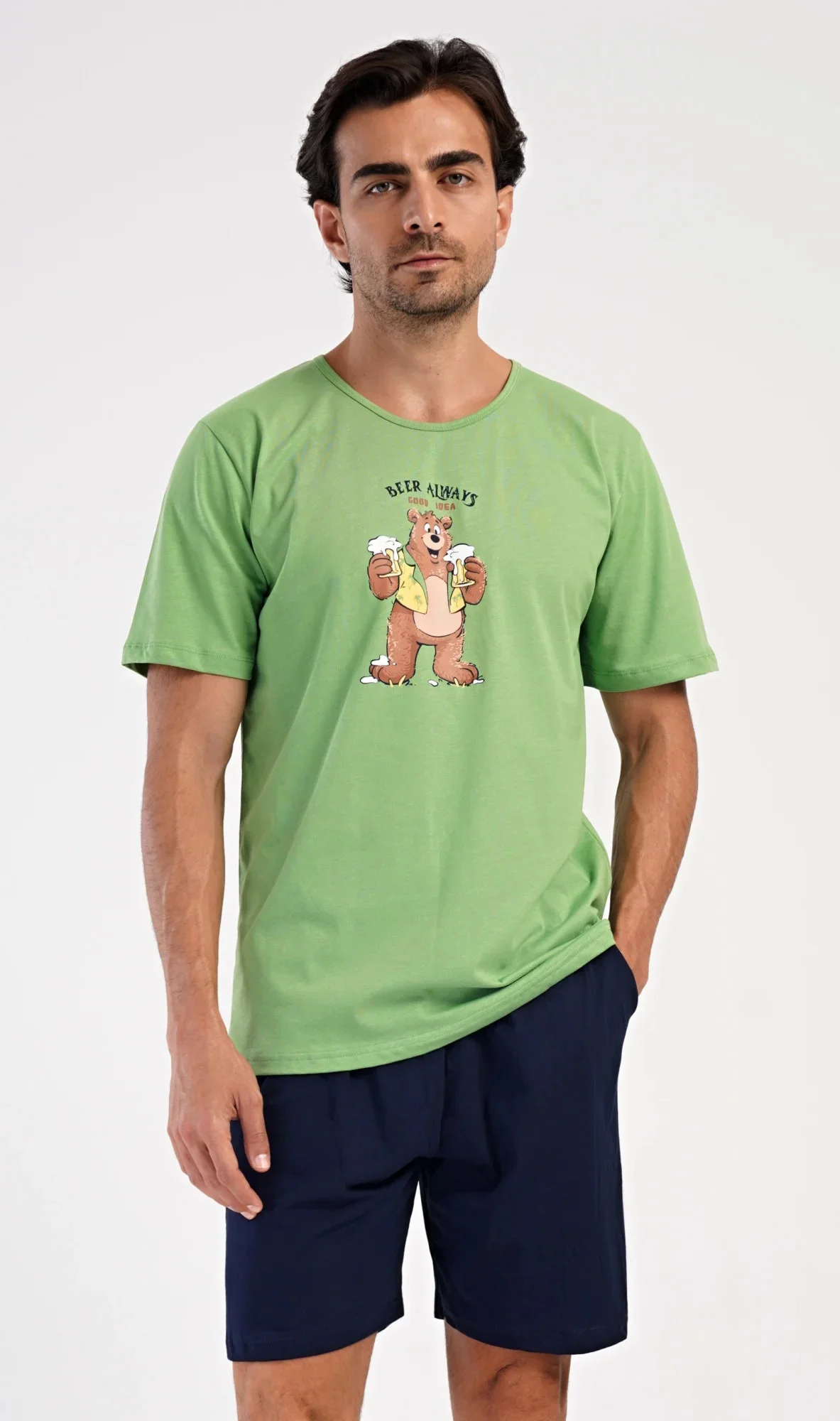 Pánské bavlněné šortkové pyžamo Beer always. Pánské pyžamo se skládá z trička s krátkým rukávem a krátkých šortkových kalhot. Na jednobarevném tričku je obrázek medvěda s pivem a nápis 'Beer always'. Šortky mají praktické kapsy, v pase gumu a šňůrku na stáhnutí. Použitý materiál s podílem bavlny 100% je příjemný a poddaný na dotek. Pyžamo oceníte obzvlášť v horkých letních dnech.