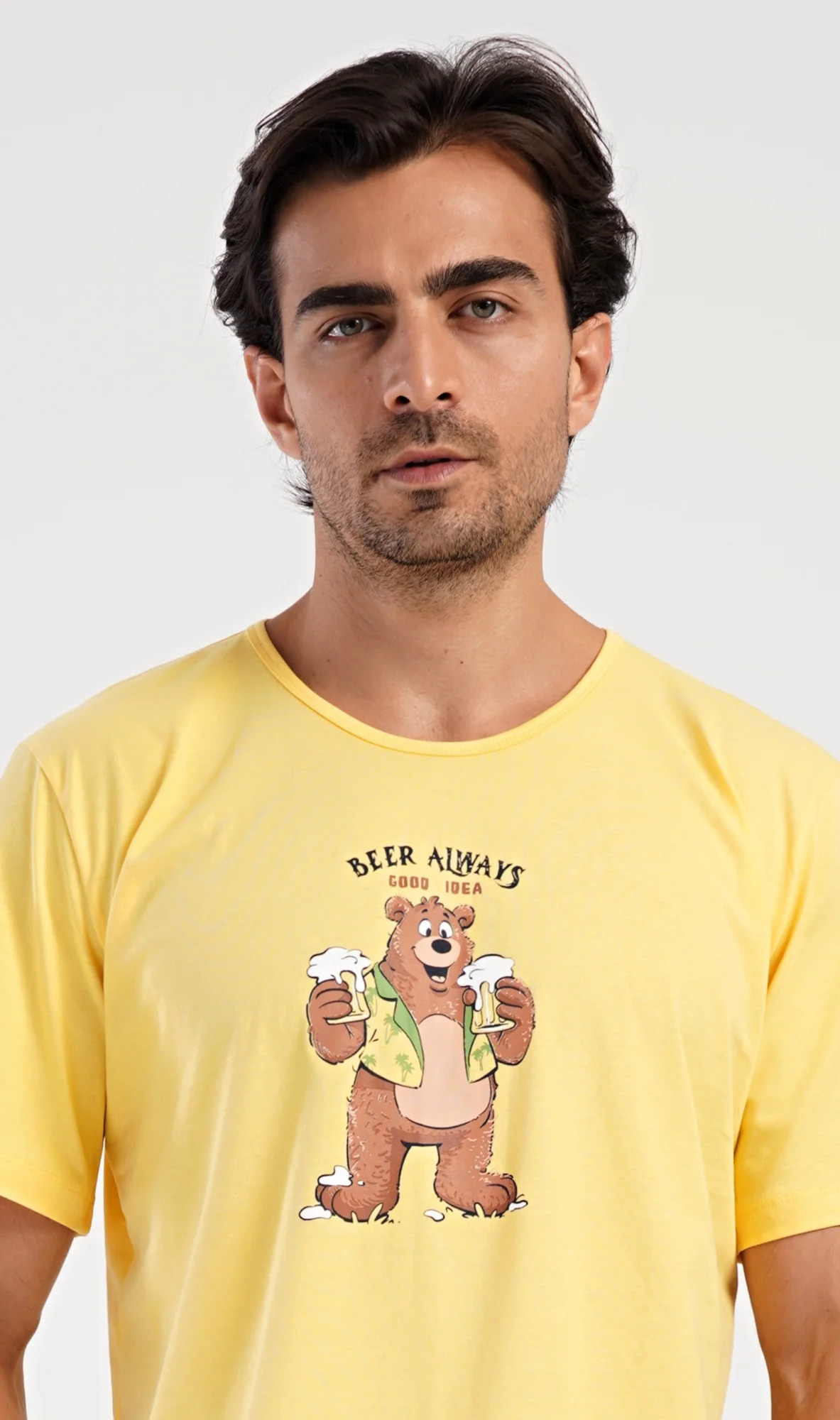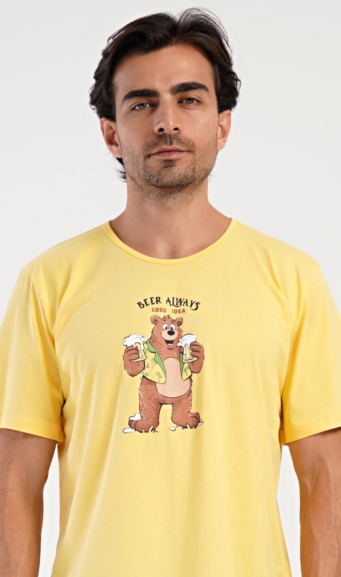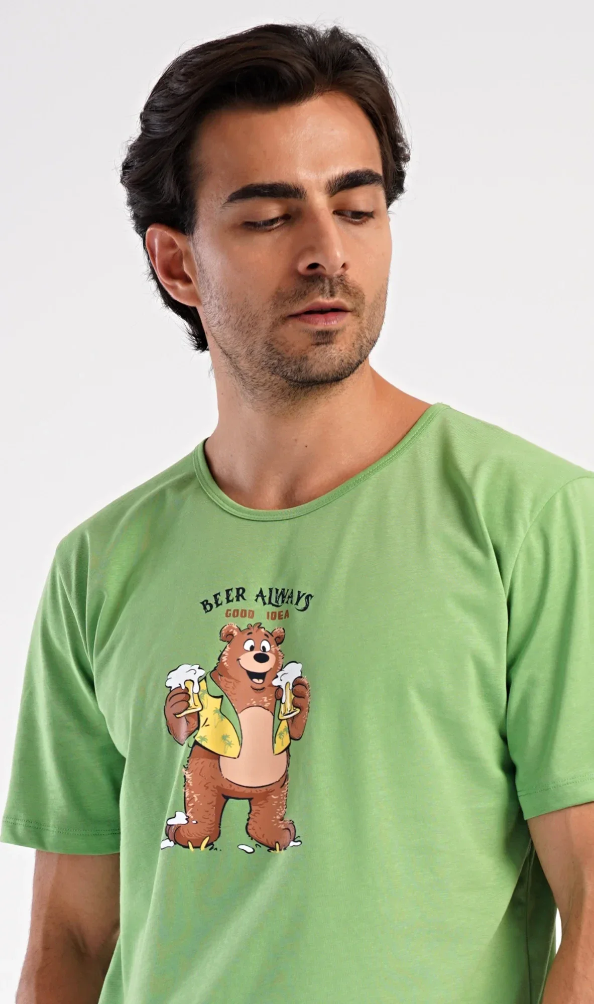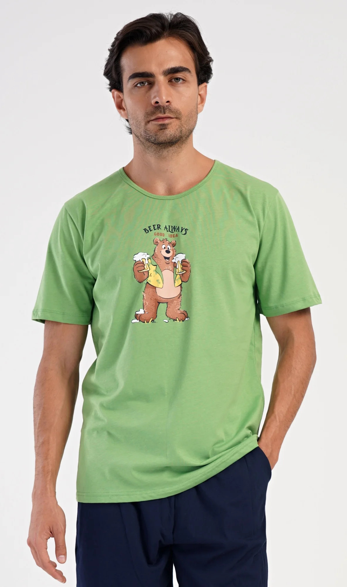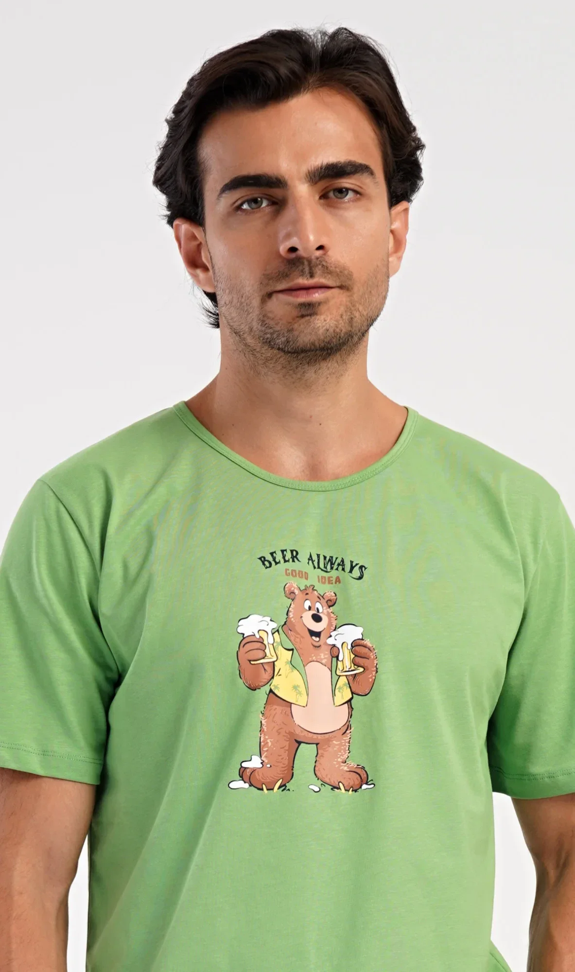 Pánské bavlněné šortkové pyžamo Beer always. Pánské pyžamo se skládá z trička s krátkým rukávem a krátkých šortkových kalhot. Na jednobarevném tričku je obrázek medvěda s pivem a nápis 'Beer always'. Šortky mají praktické kapsy, v pase gumu a šňůrku na stáhnutí. Použitý materiál s podílem bavlny 100% je příjemný a poddaný na dotek. Pyžamo oceníte obzvlášť v horkých letních dnech.