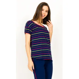 Dámské bavlněné kapri pyžamo Lenka. Kapri pyžamo se skládá z trička s krátkým rukávem a tříčtvrtečních kalhot. Tričko s kulatým výstřihem má na hrudi obrázek motýla a nápis BEST, kalhoty jsou také potištěny motýlky. Kapri kalhoty mají v pase gumu a šňůrku na stáhnutí, nemají kapsy. Použitý materiál je příjemný a poddajný na dotek. Obsah bavlny u trička i u kalhot je 100%.