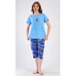 Dámské bavlněné kapri pyžamo Eliza. Dámské pyžamo se skládá z trička s krátkým rukávem a tříčtvrtečních kalhot. Tričko s kulatým výstřihem má na hrudi obrázek s geometrickým vzorem. Tento motiv se opakuje i na kalhotách, které mají v pase gumu a šňůrku na stažení, jsou bez kapes. Použitý bavlněný materiál je příjemný a poddajný na dotek.