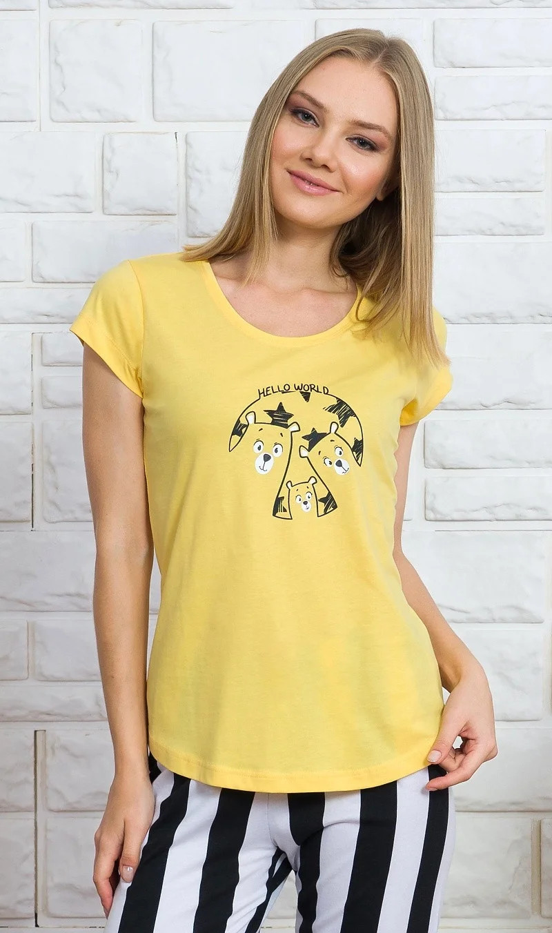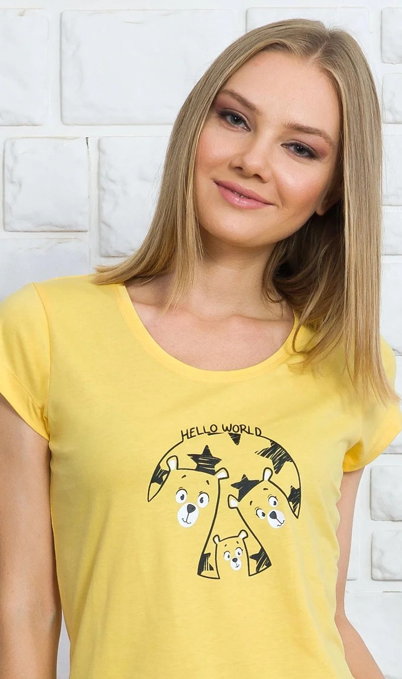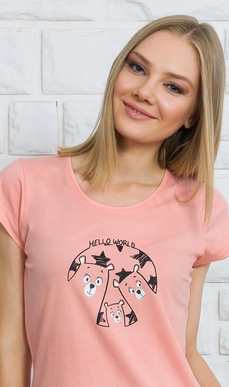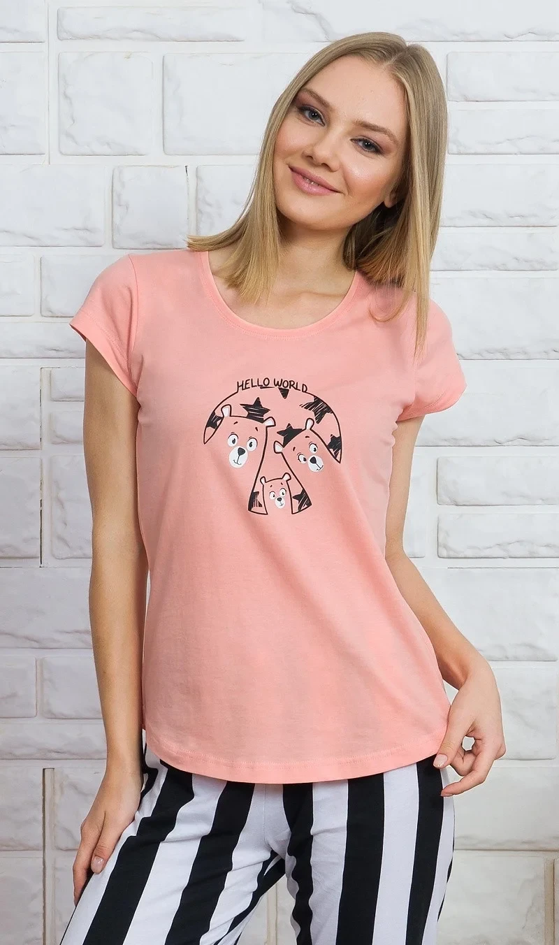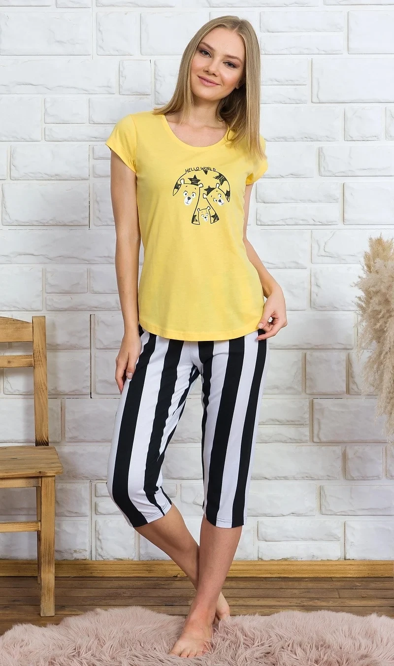 Dámské bavlněné kapri pyžamo Hello world. Dámské pyžamo se skládá z trička s krátkým rukávem a tříčtvrtečních kalhot. Tričko s kulatým výstřihem má na hrudi obrázek tří medvídků a nápis 'Hello world'. Tričko doplňují pruhované tříčtvrteční kalhoty, které mají v pase gumu a šňůrku na stáhnutí, nemají kapsy. Použitý materiál je příjemný a poddajný na dotek. Obsah bavlny u trička i u kalhot je 100%.