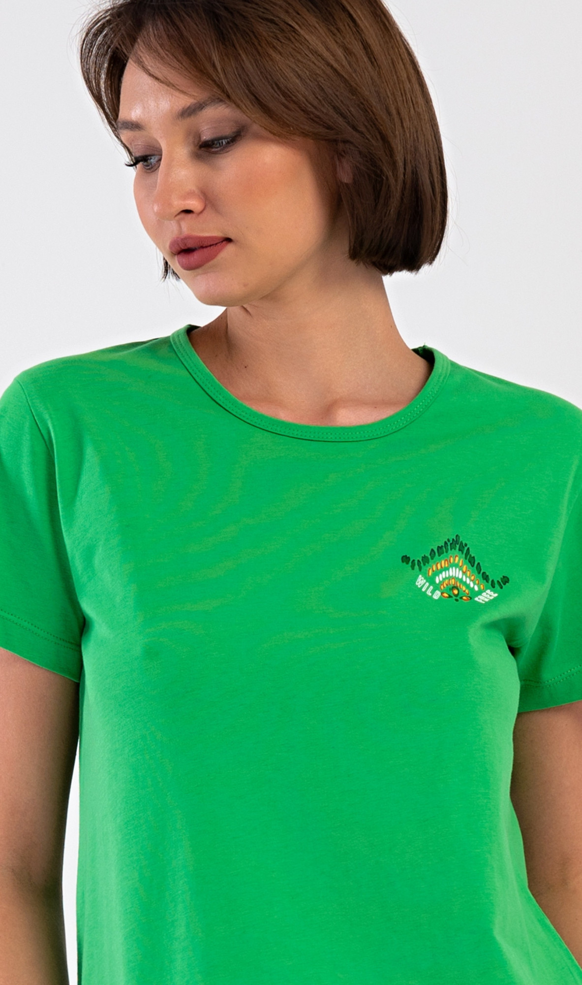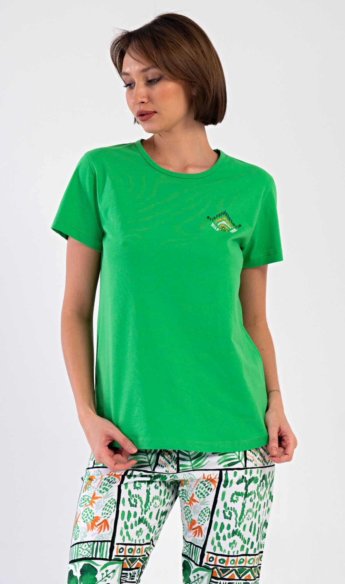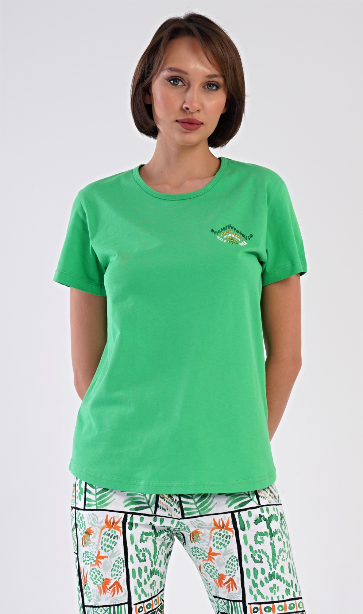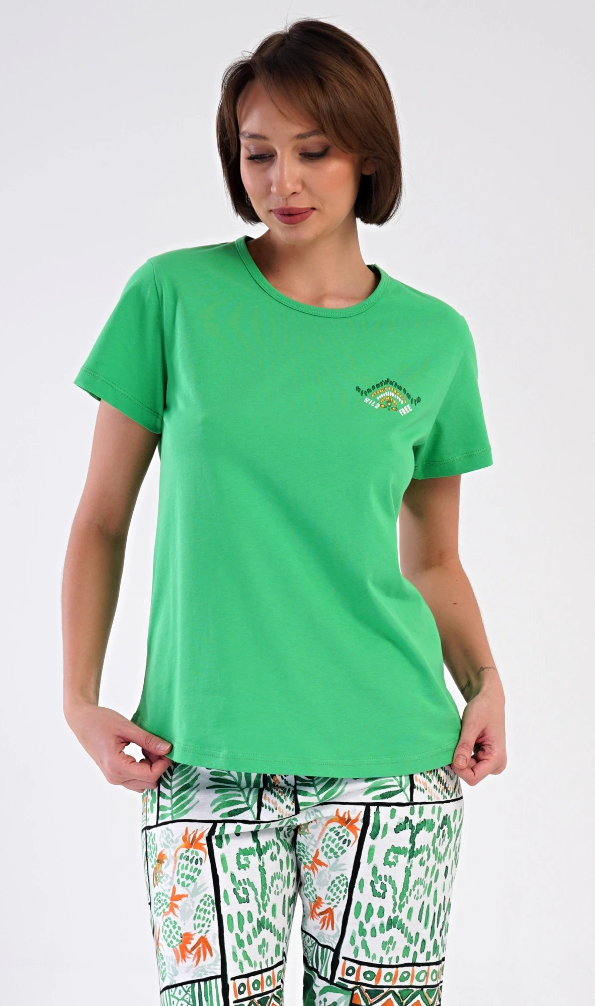 Dámské bavlněné kapri pyžamo Janette. Dámské pyžamo se skládá z trička s krátkým rukávem a tříčtvrtečních kalhot. Tričko s kulatým výstřihem zdobí na hrudi drobný obrázek. Kalhoty s potiskem exotických motivů mají v pase gumu a šňůrku na stažení, jsou bez kapes. Použitý bavlněný materiál je příjemný a poddajný na dotek.
