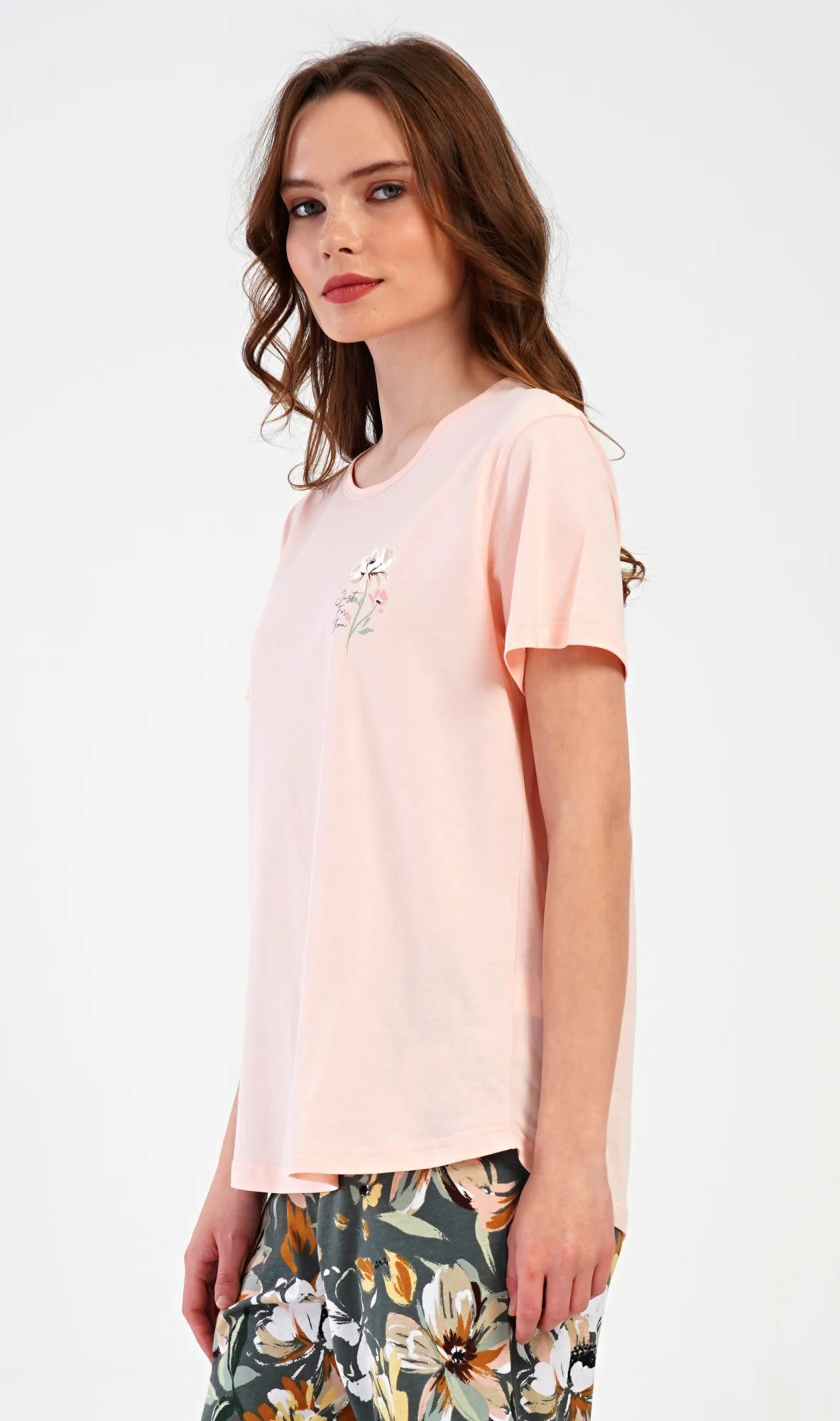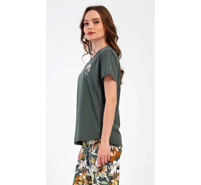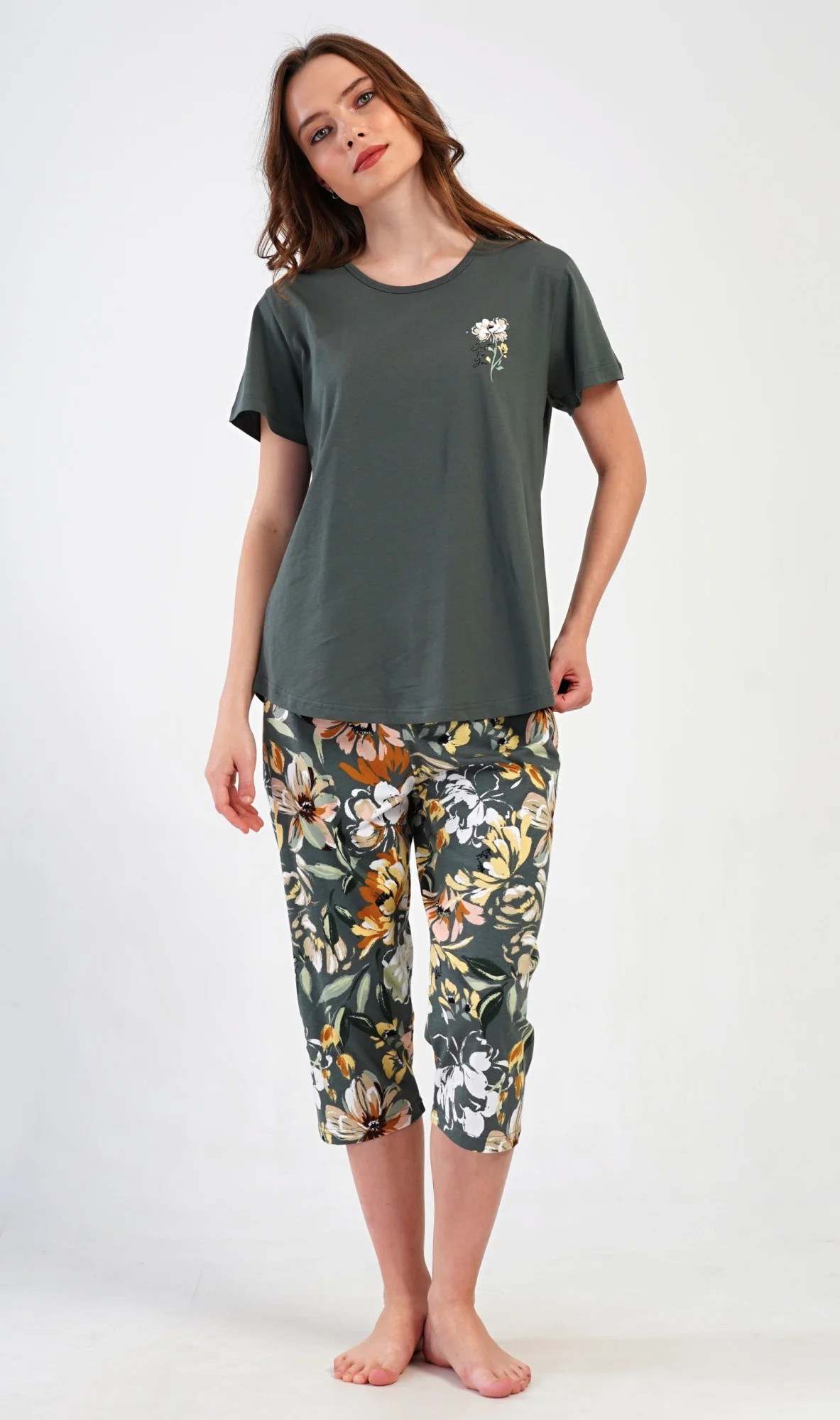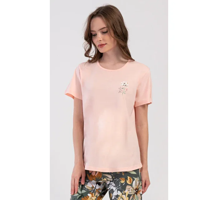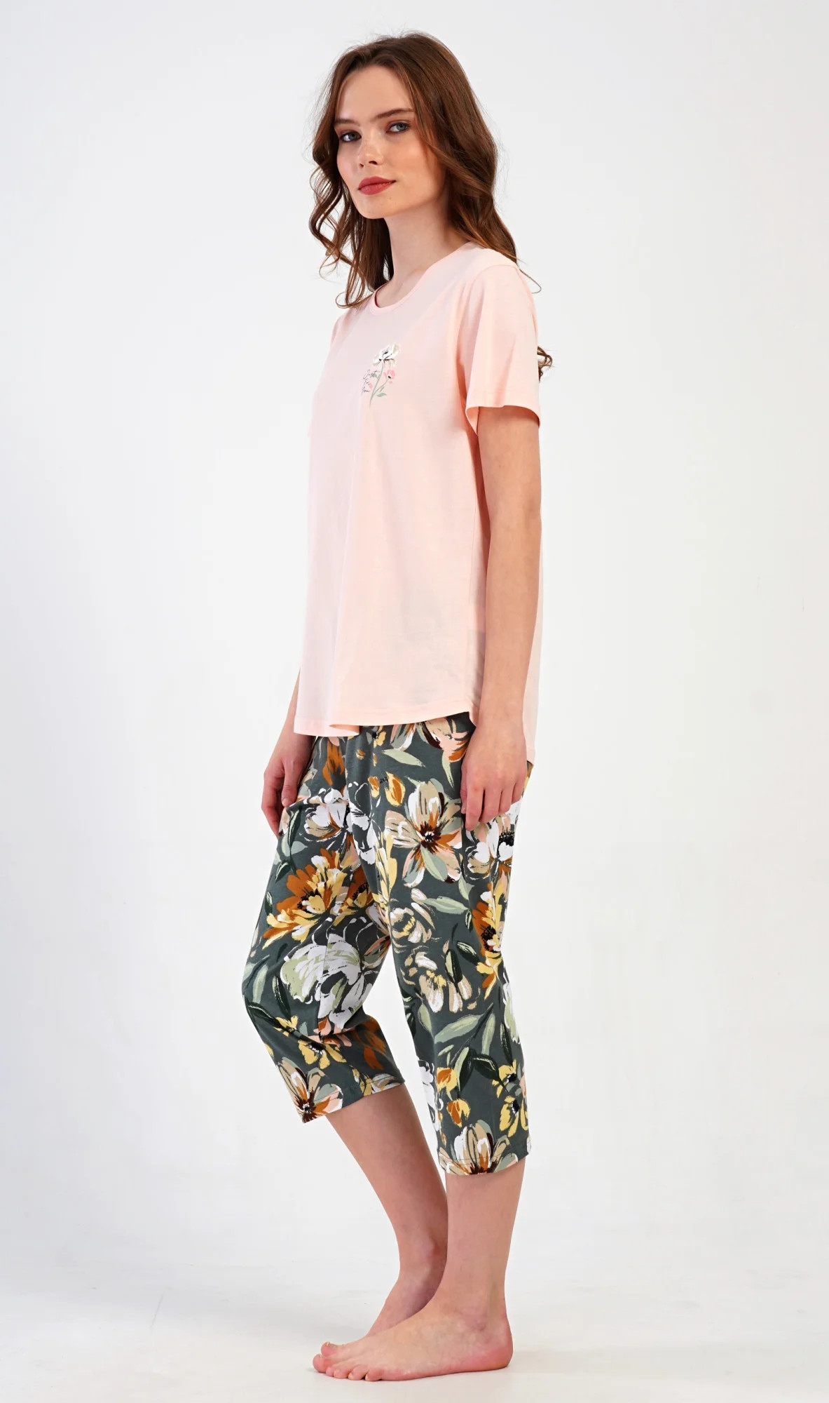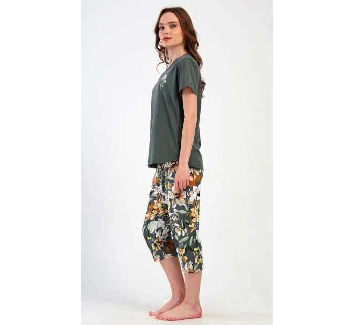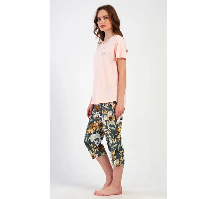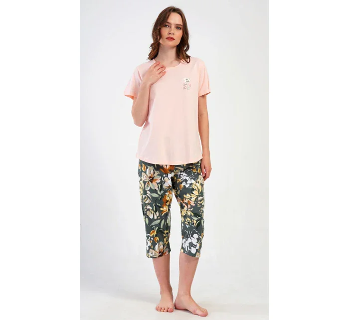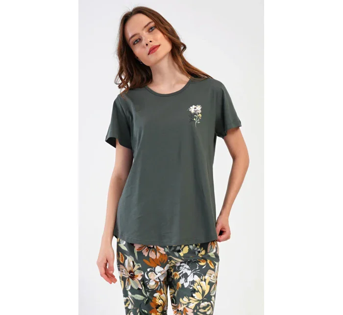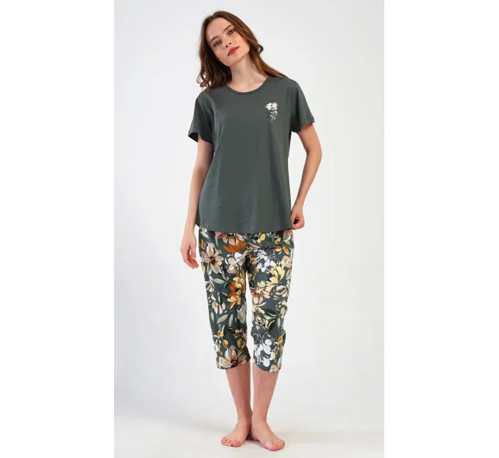 Dámské bavlněné kapri pyžamo Marie. Dámské pyžamo se skládá z trička s krátkým rukávem a tříčtvrtečních kalhot. Tričko s kulatým výstřihem má na hrudi obrázek květu. Tento motiv se opakuje i na kalhotách, které mají v pase gumu a šňůrku na stažení, jsou bez kapes. Použitý bavlněný materiál je příjemný a poddajný na dotek.