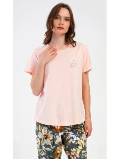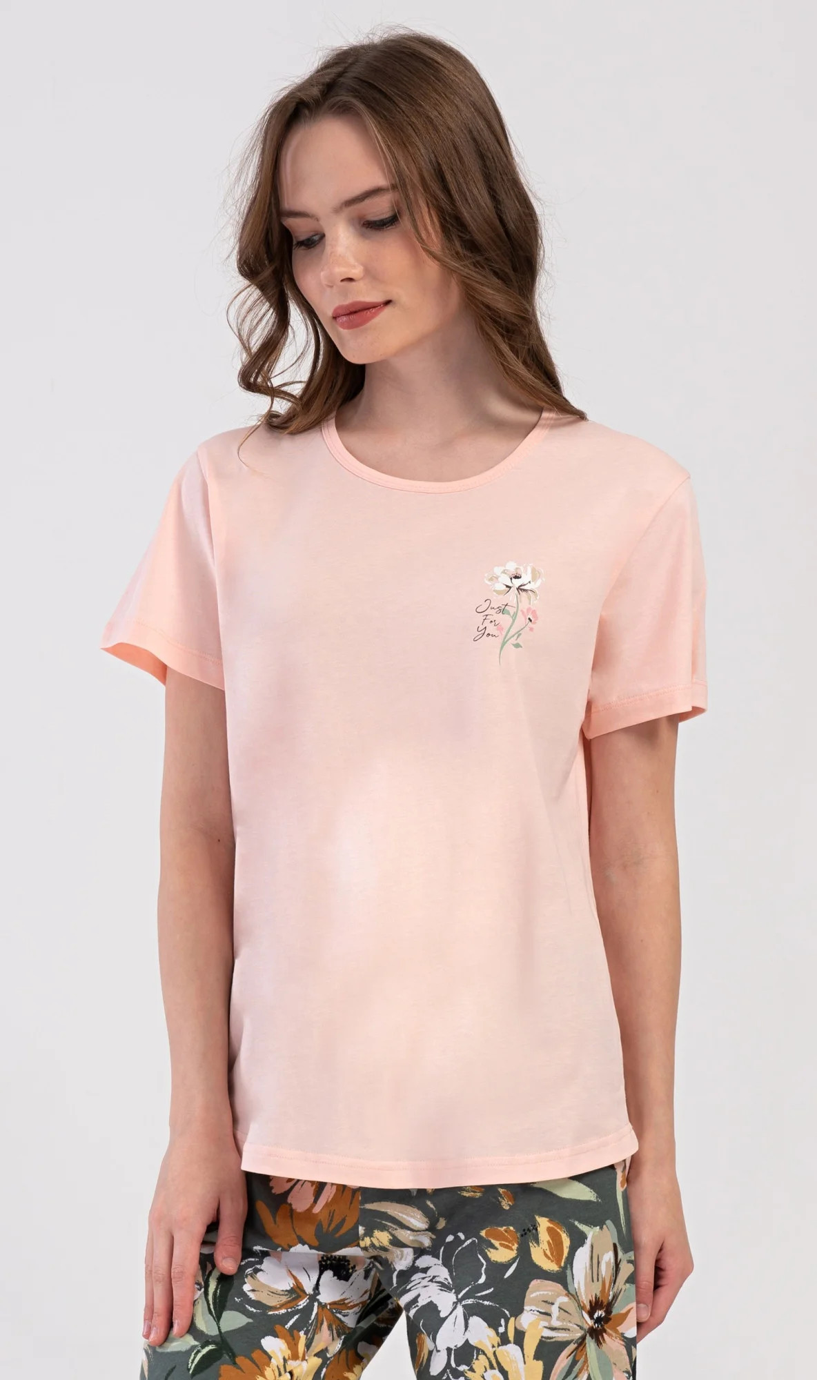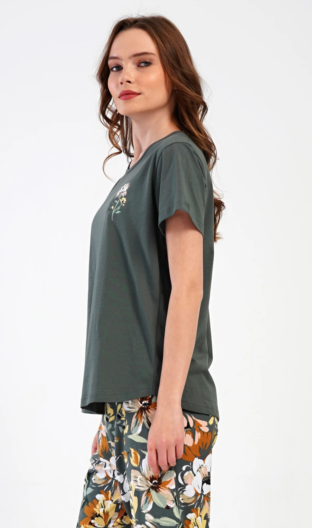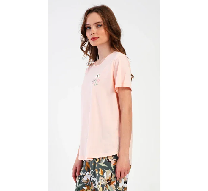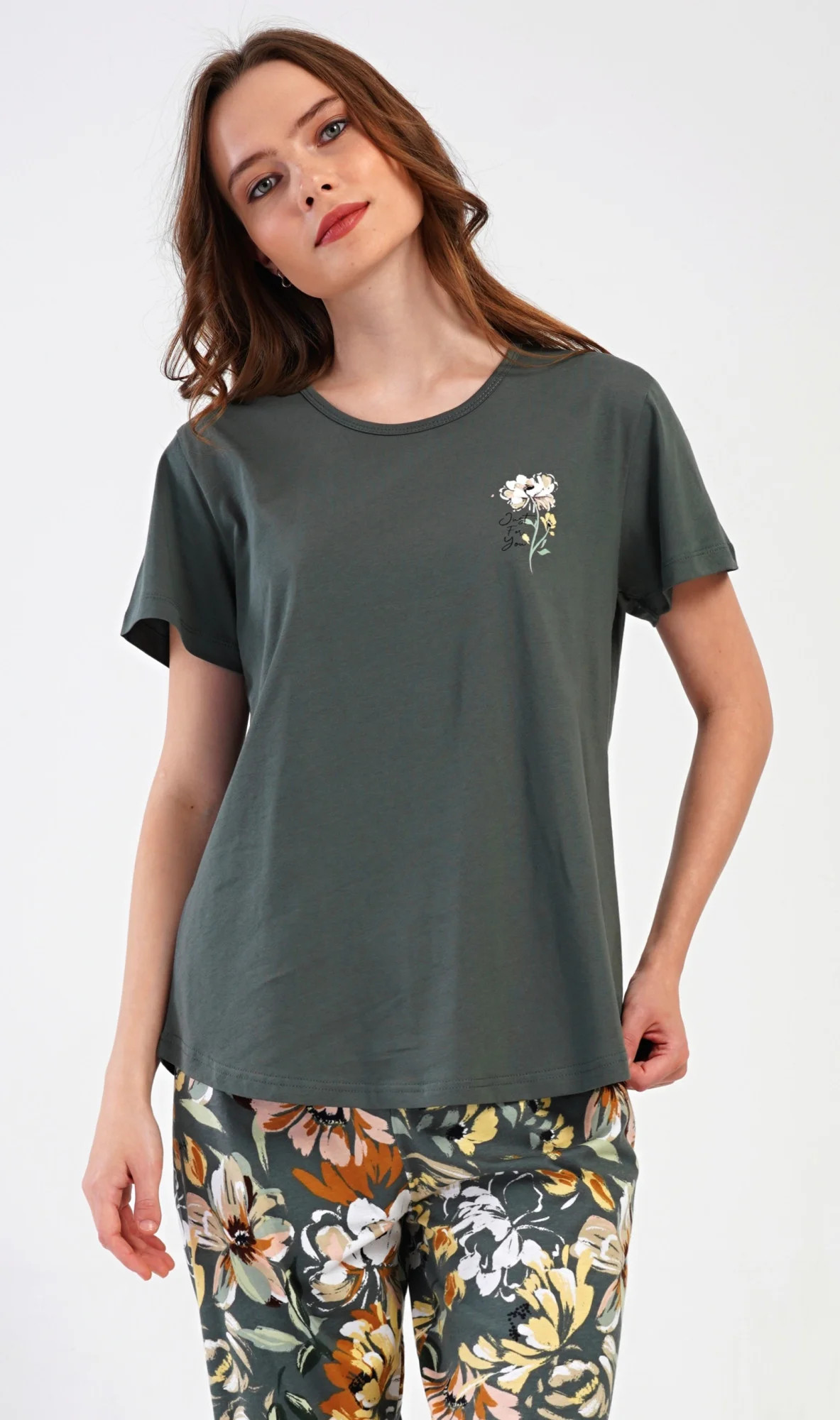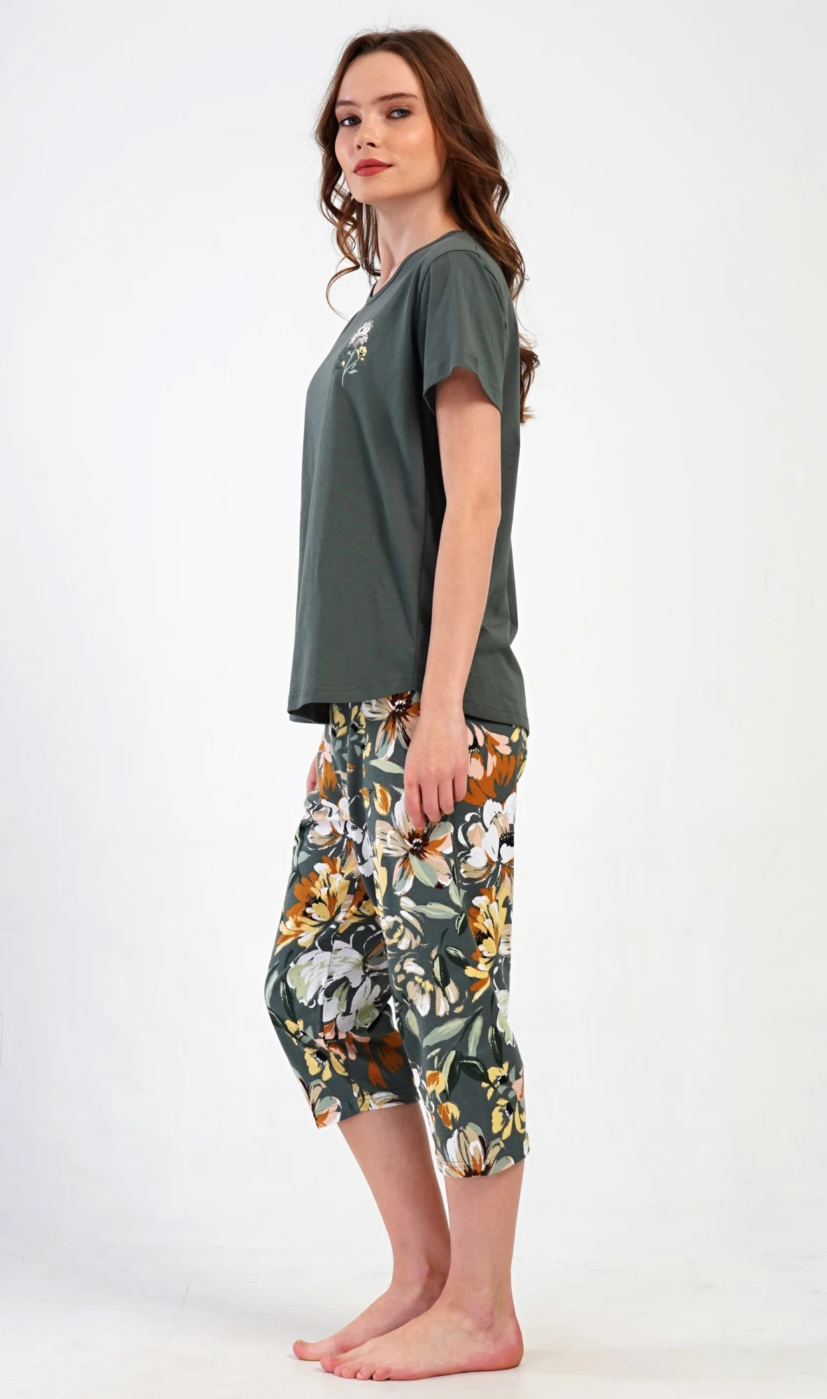 Dámské bavlněné kapri pyžamo Marie. Dámské pyžamo se skládá z trička s krátkým rukávem a tříčtvrtečních kalhot. Tričko s kulatým výstřihem má na hrudi obrázek květu. Tento motiv se opakuje i na kalhotách, které mají v pase gumu a šňůrku na stažení, jsou bez kapes. Použitý bavlněný materiál je příjemný a poddajný na dotek.