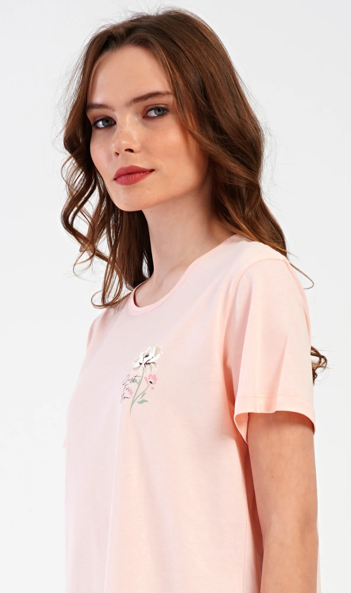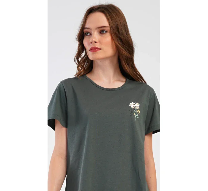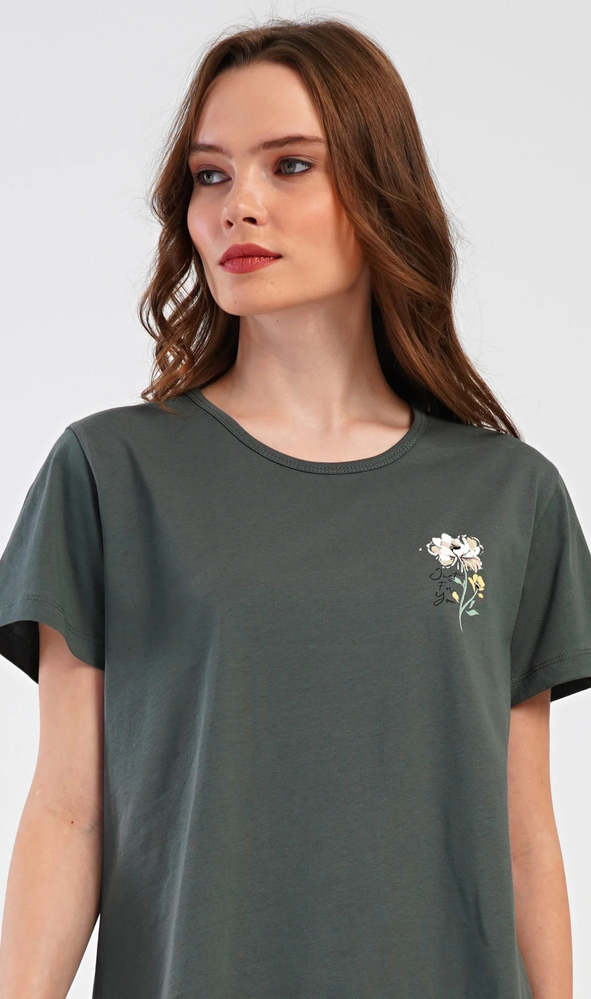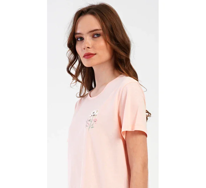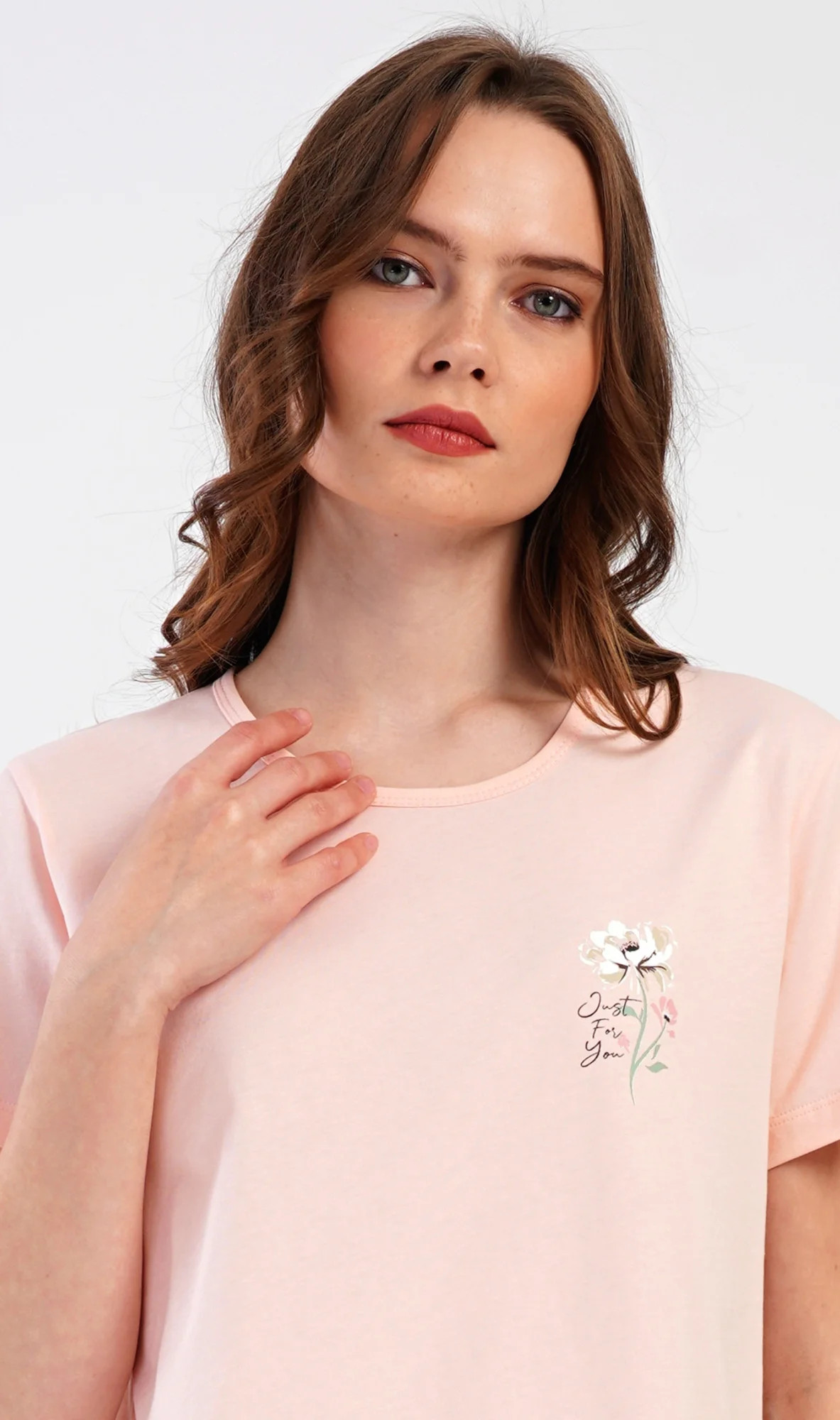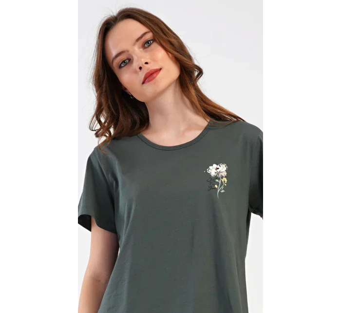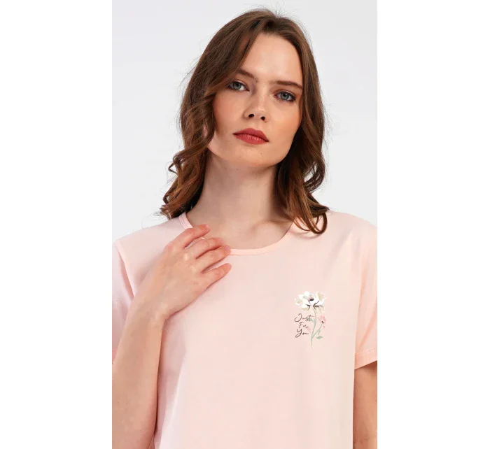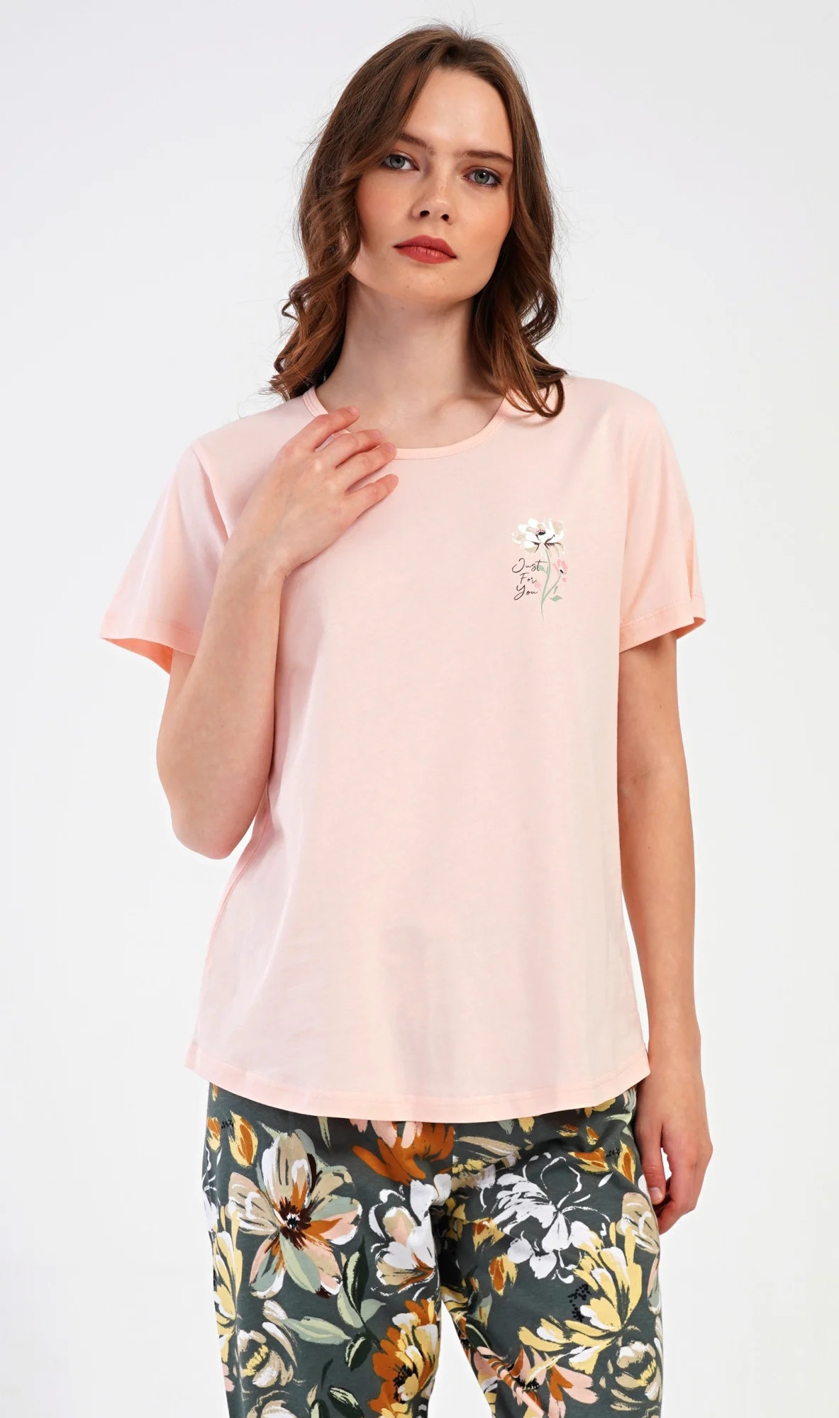 Dámské bavlněné kapri pyžamo Marie. Dámské pyžamo se skládá z trička s krátkým rukávem a tříčtvrtečních kalhot. Tričko s kulatým výstřihem má na hrudi obrázek květu. Tento motiv se opakuje i na kalhotách, které mají v pase gumu a šňůrku na stažení, jsou bez kapes. Použitý bavlněný materiál je příjemný a poddajný na dotek.