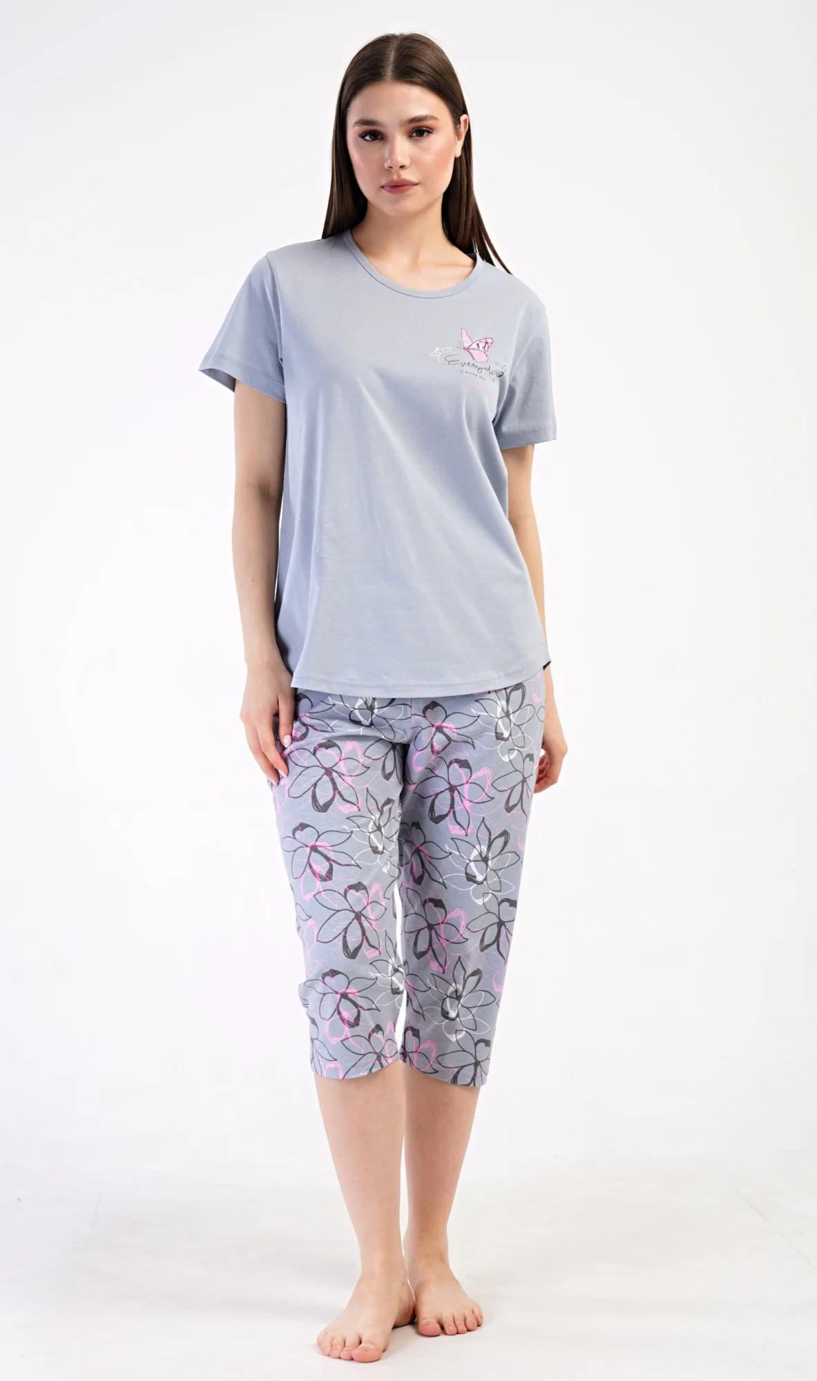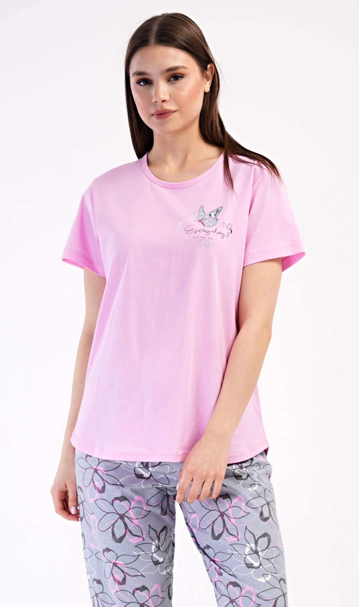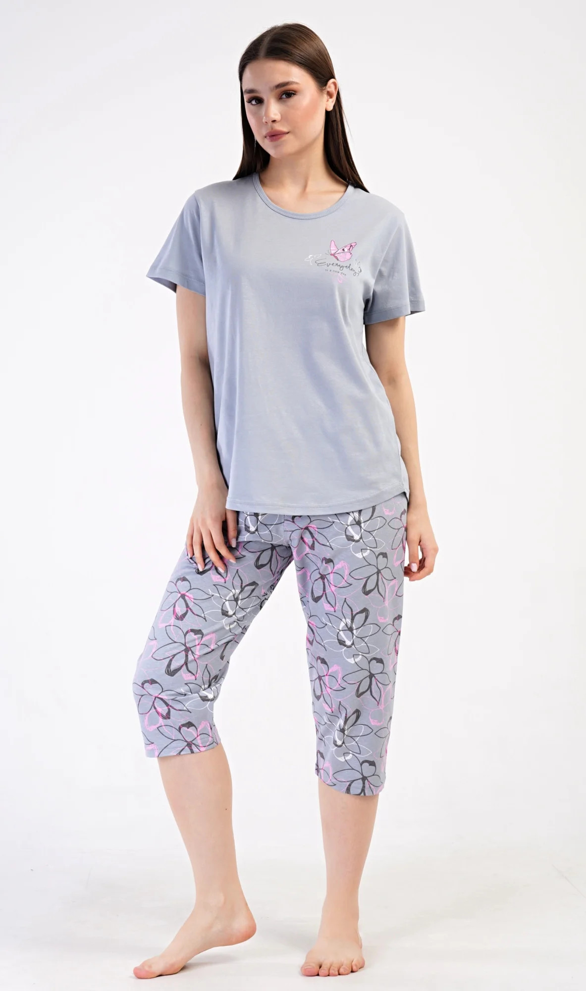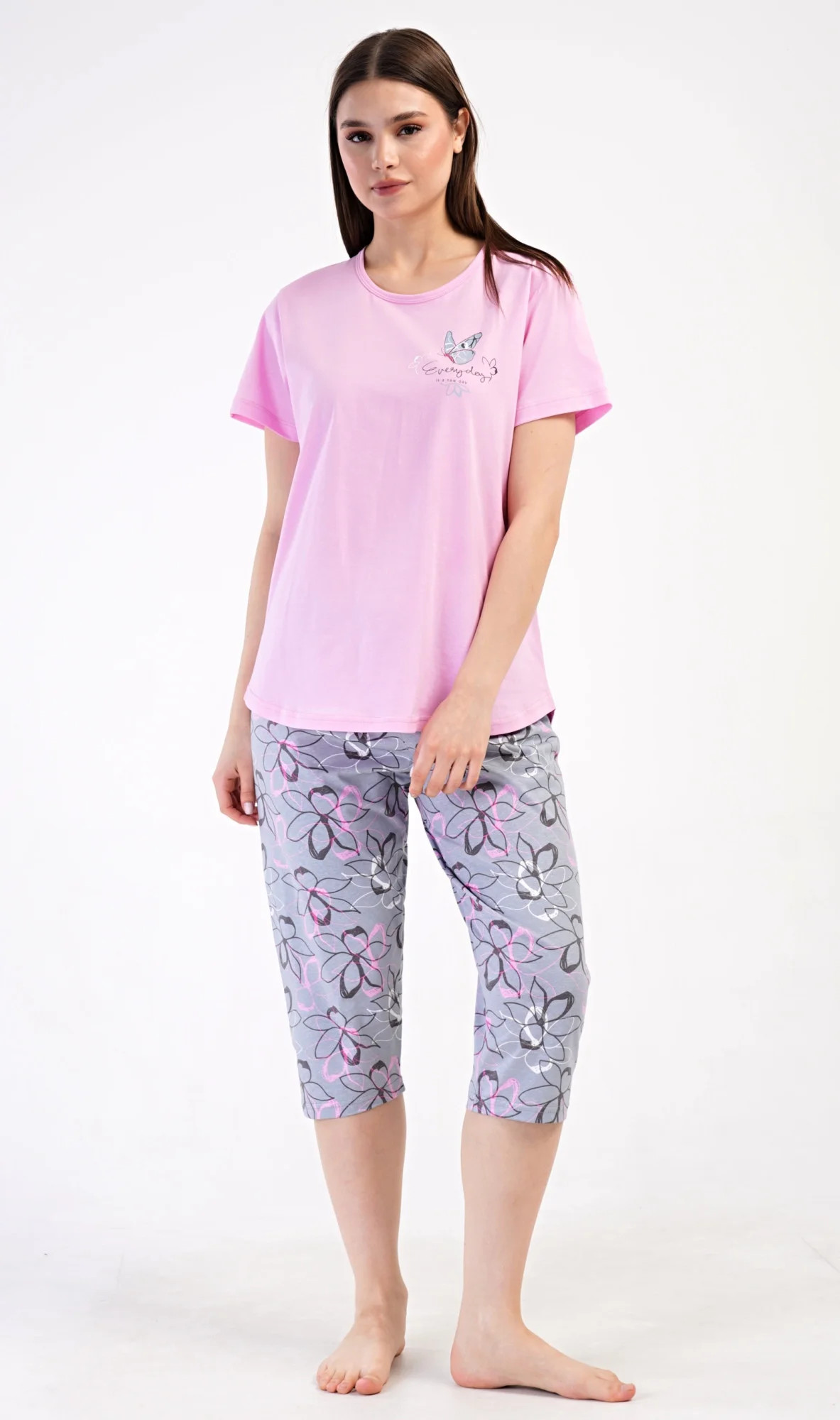 Dámské bavlněné kapri pyžamo Miana. Dámské pyžamo se skládá z trička s krátkým rukávem a tříčtvrtečních kalhot. Tričko s kulatým výstřihem zdobí na hrudi obrázek motýlka a nápis 'Everyday'. Kalhoty s potiskem květů mají v pase gumu a šňůrku na stažení, jsou bez kapes. Použitý bavlněný materiál je příjemný a poddajný na dotek.