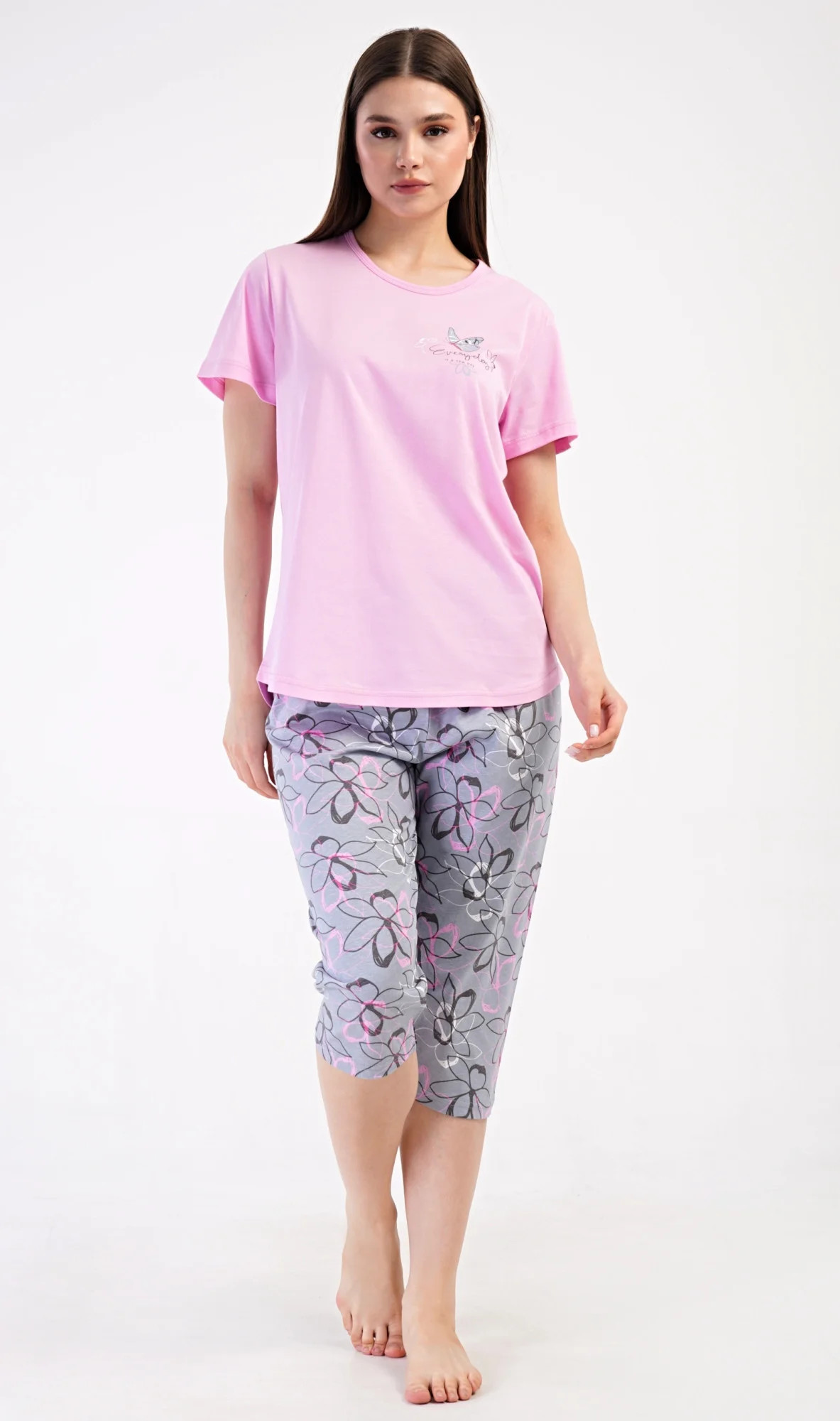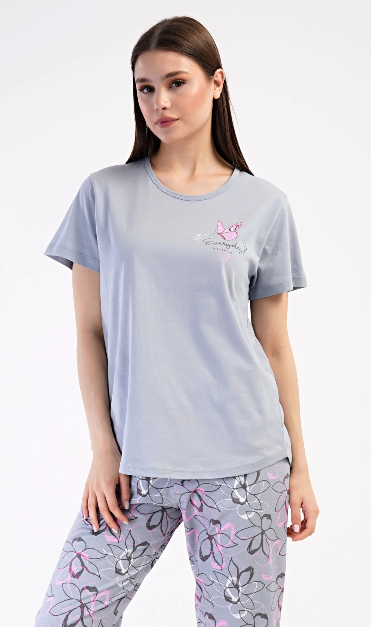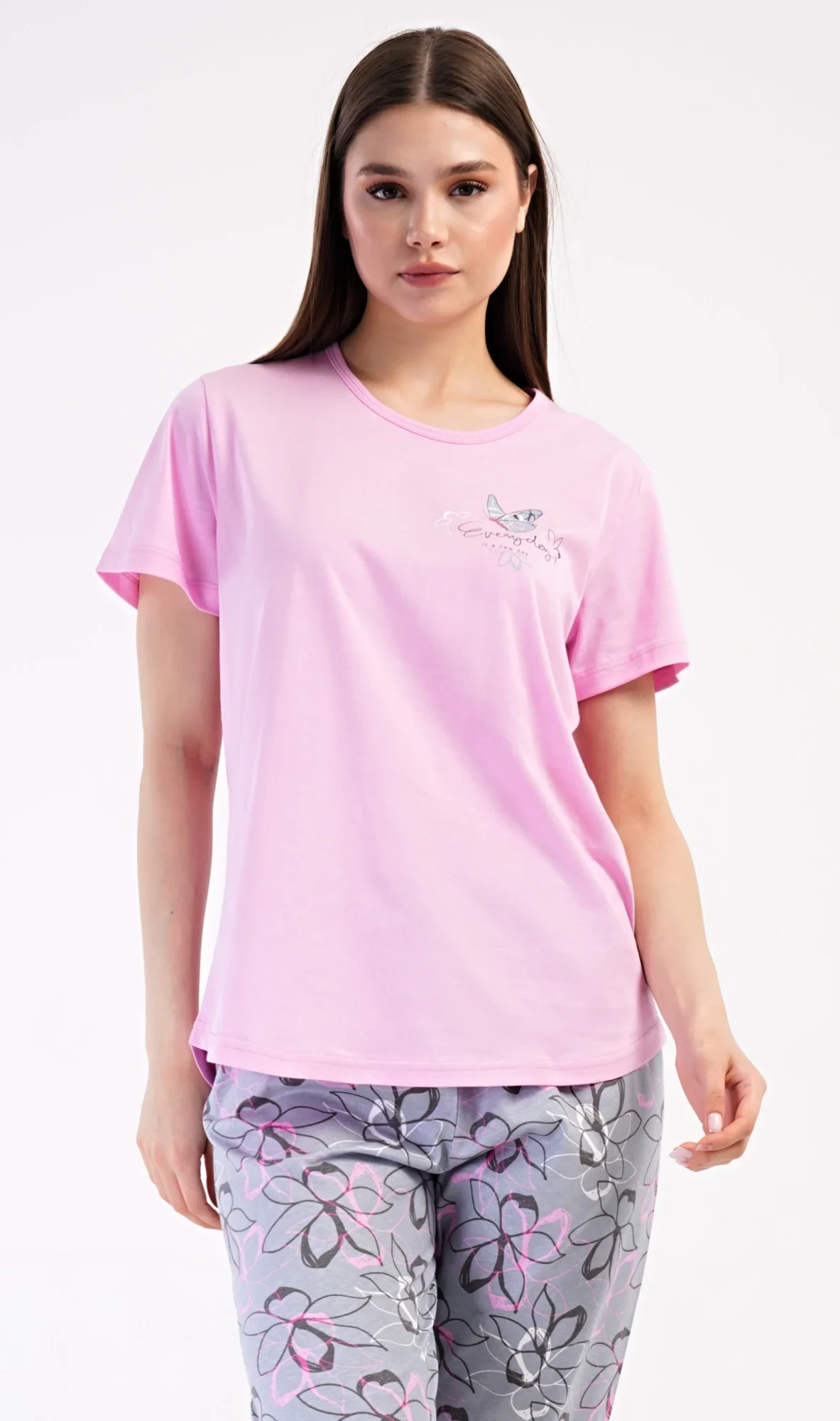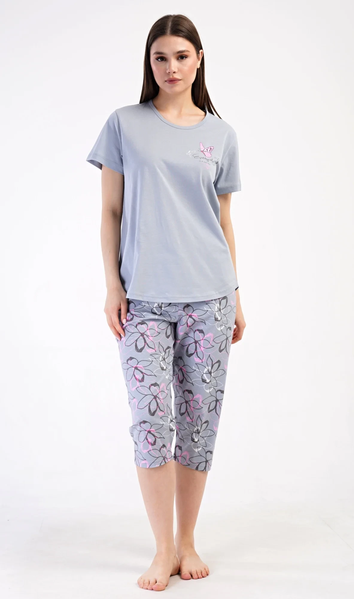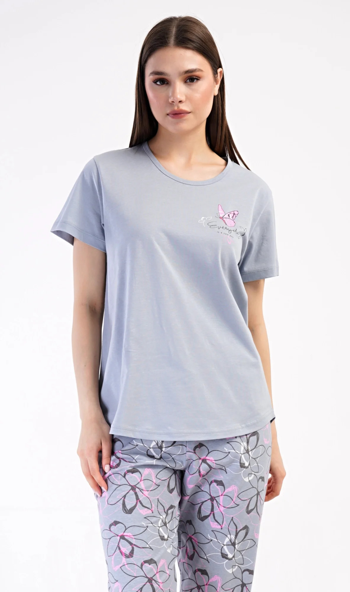 Dámské bavlněné kapri pyžamo Miana. Dámské pyžamo se skládá z trička s krátkým rukávem a tříčtvrtečních kalhot. Tričko s kulatým výstřihem zdobí na hrudi obrázek motýlka a nápis 'Everyday'. Kalhoty s potiskem květů mají v pase gumu a šňůrku na stažení, jsou bez kapes. Použitý bavlněný materiál je příjemný a poddajný na dotek.