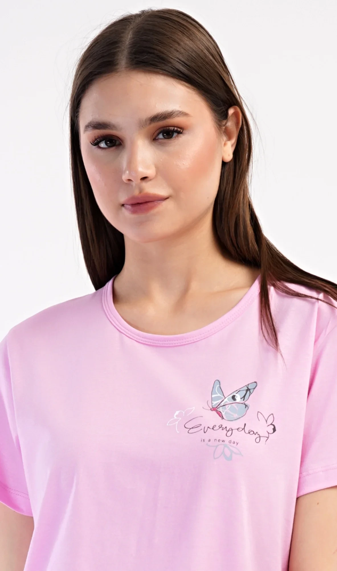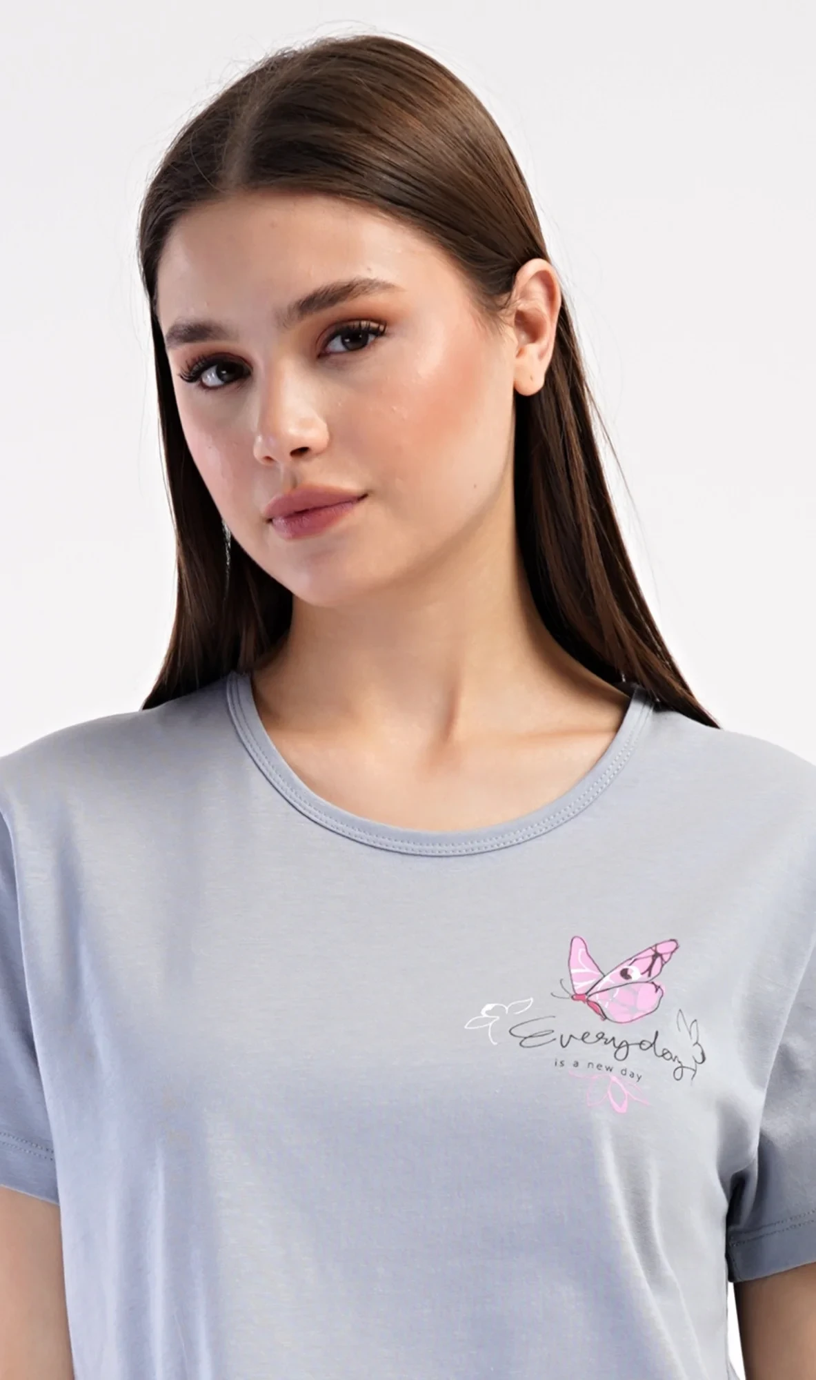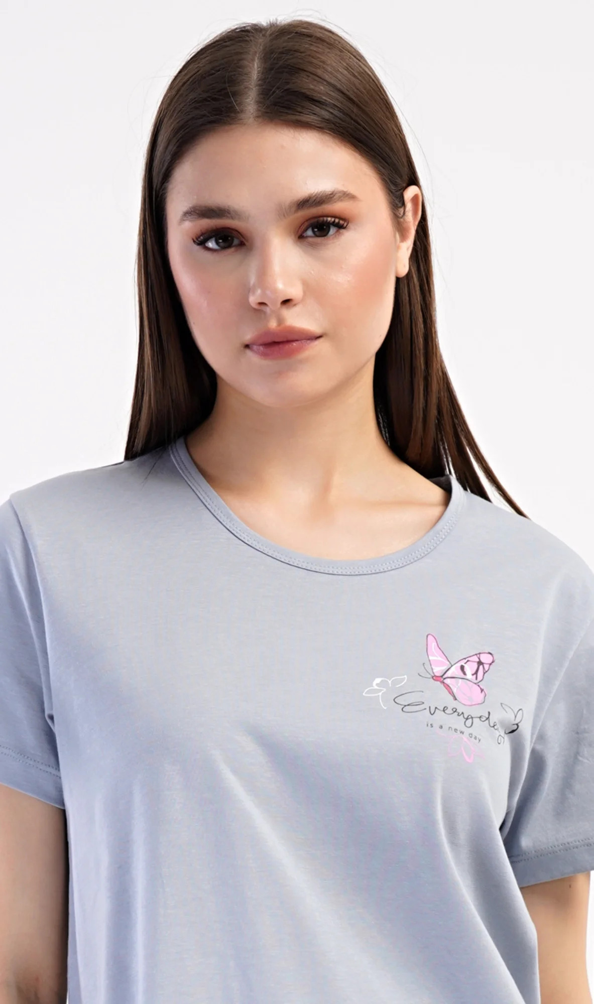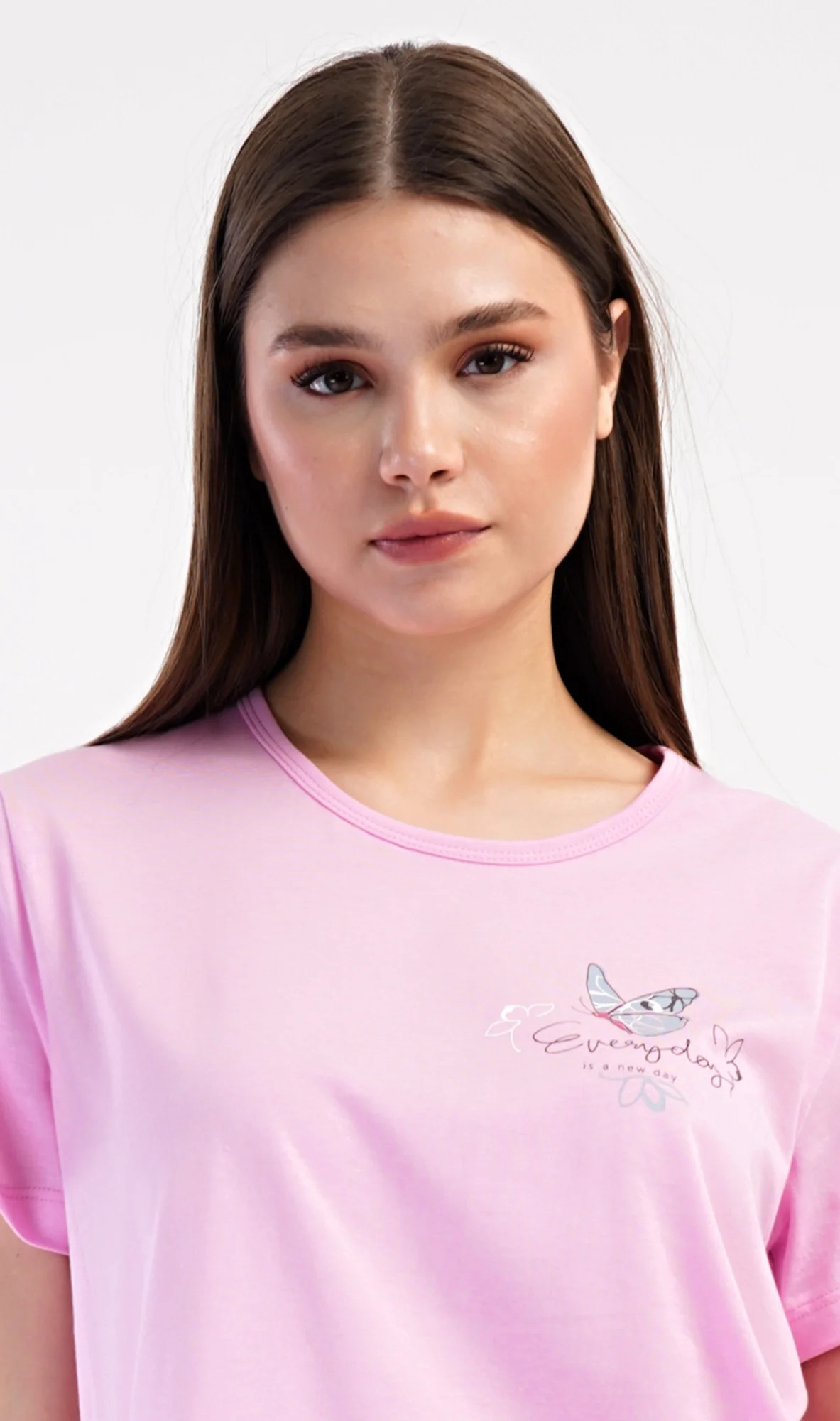 Dámské bavlněné kapri pyžamo Miana. Dámské pyžamo se skládá z trička s krátkým rukávem a tříčtvrtečních kalhot. Tričko s kulatým výstřihem zdobí na hrudi obrázek motýlka a nápis 'Everyday'. Kalhoty s potiskem květů mají v pase gumu a šňůrku na stažení, jsou bez kapes. Použitý bavlněný materiál je příjemný a poddajný na dotek.