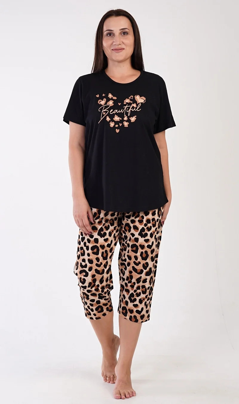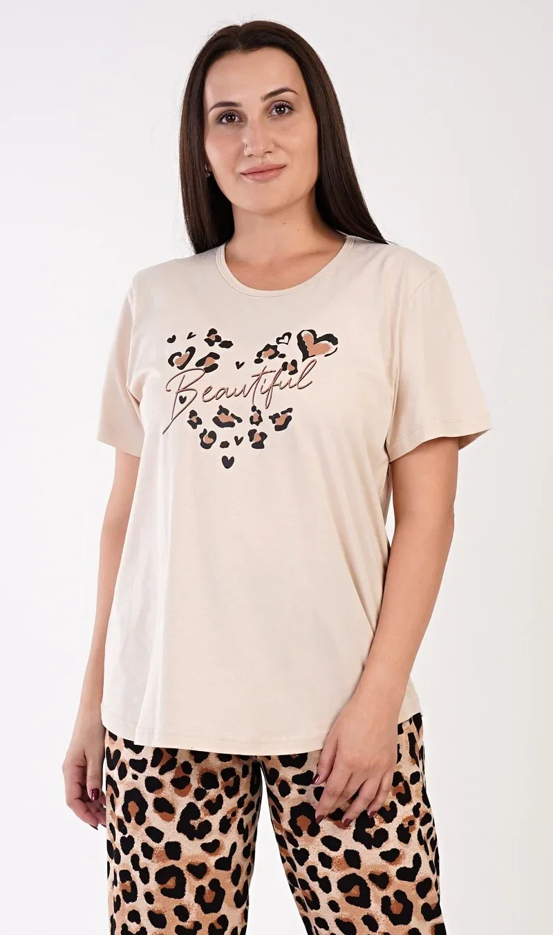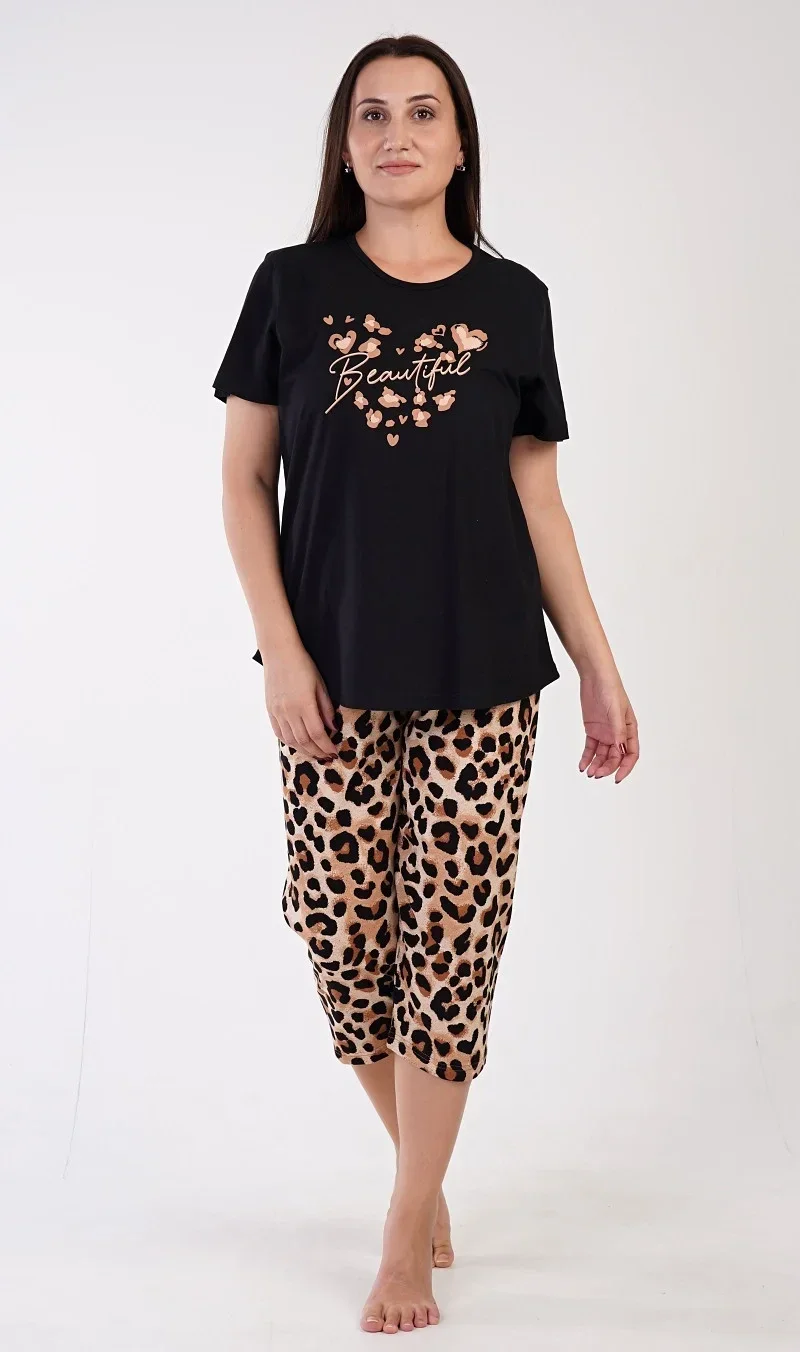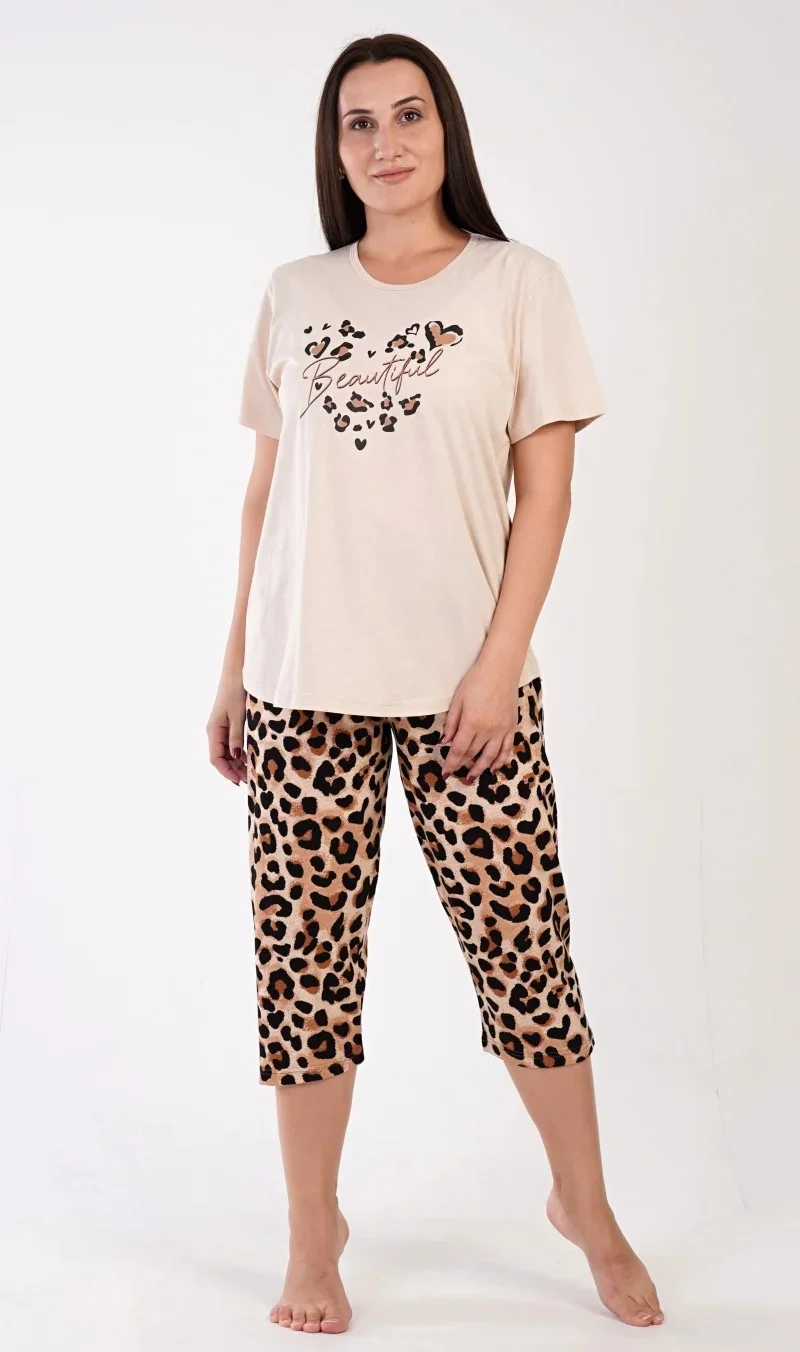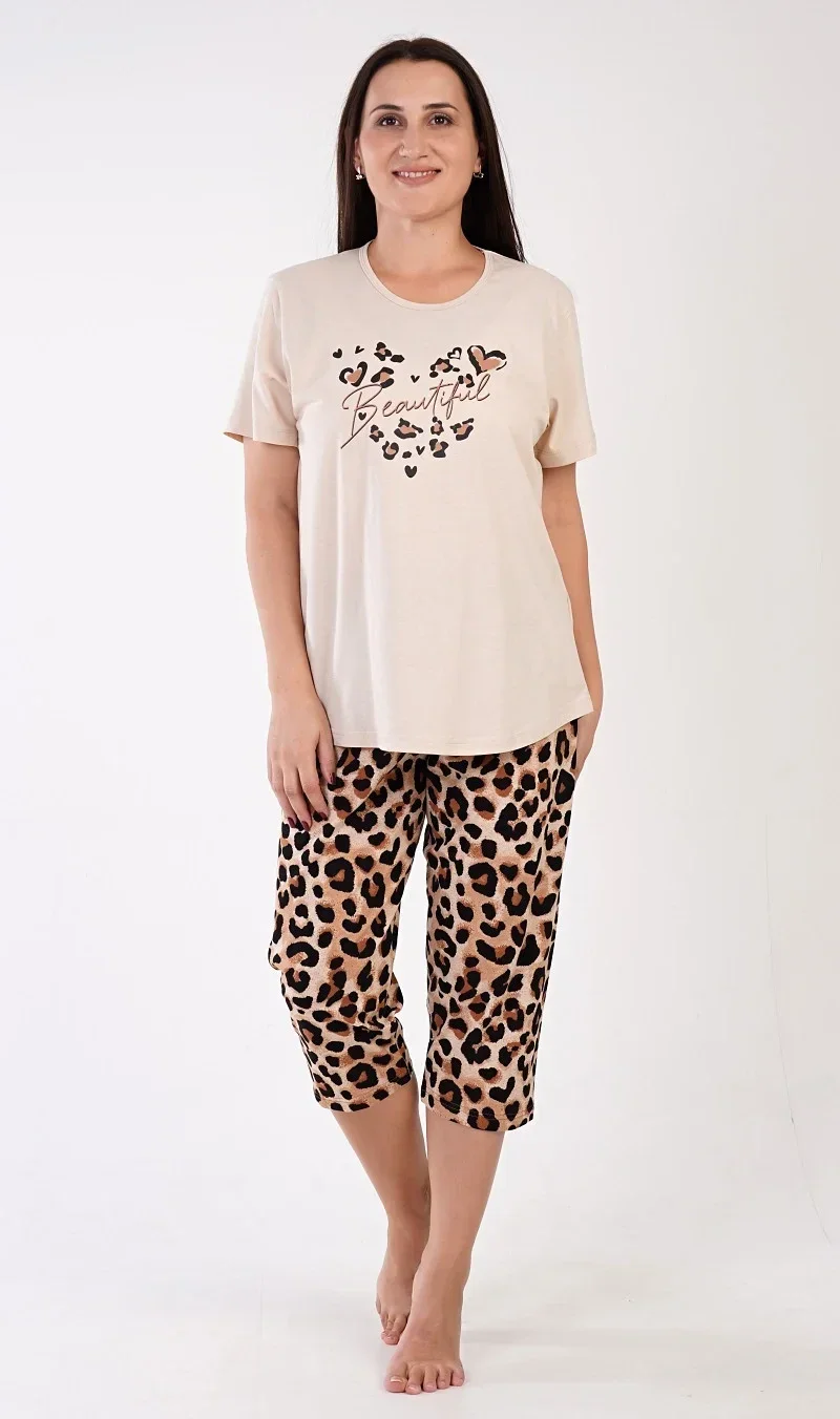 Dámské bavlněné kapri pyžamo Beautiful. Kapri pyžamo se skládá z trička s krátkým rukávem a tříčtvrtečních kalhot. Tričko s kulatým výstřihem má na hrudi potisk ve tvaru srdce a nápis 'Beautiful', kalhoty jsou potištěny leopardím vzorem. Kapri kalhoty mají v pase gumu a šňůrku na stáhnutí, nemají kapsy. Použitý materiál je příjemný a poddajný na dotek. Obsah bavlny u trička i u kalhot je 100%.