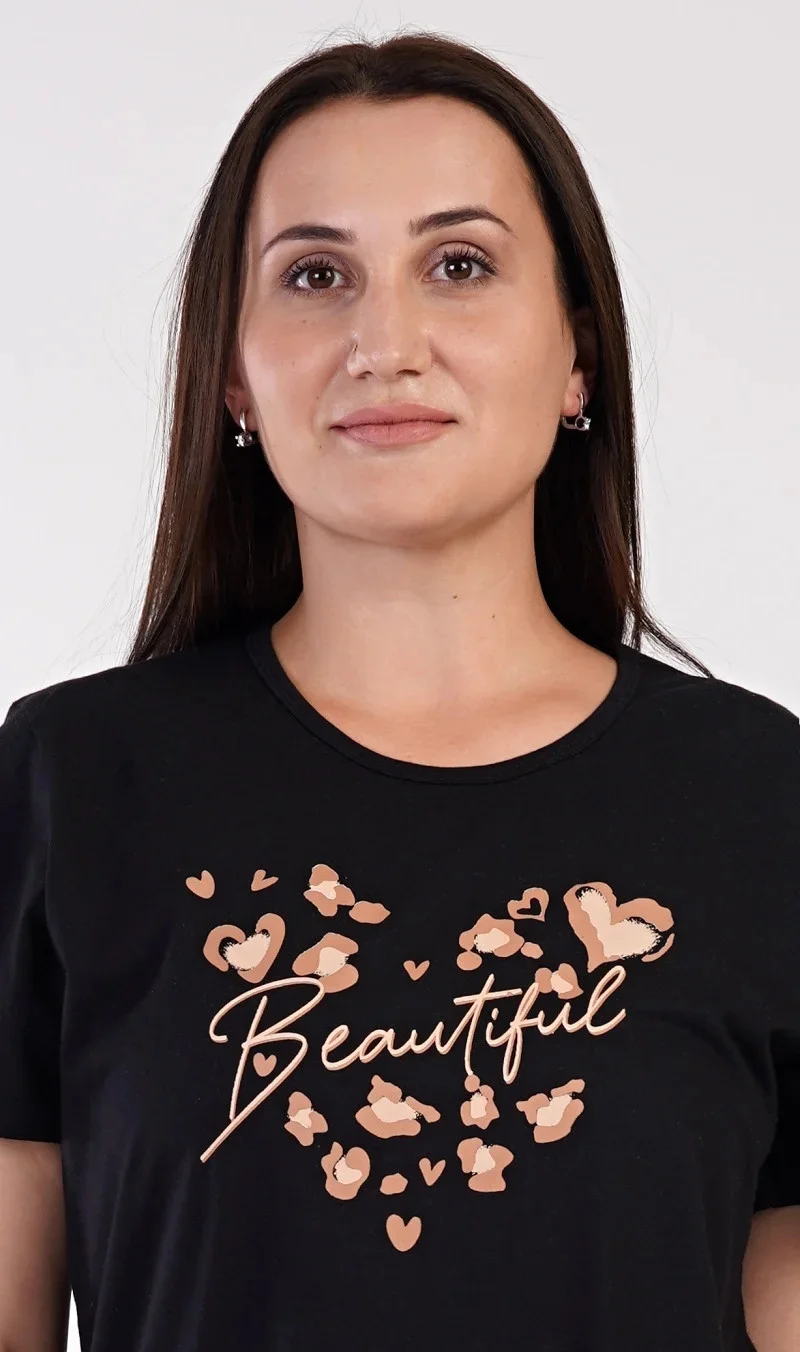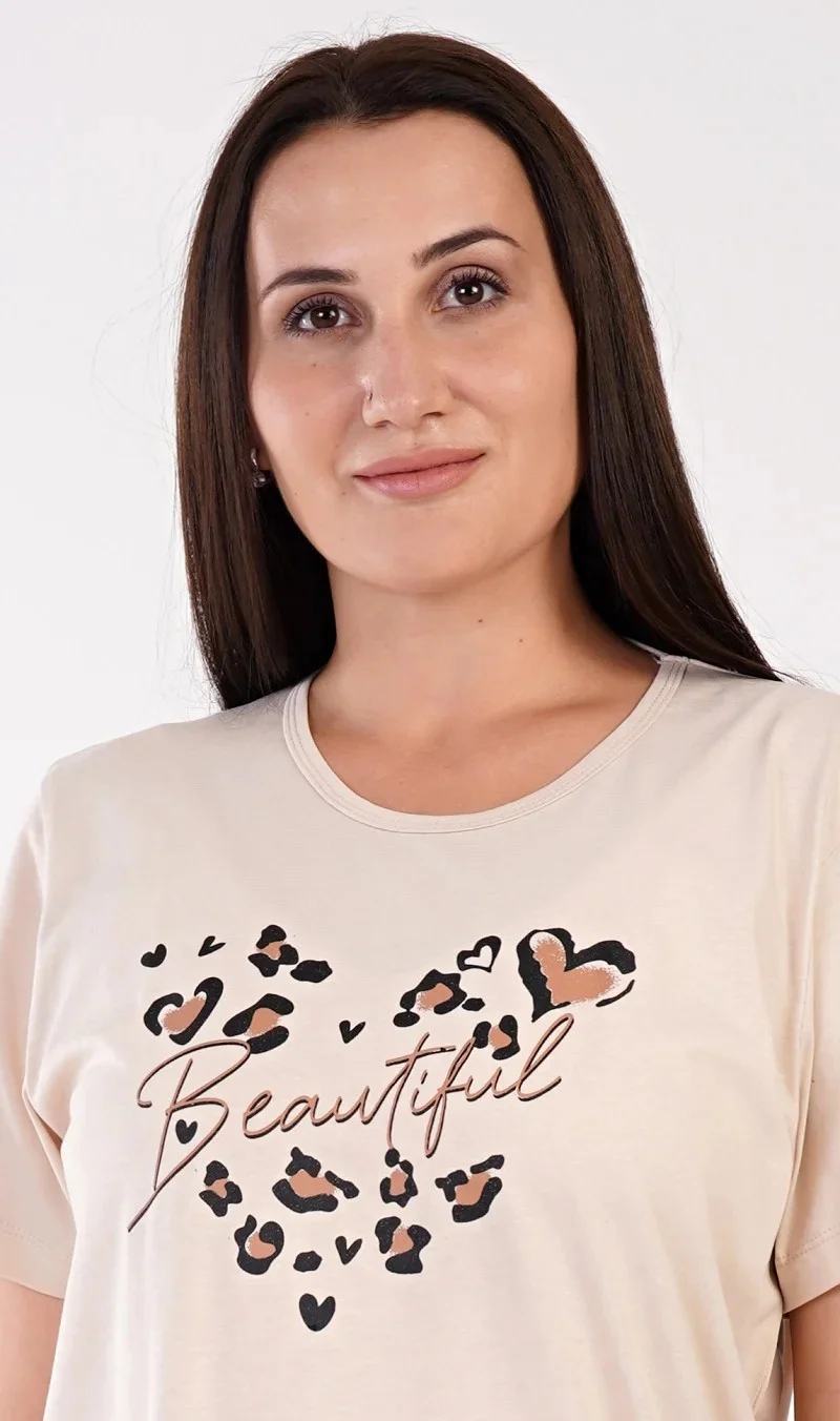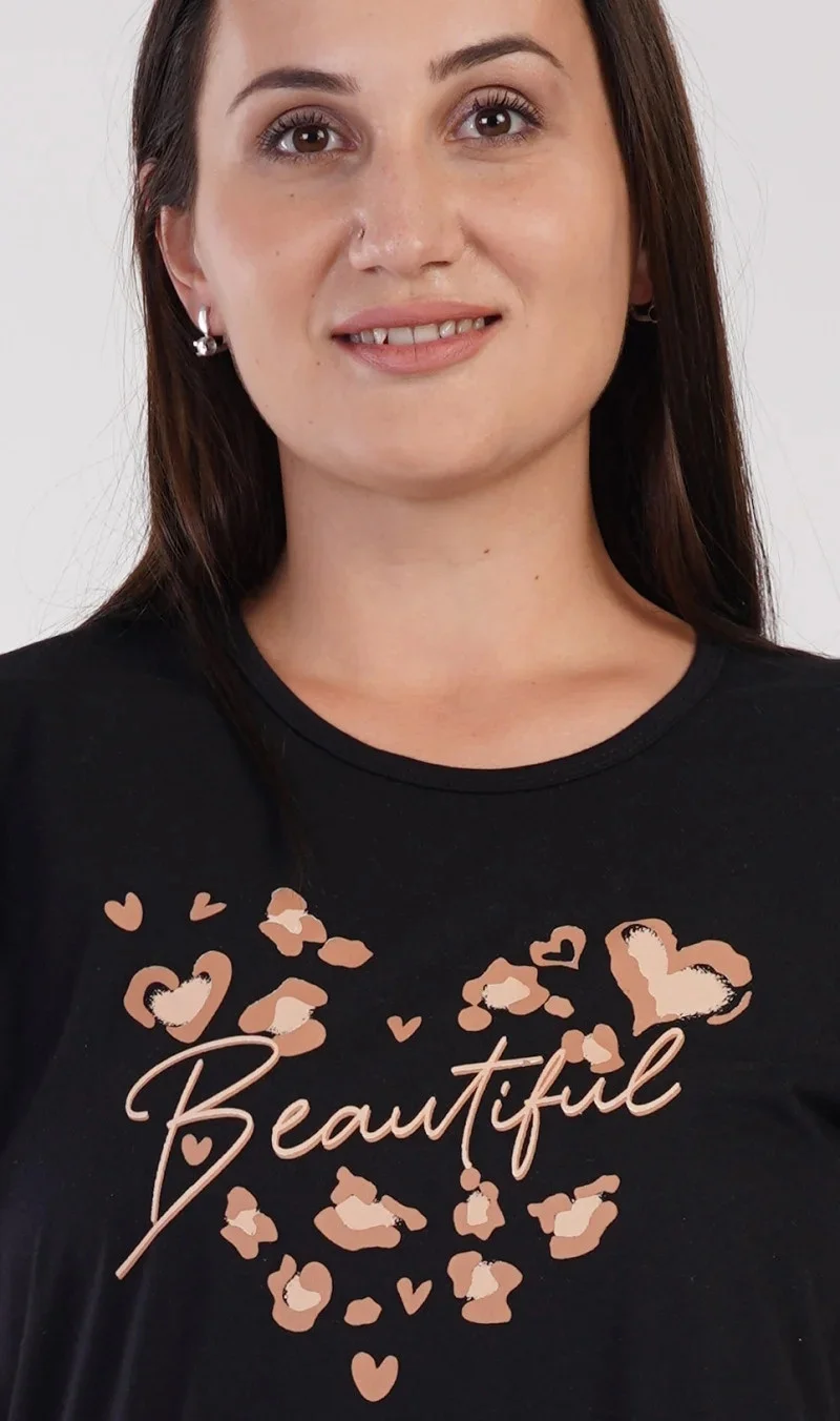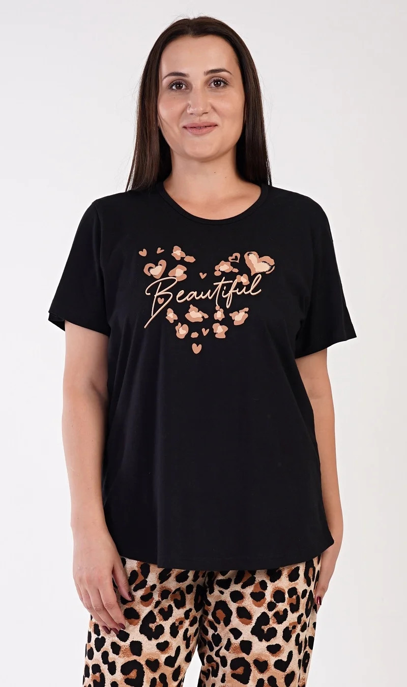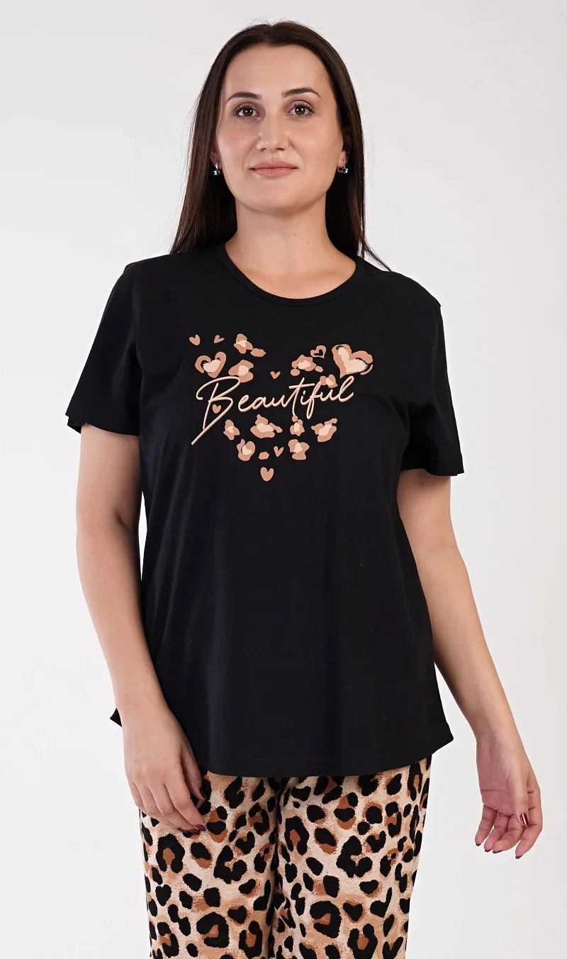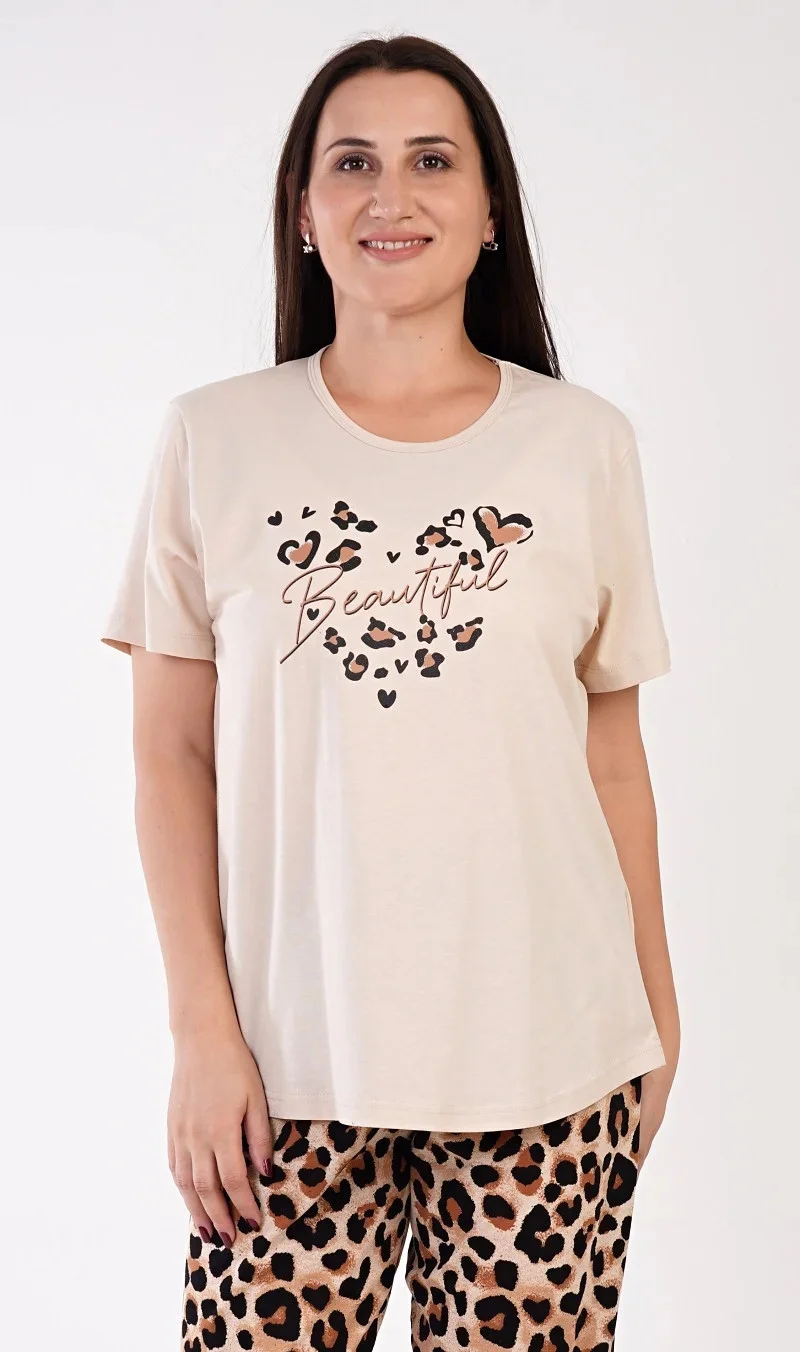 Dámské bavlněné kapri pyžamo Beautiful. Kapri pyžamo se skládá z trička s krátkým rukávem a tříčtvrtečních kalhot. Tričko s kulatým výstřihem má na hrudi potisk ve tvaru srdce a nápis 'Beautiful', kalhoty jsou potištěny leopardím vzorem. Kapri kalhoty mají v pase gumu a šňůrku na stáhnutí, nemají kapsy. Použitý materiál je příjemný a poddajný na dotek. Obsah bavlny u trička i u kalhot je 100%.