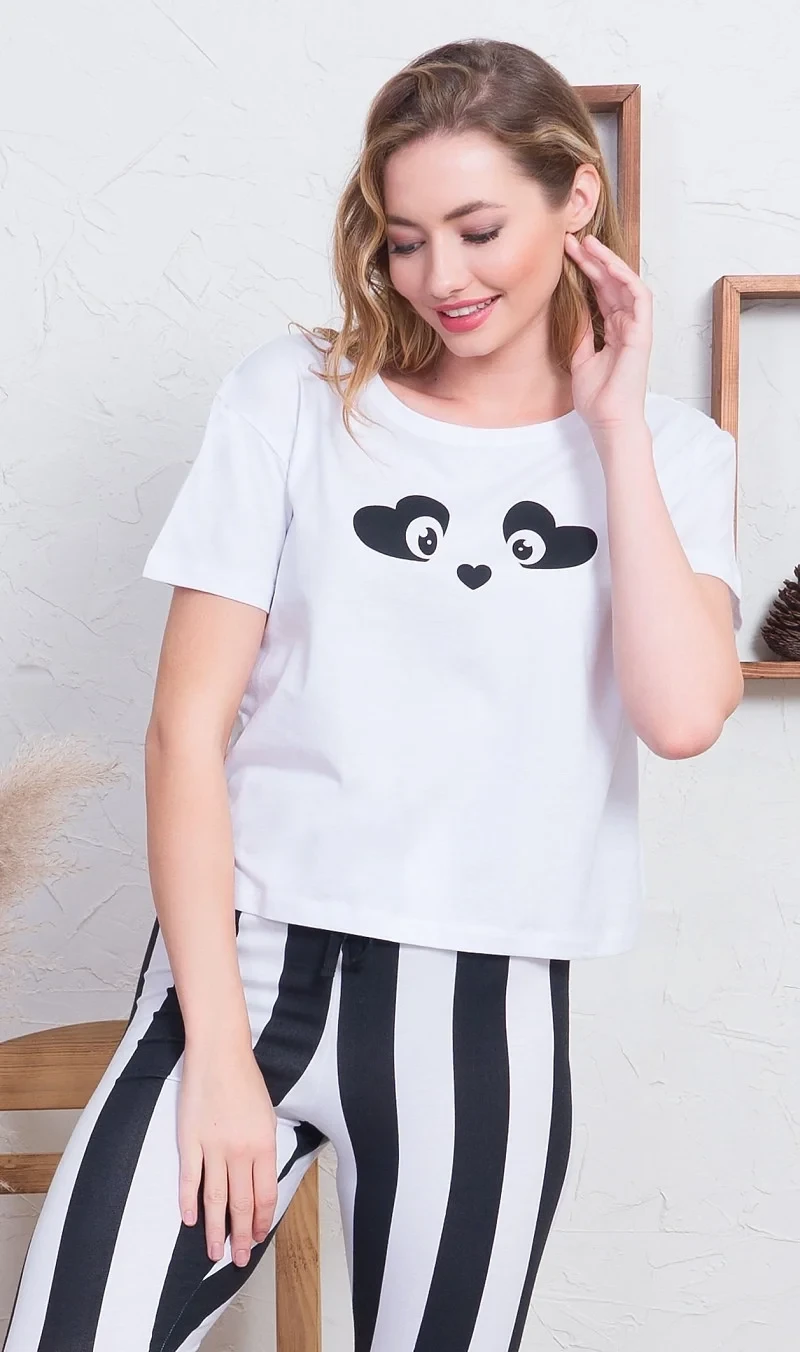 Dámské kapri pyžamo Paulína. Dámské pyžamo se skládá ze zkráceného trička s krátkým rukávem a tříčtvrtečních kalhot. Na kratším tričku je ze srdíček vytvořený roztomilý zvířecí čumáček s očima. Tričko doplňují elastické tříčtvrteční kalhoty s výrazným pruhovaným potiskem. Použitý bavlněný materiál je příjemný a poddajný na dotek.