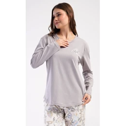 Dámské bavlněné dlouhé pyžamo Alex. Dámské pyžamo se skládá z trika s dlouhým rukávem a dlouhých kalhot. Triko je jednobarevné, zdobené na hrudi drobným obrázkem listu. Motiv listů se opakuje i na kalhotách, které mají v pase gumu a šňůrku na stažení, nemají kapsy. Použitý bavlněný materiál je poddajný a příjemný na dotek.