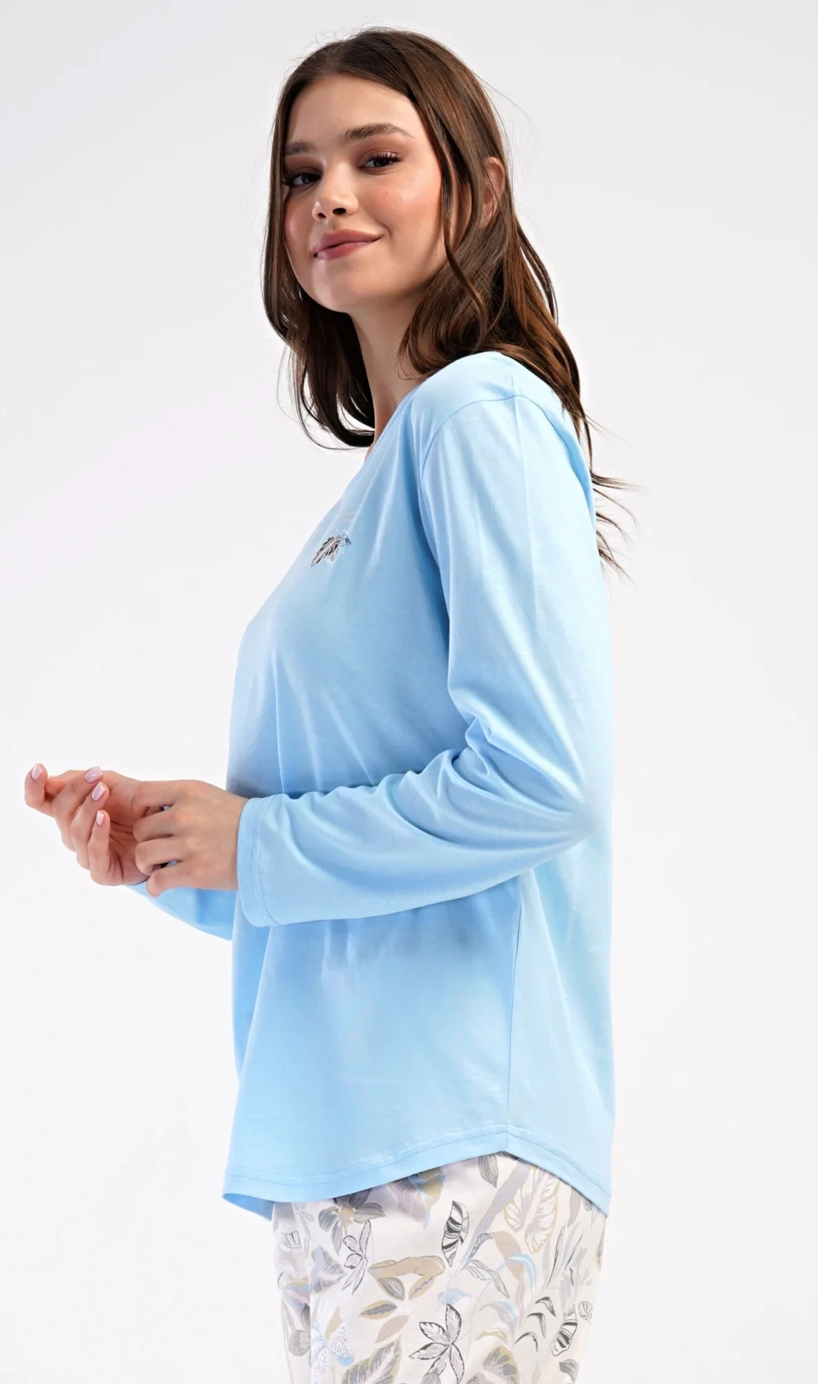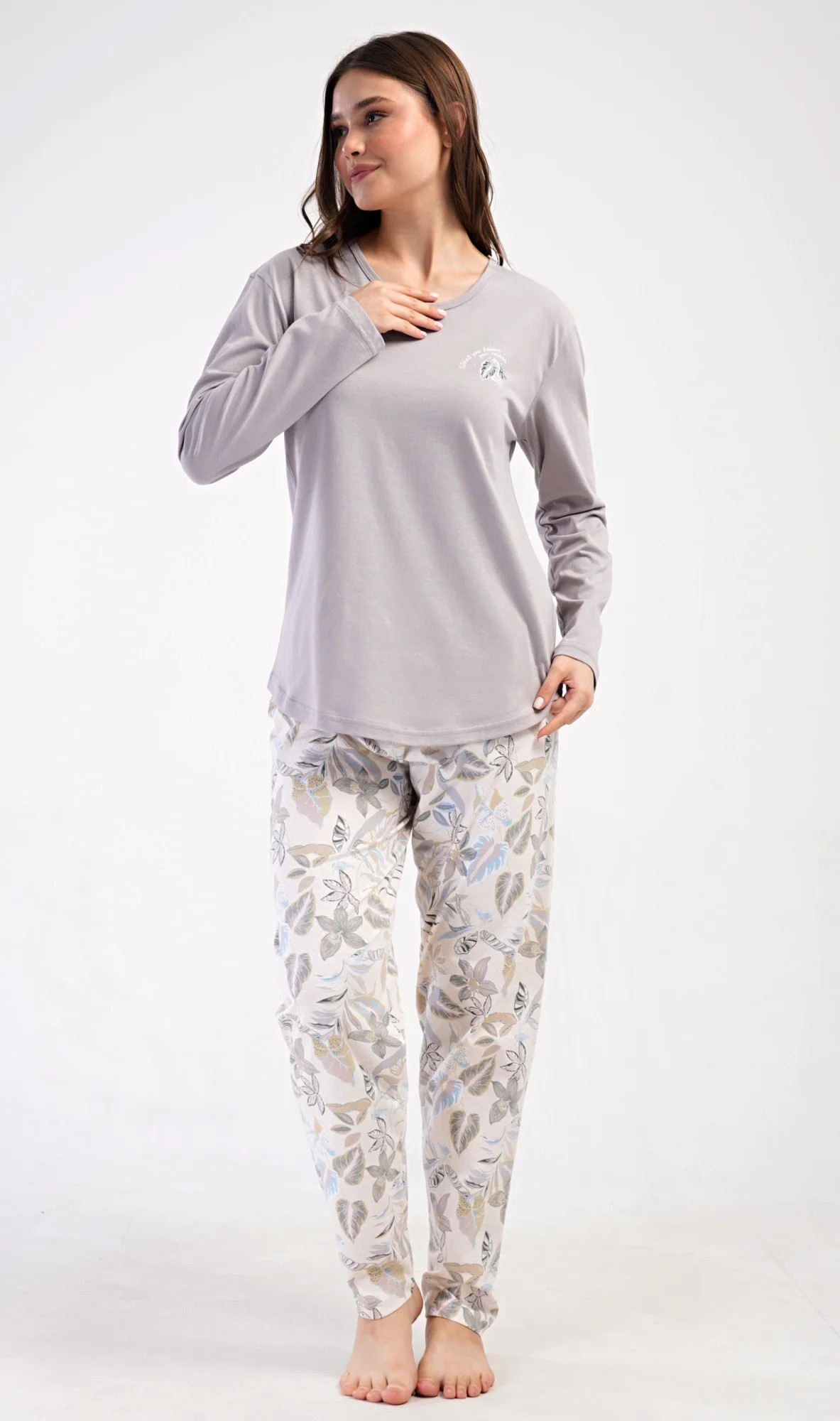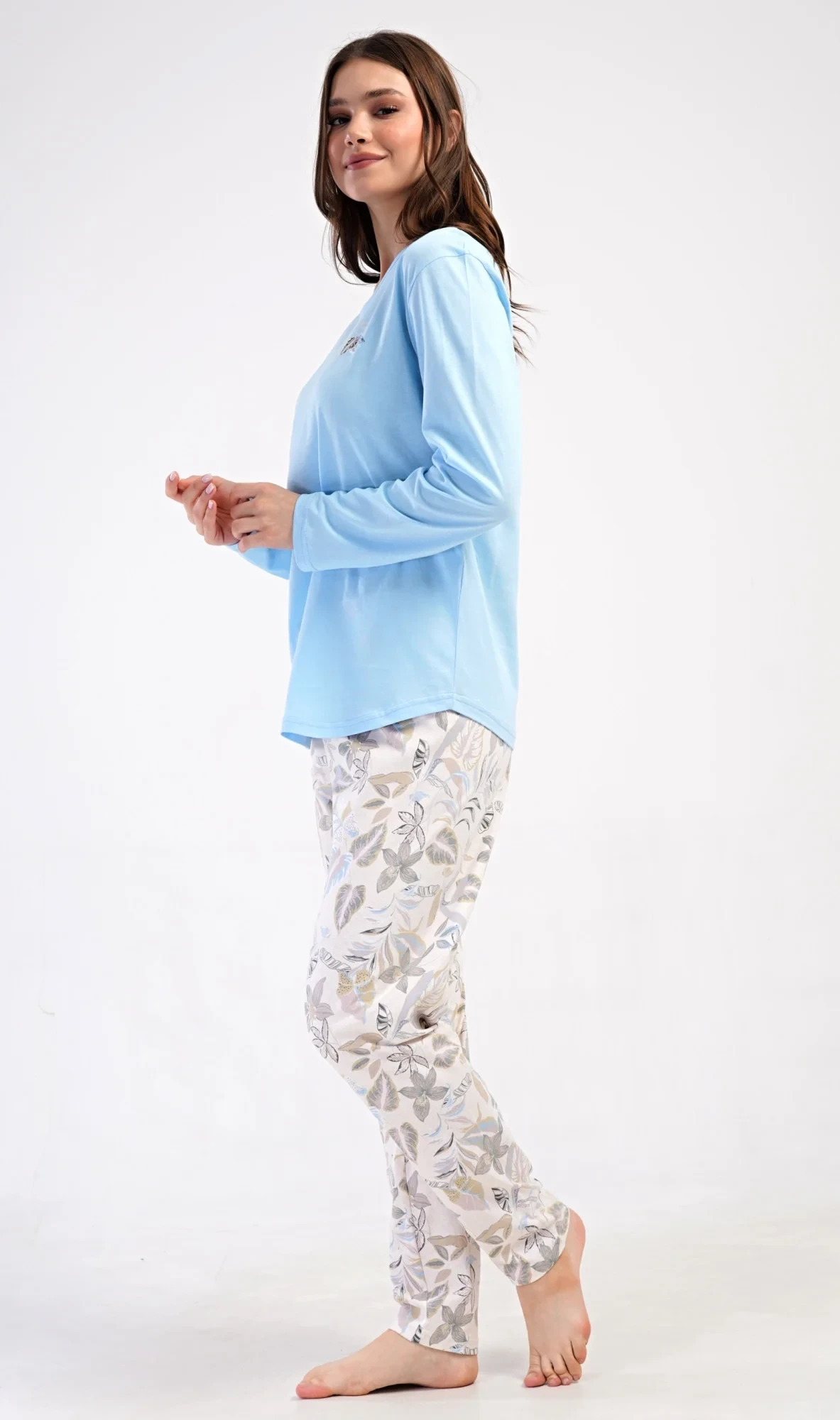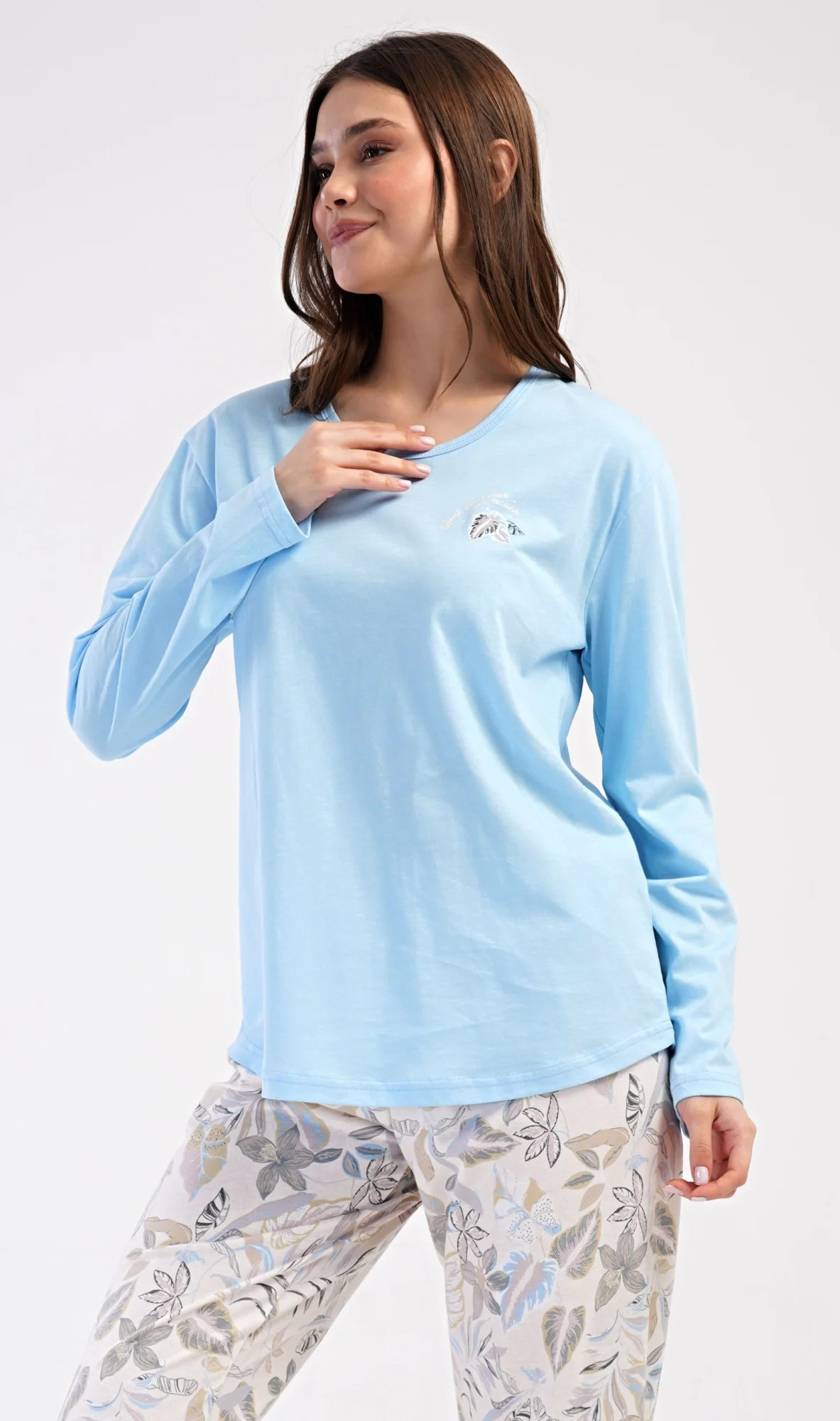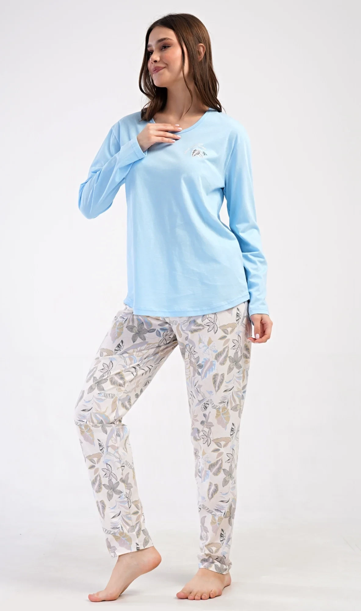 Dámské bavlněné dlouhé pyžamo Alex. Dámské pyžamo se skládá z trika s dlouhým rukávem a dlouhých kalhot. Triko je jednobarevné, zdobené na hrudi drobným obrázkem listu. Motiv listů se opakuje i na kalhotách, které mají v pase gumu a šňůrku na stažení, nemají kapsy. Použitý bavlněný materiál je poddajný a příjemný na dotek.