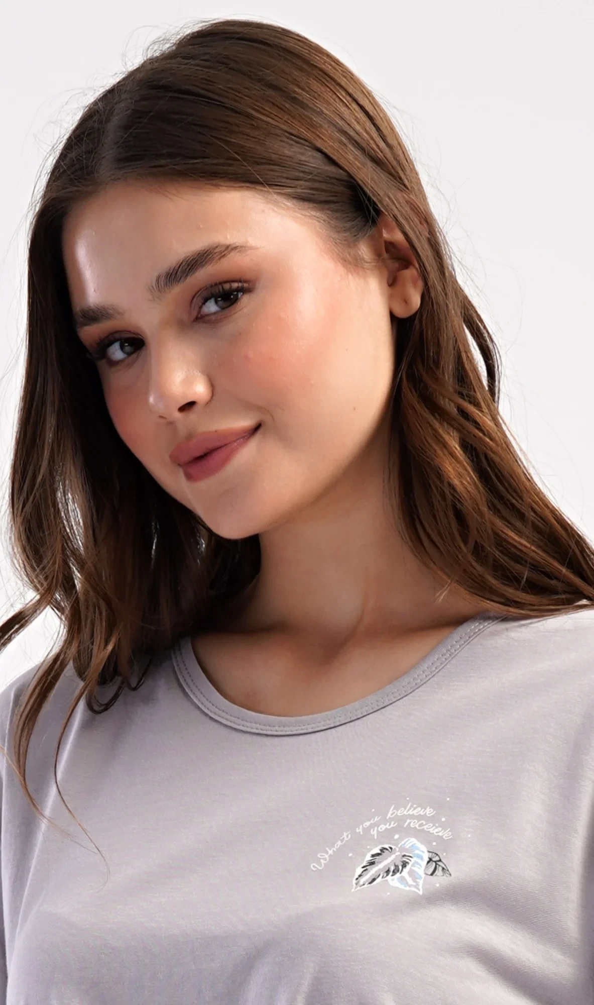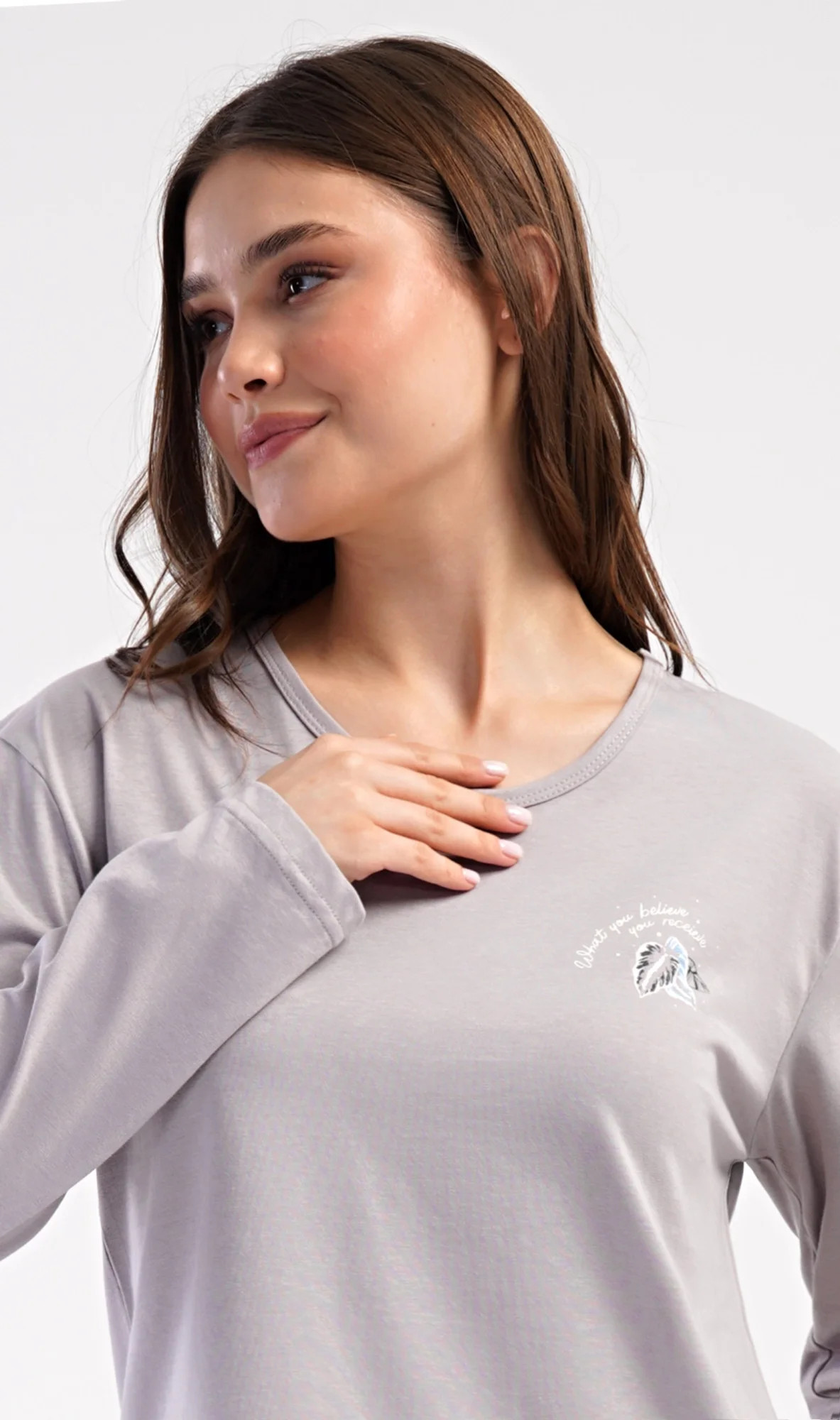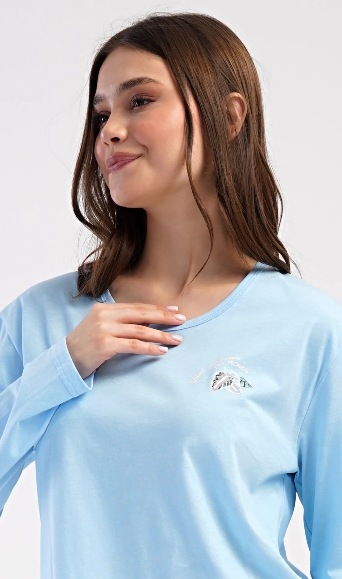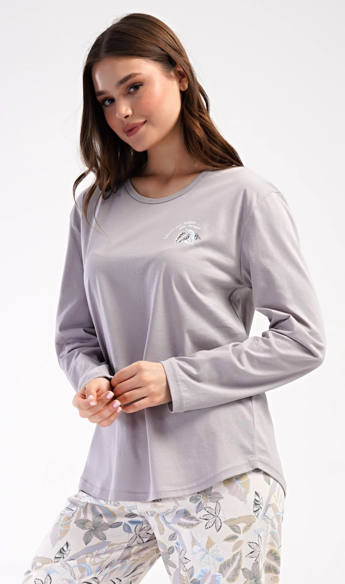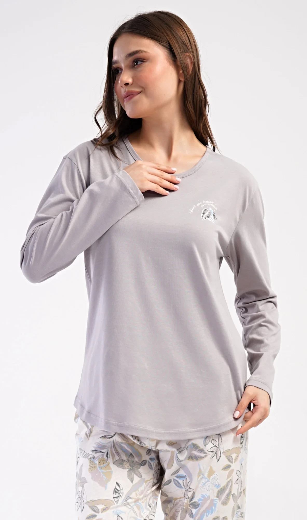 Dámské bavlněné dlouhé pyžamo Alex. Dámské pyžamo se skládá z trika s dlouhým rukávem a dlouhých kalhot. Triko je jednobarevné, zdobené na hrudi drobným obrázkem listu. Motiv listů se opakuje i na kalhotách, které mají v pase gumu a šňůrku na stažení, nemají kapsy. Použitý bavlněný materiál je poddajný a příjemný na dotek.