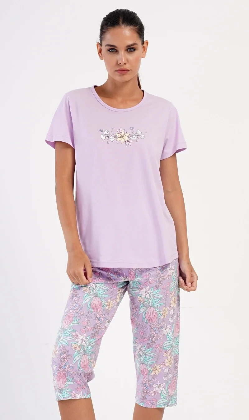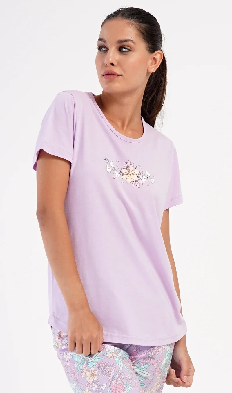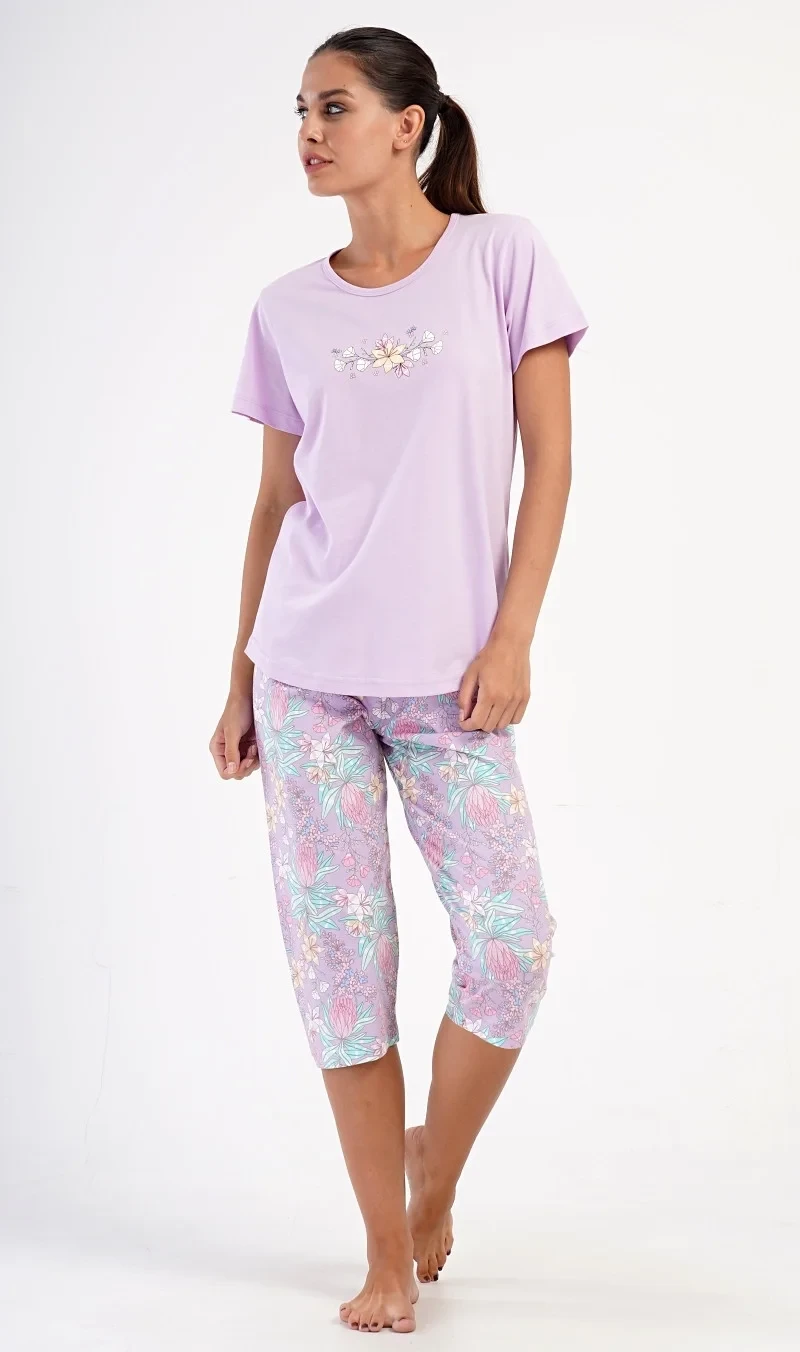Dámské bavlněné kapri pyžamo Viola. Dámské pyžamo se skládá z trička s krátkým rukávem a tříčtvrtečních kalhot. Tričko s kulatým výstřihem má na hrudi obrázek květů. Tento motiv se opakuje i na kalhotách, které mají v pase gumu a šňůrku na stažení, jsou bez kapes. Použitý bavlněný materiál je příjemný a poddajný na dotek.
