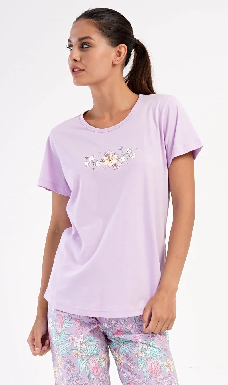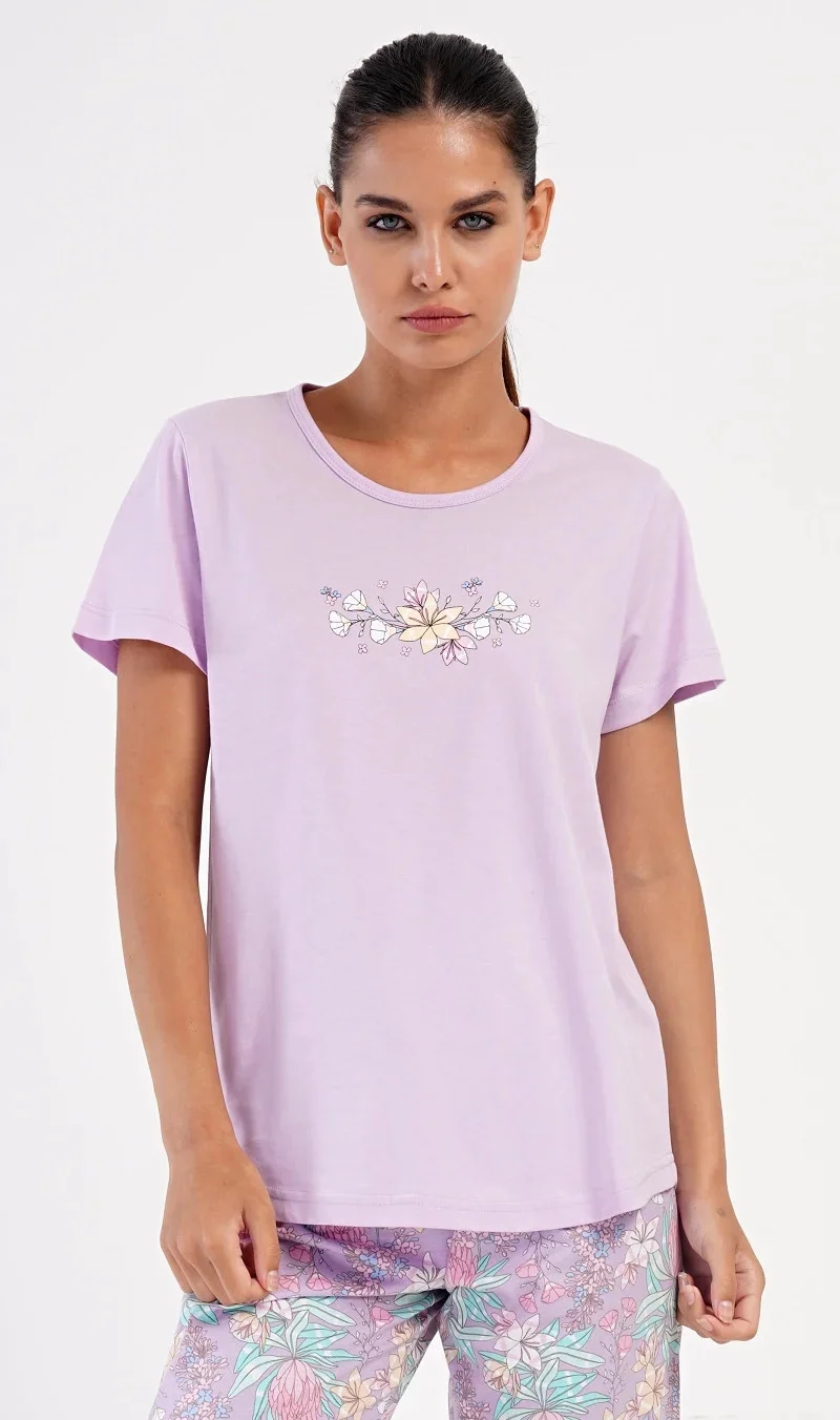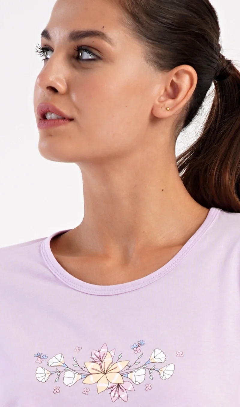 Dámské bavlněné kapri pyžamo Viola. Dámské pyžamo se skládá z trička s krátkým rukávem a tříčtvrtečních kalhot. Tričko s kulatým výstřihem má na hrudi obrázek květů. Tento motiv se opakuje i na kalhotách, které mají v pase gumu a šňůrku na stažení, jsou bez kapes. Použitý bavlněný materiál je příjemný a poddajný na dotek.