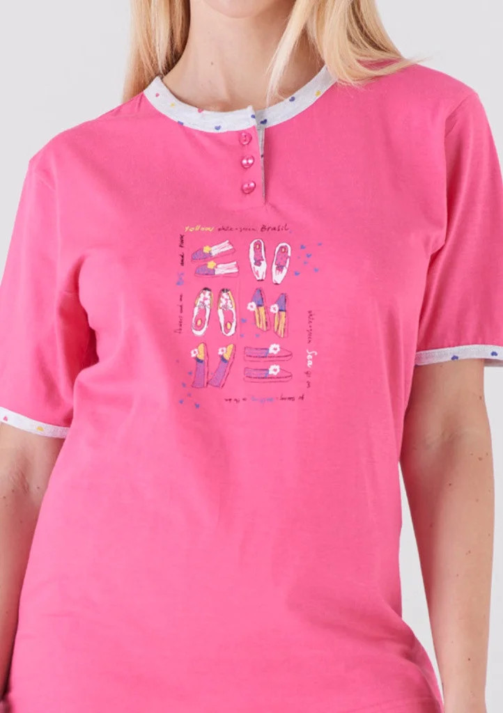 Dámské letní pyžamo italské značky Karelpiu. Pyžamo se skládá ze dvou dílů. Tričko má krátký rukáv, kulatý výstřih s légou a třemi knoflíky. Tričko je jednobarvené s potiskem uprostřed a barevným lemem kolem krku a na rukávech. Šortky mají po celé ploše potisk barevných srdíček, jsou bez kapes. V pase je všitá pohodlná pružná guma. Pyžamo je z lehké příjemné bavlny, ideální na letní dny. Pyžamo je ve dvou barevných variantách.
