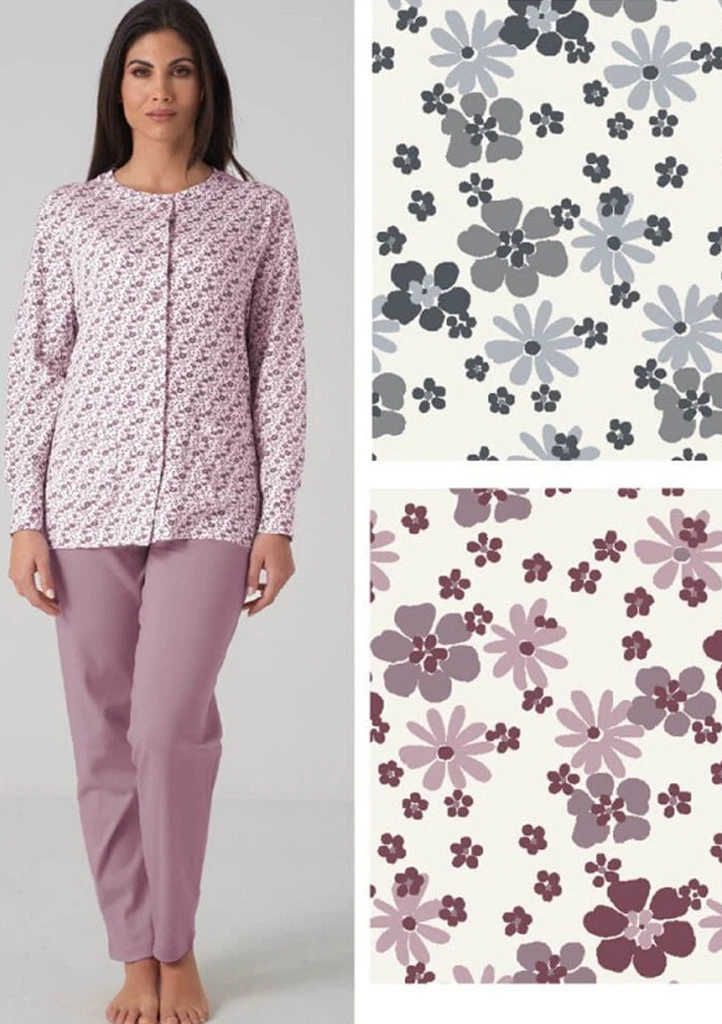 Dámské pyžamo KarelPiu zaujme jemným květinovým vzorem v elegantních, tlumených tónech a pohodlným střihem vhodným pro každodenní nošení i odpočinek. Horní díl s dlouhým rukávem má klasický zapínací vzhled a je vyroben z příjemného, měkkého materiálu, který je šetrný k pokožce a zajišťuje komfort po celou noc. Jednobarevné dlouhé kalhoty v harmonickém odstínu pyžamo krásně doplňují a vytvářejí sladěný celek. Ideální volba pro ženy, které hledají kombinaci pohodlí, kvality a nadčasového designu od značky KarelPiu. Pyžamo je dostupné v šedé a růžové barvě.