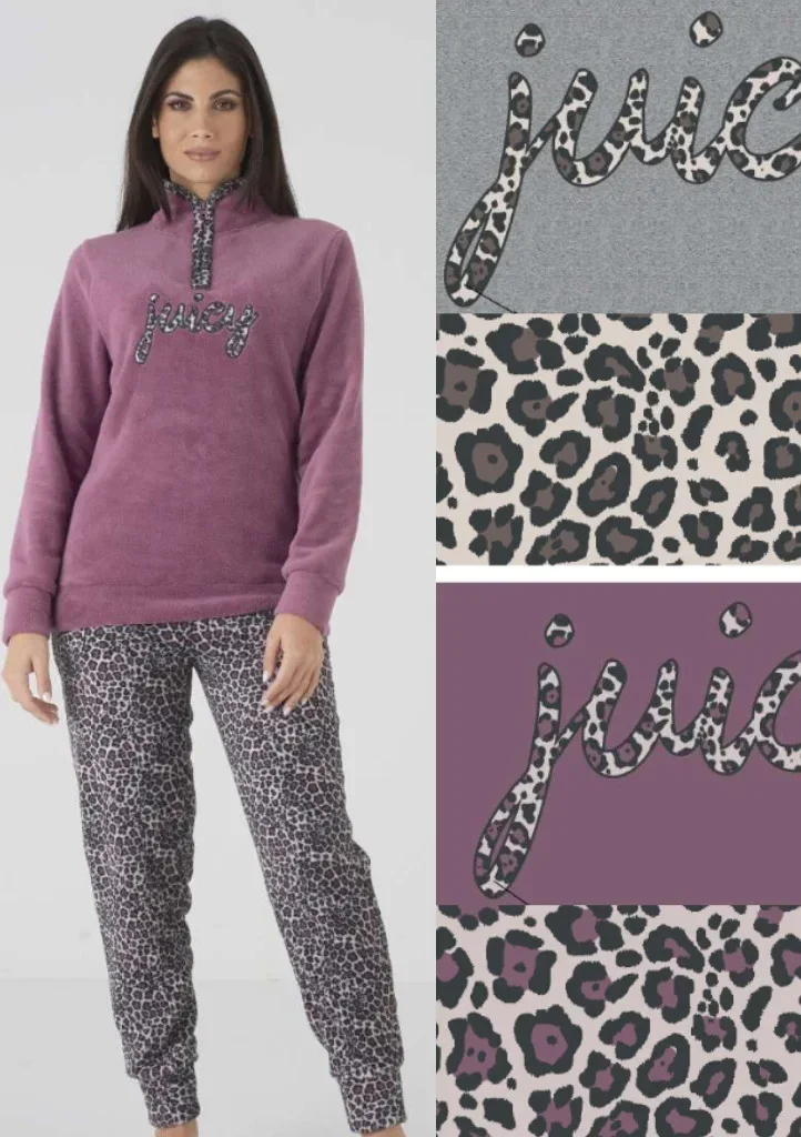 Dámské pyžamo od italské značky Karelpiu. Měkké, jemné a hřejivé pyžámko je z velmi příjemného materiálu. Vrchní díl má stojáček a zapínání u krku za zip. Rukávy jsou ukončeny jemným úpletem. Kalhoty mají v pase všitou pohodlnou gumu.