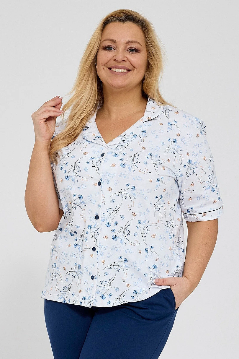 Vrchní část soupravy tvoří tričko s krátkým rukávem, které zdobí decentní barevný květinový potisk. Model s límečkem a zapínáním na knoflíky dodává pyžamu elegantní, nadčasový charakter a zároveň zajišťuje pohodlí při používání.
